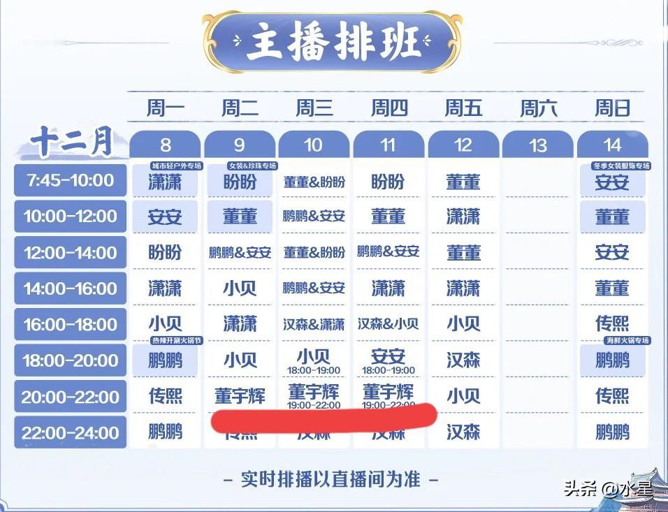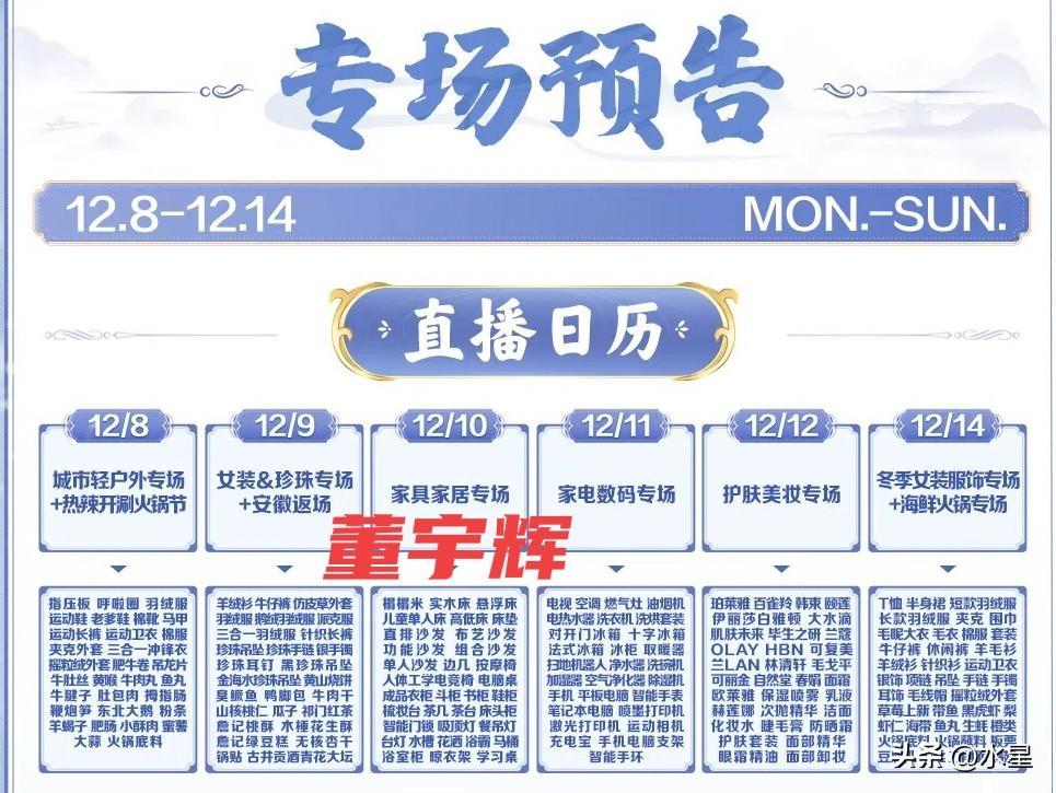 与辉同行一周排班表发布 连着三天都有董宇辉的直播 而且有两天还是从19点开始播 10日和11日是双十二家居家电专场 不过一般这种专场 彪哥是没空跟大家聊天的 好在9日是安徽好物返场 可以唠唠嗑,看他耍耍宝[大笑] 12月13日与辉同行停播一天 因为这天是国家公祭日 为悼念南京大屠杀遇难同胞及所有在日本侵华战争中牺牲的同胞 每逢遇到重大纪念意义的日子 董宇辉都会停播以示重视 每位国人也都应该牢记