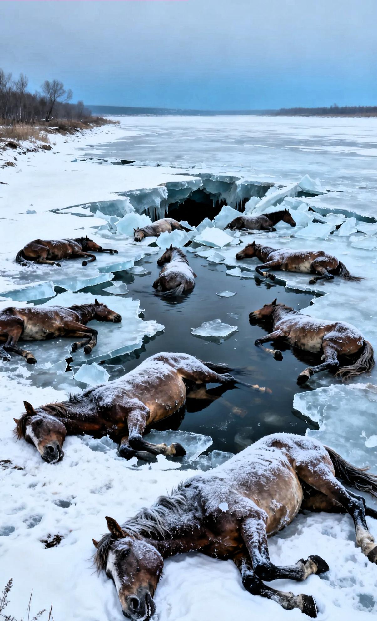 极寒裹住黑龙江东风水库的冰面,13匹马凑到冰边饮水,刚站定没多久,冰面突然发出“咔嘣”的脆响,接着就塌了一块。 马群没来得及躲开,一下子全掉了下去,冰冷的湖水很快就把它们裹住,没过多久,水面又冻上了,13匹马就那么僵在冰里。 马主人是两天后才找到这里的。老人70多岁了,平时靠这些马拉货、帮着干些农活,养了足足十年。他在水库边找了半天,才看见冰面下的马,当时就蹲在冰上,半天没动。这些马算下来能值30多万,是家里很重要的收入来源,如今没了,对他打击不小。 邻居们知道后,都拿着凿子、锤子过来帮忙。冰面又厚又硬,几个人轮流凿了好长时间,才凿开一个口子。捞上来的马早就没了气息,身子冻得硬邦邦的,鬃毛上还挂着冰碴。马主人在旁边看着,红着眼圈,没说太多话,只是偶尔叹口气,念叨着“往后咋弄”。 搞养殖本就不容易,冬天更难,冰灾、寒潮都是常见的风险。但对很多散户养殖户来说,防范风险的办法不多,也很少给牲畜买保险,总觉得意外离自己远,可真遇上了,只能自己承担损失。 这13匹马的事,看着是个意外,其实也是不少农村养殖户的真实情况。他们把心血都放在牲畜身上,一场意外就可能让多年的积累白费。真心希望能有人多给他们讲讲冬季养殖的防范知识,也希望养殖保险能更普及些,给他们多一份保障。