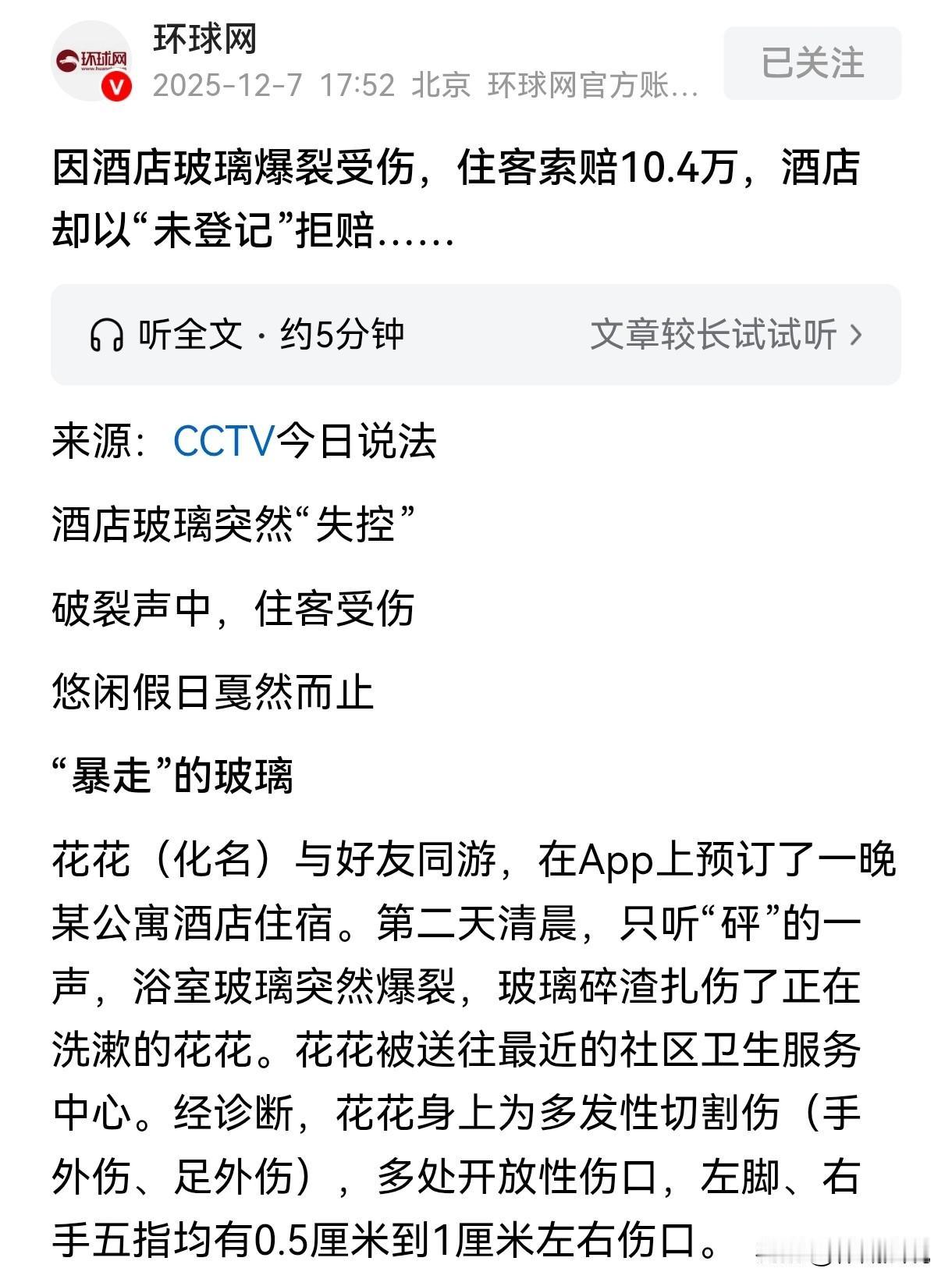 广东珠海,女子在网上预定了一家酒店,入住时,登记了好友的信息。次日清晨,她在洗漱时,浴室玻璃突然爆裂,玻璃碎渣扎伤了女子,导致女子身上多处割伤,清创手术后,医生说可能会留疤,并建议女子全休一个月。半年后,女子再去检查,要做抗疤痕处理,女子认为自己是在酒店受伤的,要求酒店赔偿医疗费、误工费等104000元。可酒店却说女子没有办理住宿登记,属于擅自留宿,受伤后果应自行承担,并且他们怀疑是女子自己将玻璃撞碎的,而非玻璃自爆,他们不用赔偿。可法院却给出了不一样的看法。 花花一直盼着和好友一起出去旅行,出发前,她在网上预定了一家看起来还不错的酒店。 入住酒店当天,两人舟车劳顿,有些疲惫,简单收拾一下就早早休息了。 次日清晨,花花去浴室洗漱,可就在她洗漱的过程中,意外突然发生了。 只听“砰”的一声巨响,浴室的玻璃毫无征兆地爆裂开来,无数锋利的玻璃碎片像子弹一样四处飞溅,花花根本来不及躲避,瞬间就被扎得浑身是伤。 她惊恐地发出惨叫,只觉得身上到处都火辣辣地疼。 好友听到动静后,冲了过来,看到眼前浑身是血、狼狈不堪的花花,急忙联系了酒店前台,之后花花被送往社区医院治疗。 经诊断,花花身上为多发性切割伤,多处开放性伤口,左脚和右手五指受伤更严重,有0.5厘米到1厘米左右的伤口,情况十分糟糕,医生为她实施了伤口清创缝合术。 清理完后,医生告诉花花,由于伤口较多且形状不规则,术后可能会出现疤痕形成、玻璃异物残留等风险,并让她一定要定期换药,预防感染,还建议有人陪护,全休一个月。 看着自己身上的纱布,花花觉得又疼又委屈,她怎么也没想到,一次好好的旅行,会变成这样一场噩梦。 接下来的一段时间里,花花一直按照医生的嘱咐进行治疗,可身上的疤痕一直没退,每次看到镜子里的自己,她都觉得特别难受。 半年后,花花再次去医院就诊,医生建议她进行抗疤痕处理。 酒店虽然为花花垫付了前期的治疗费用,但是对于后续抗疤痕治疗的费用,酒店并未承担,花花觉得自己是在酒店受伤的,酒店对自己有安全保障义务,应当赔偿自己的损失。 可双方并未谈拢,花花一纸诉状,将酒店告上了法庭,要求酒店赔偿医疗费、抗瘢痕治疗费用、交通费、误工费等共计104000元。 面对花花的诉求,酒店方却认为他们没有责任,他们提出了自己的3个反驳意见: 1、他们认为客人在办理入住时,依据“一人一证”的原则,客人应当办理住宿登记,才是他们酒店的住客,可花花和好友入住时,酒店登记的只有她好友的信息。 酒店认为花花在未经他们允许的情况下,擅自留宿酒店,其受伤的后果应当由其自己承担。 2、他们对花花提出的浴室玻璃自爆的说法提出了质疑。 酒店认为他们的淋浴间设施都是经过相关部门严格检验合格后才使用的,不存在质量上的问题,根据玻璃散落的状况来看,他们认为可能是花花在洗漱时,没站稳,不小心将玻璃撞碎,才导致她自己受了伤。 3、他们已经为花花垫付了部分医疗费用,已经尽到了责任,剩余费用不应由他们来承担。 双方各执一词,互不相让,法院会如何审理判决呢? 法院认为,花花通过APP预定了酒店房间,并且支付了房款,之后和好友实际入住了该酒店,这就说明花花和酒店之间已经形成了旅店服务合同关系。 根据合同约定,花花支付房费,酒店应当为他们提供符合保障人身安全、财产安全的住宿环境。 可花花在入住酒店后,却因浴室玻璃爆裂受了伤,她是因酒店设施受的伤,酒店存在责任。 《民法典》第1198条规定:宾馆、商场、银行、车站、机场、体育场馆、娱乐场所等经营场所、公共场所的经营者、管理者或者群众性活动的组织者,未尽到安全保障义务,造成他人损害的,应当承担侵权责任。 酒店作为住宿经营者,有责任保障酒店内各项设施的使用安全。 浴室玻璃爆裂导致花花受伤,酒店没有尽到安全保障义务,应当对花花受伤产生的损失承担赔偿责任,考虑到酒店已经为花花垫付了部分医疗费用这一情况。 最终,经过核算各项费用,法院判决扣除酒店已经支付的费用后,还应赔偿花花13900元。 酒店不服,提起上诉,二审维持了原判。 对于消费者来说,外出住宿,一定要注意自身安全,入住后先检查一下房间内的设施是否存在安全隐患,发现问题,要及时与酒店沟通解决。 而对于酒店等经营场所来说,要加强对设施设备的日常检查和维护,确保为消费者提供一个安全、舒适的消费环境。 出现问题后,要有担当,而不是以各种理由推脱自己的责任。 文中人物用化名。