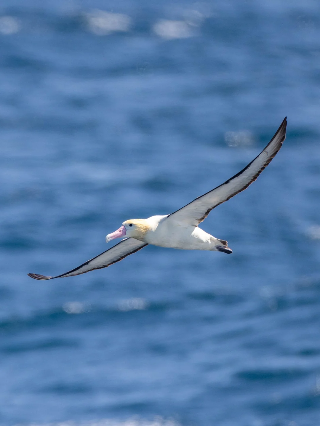 信天翁是在海面上翱翔滑行飞行的高手,就像是海面上的芭蕾舞者,能够长时间远距离的在海洋上飞翔,非常的自由和优雅。短尾信天翁和同区域分布的其他信天翁相比,特征非常明显,他们成鸟有着粉红色的大,头部和颈部带着淡黄色的色调,而翅膀上有独特的白色斑块。