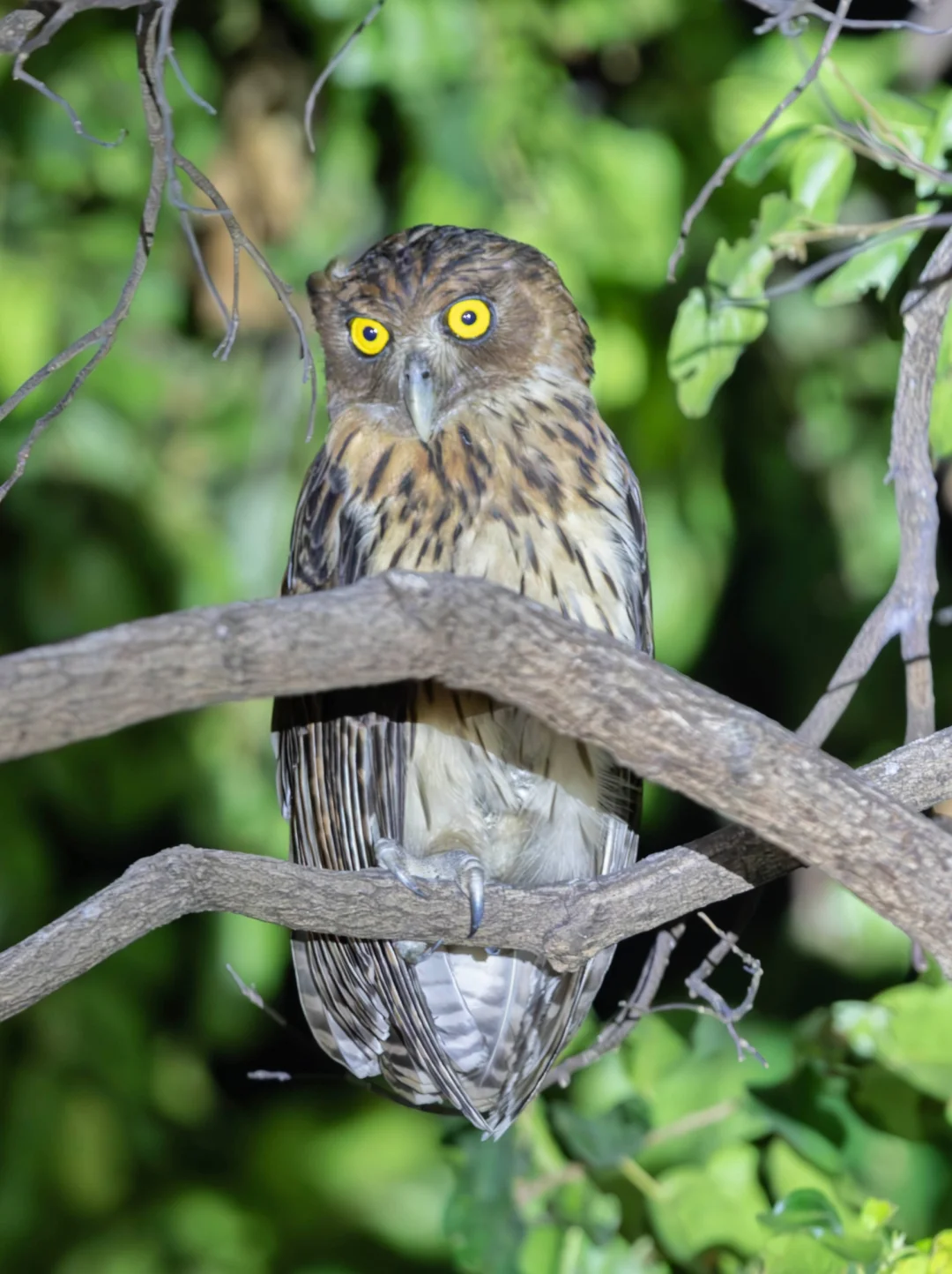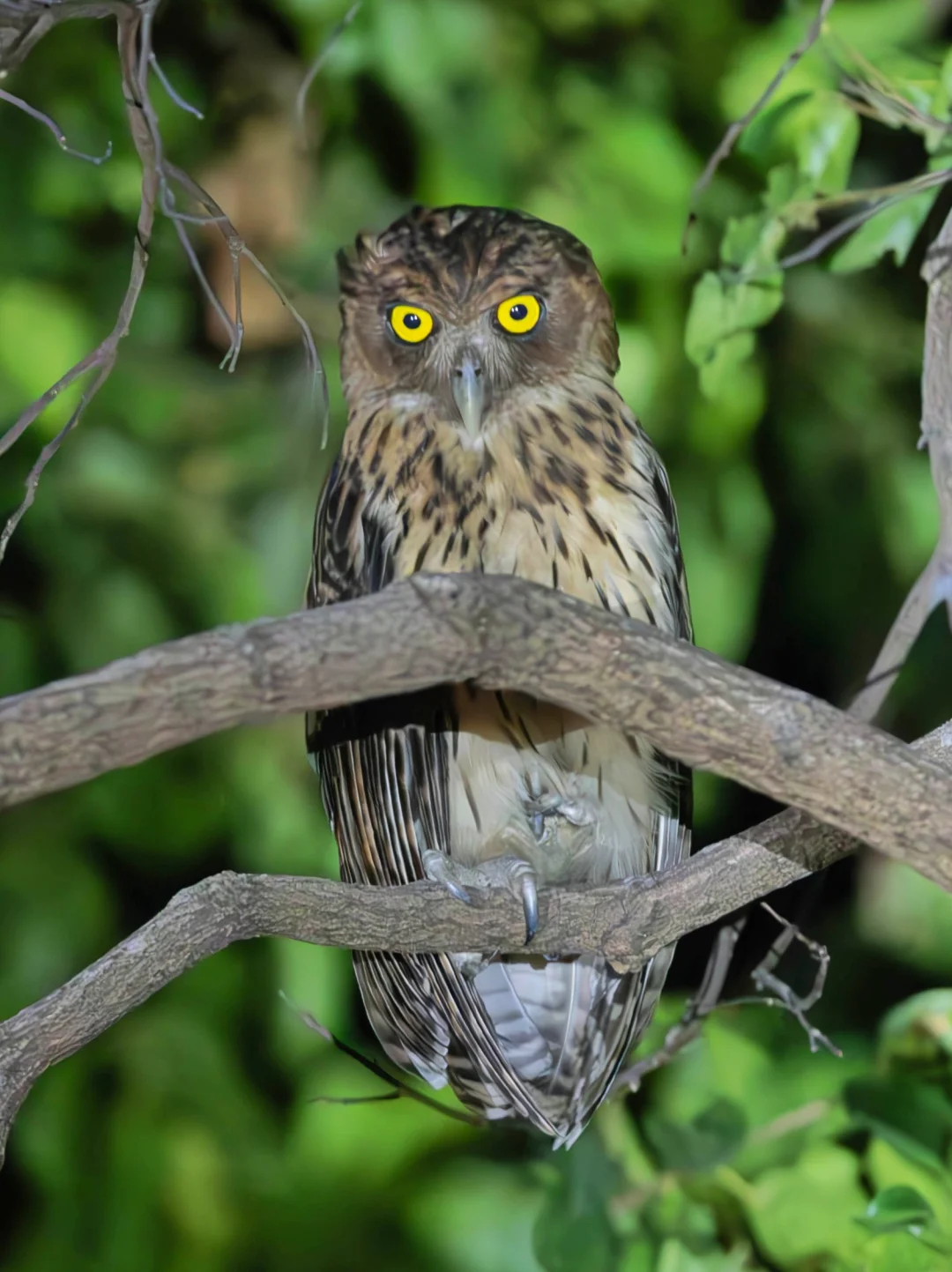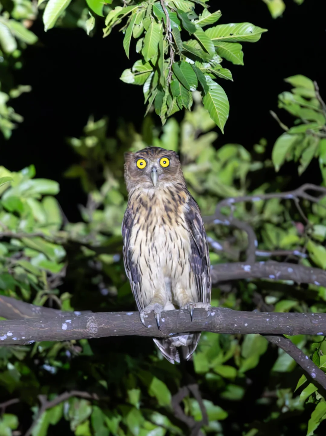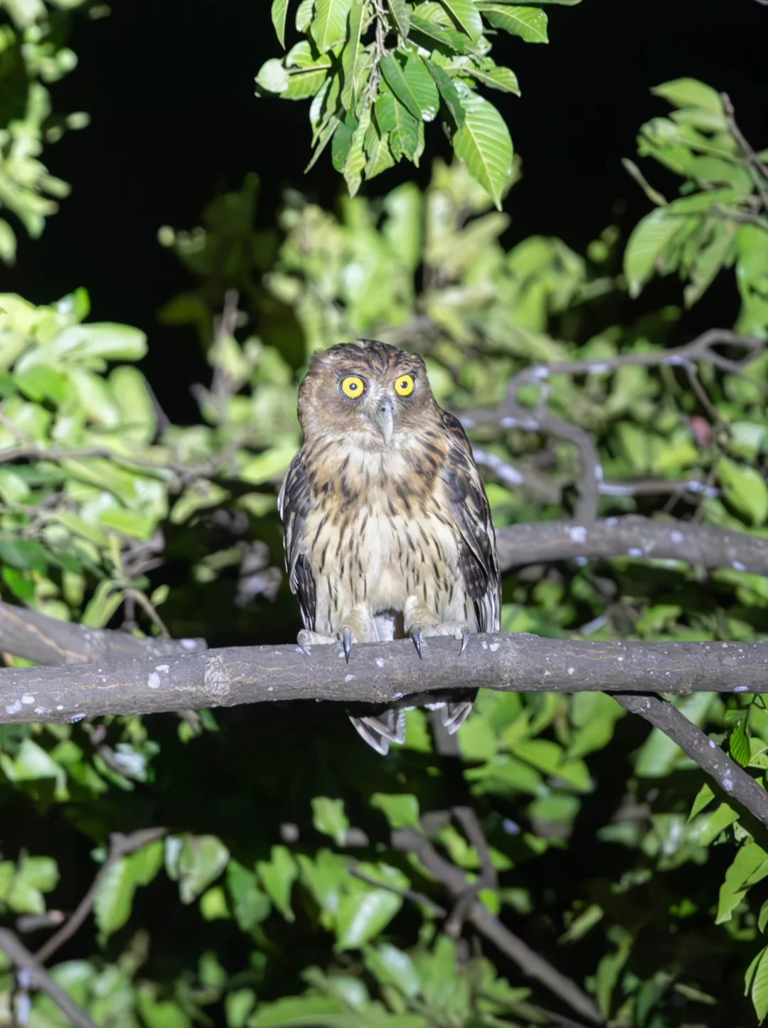 原创拍摄于2025.03 菲律宾雕鸮,Philippine Eagle-Owl,鸮形目鸱鸮科渔鸮属,仅仅分布在菲律宾。作为一种雕鸮,确实属于大型猫头鹰,但是它在所有的雕鸮类中又是最小的,不过仍然是菲律宾最大的猫头鹰。 菲律宾雕鸮全身羽毛是暖棕色,腹部颜色较淡,虹膜是黄色的,显得眼睛又圆又亮,在黑夜里简直是一对暗夜巨瞳。 这次在苏比克湾看到的这只菲律宾最大猫头鹰,眼神凝视,实在是太帅了。