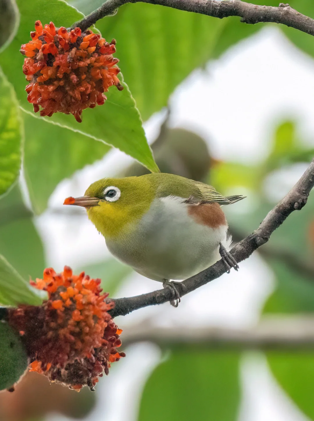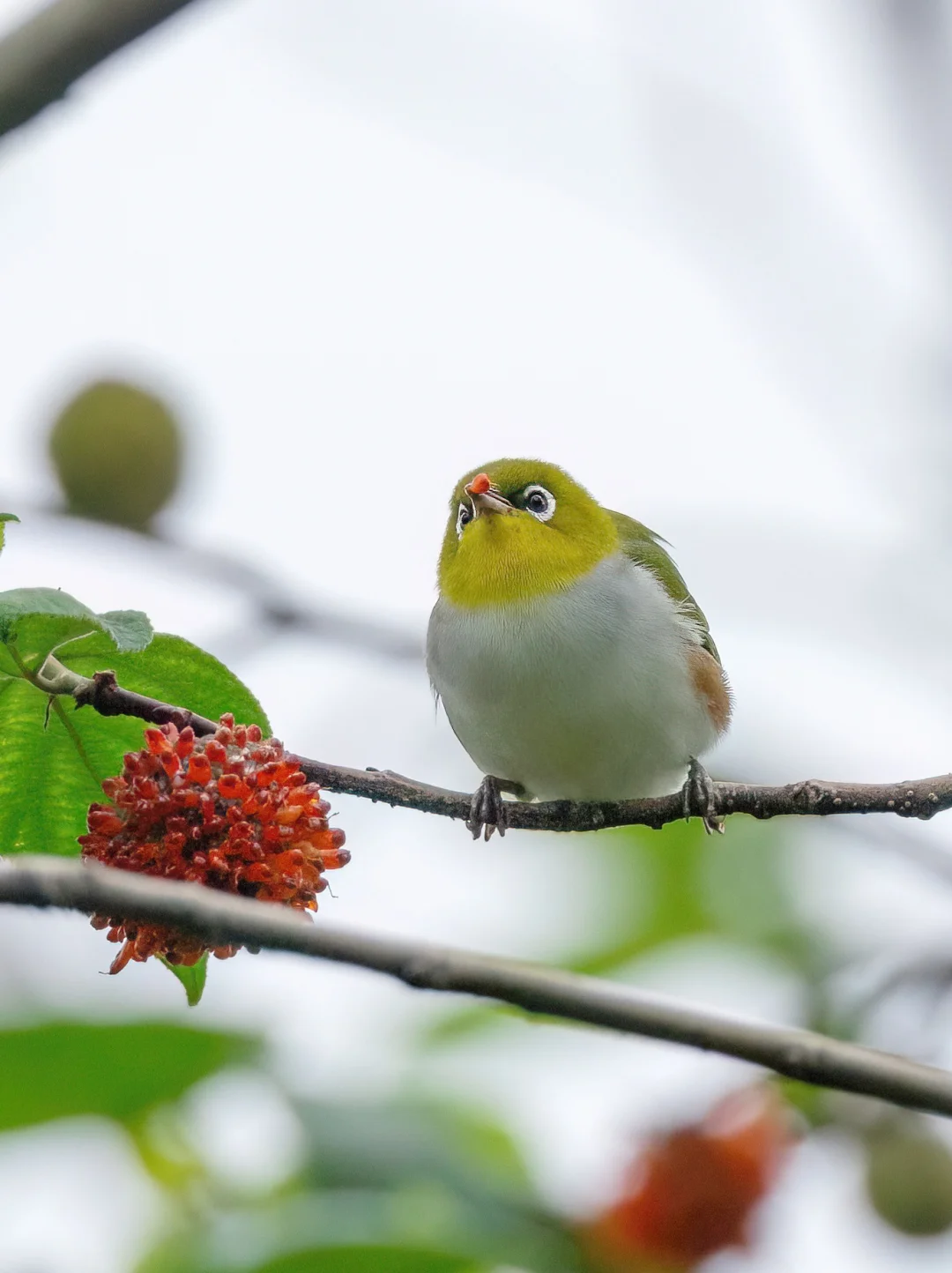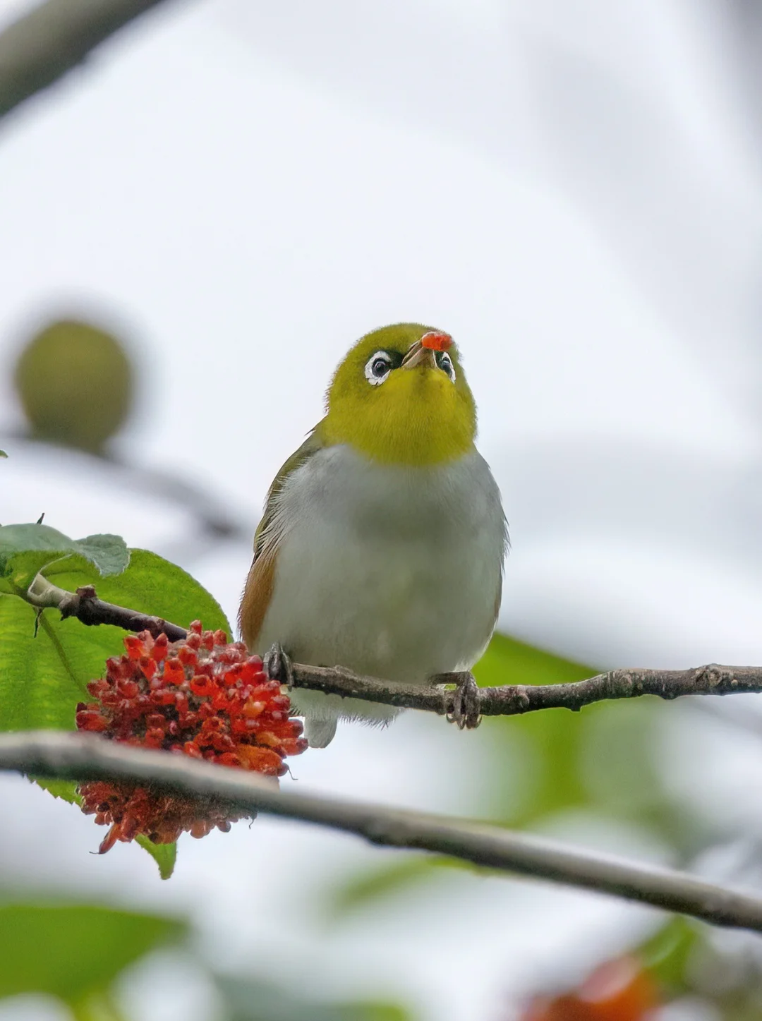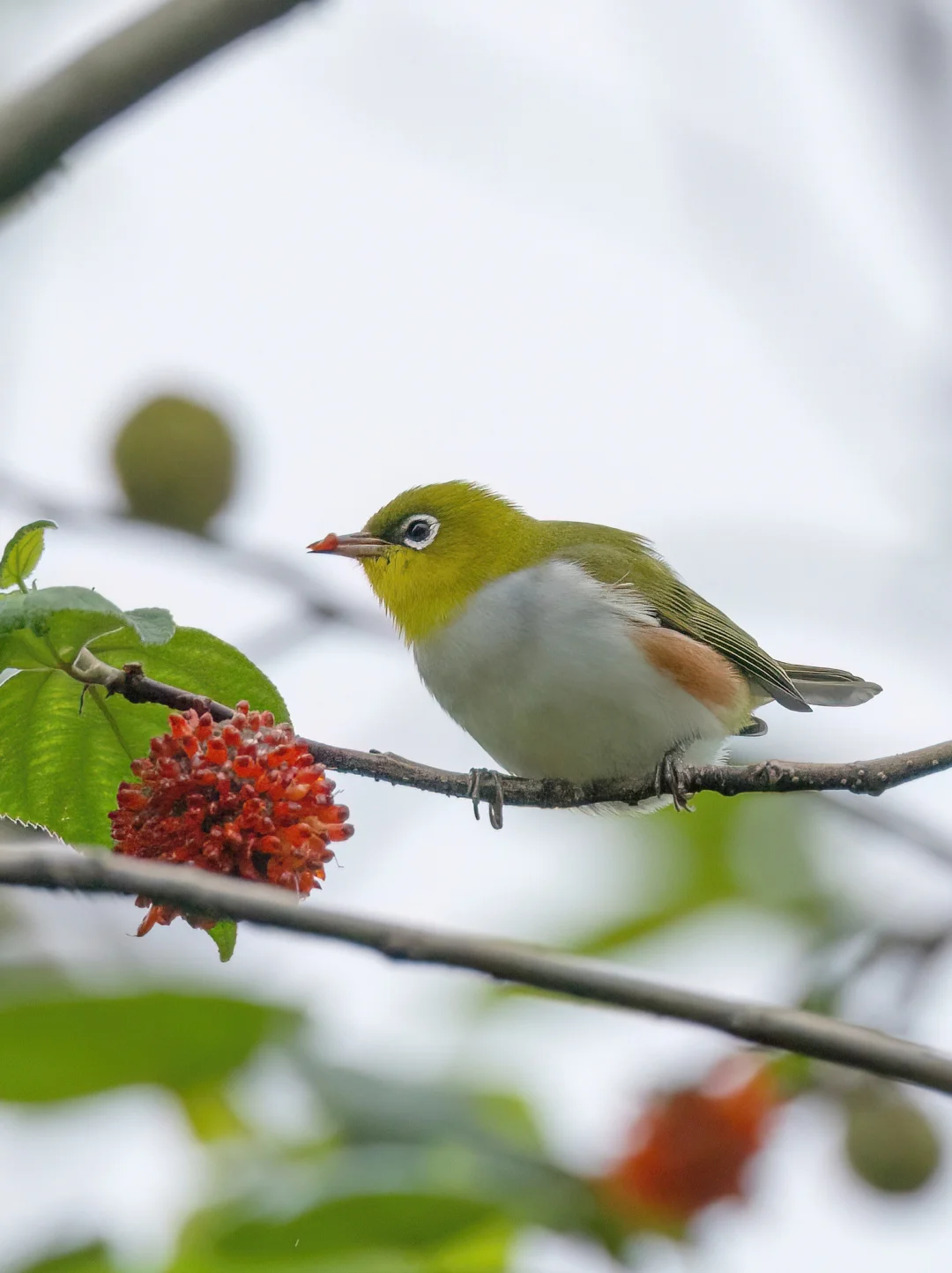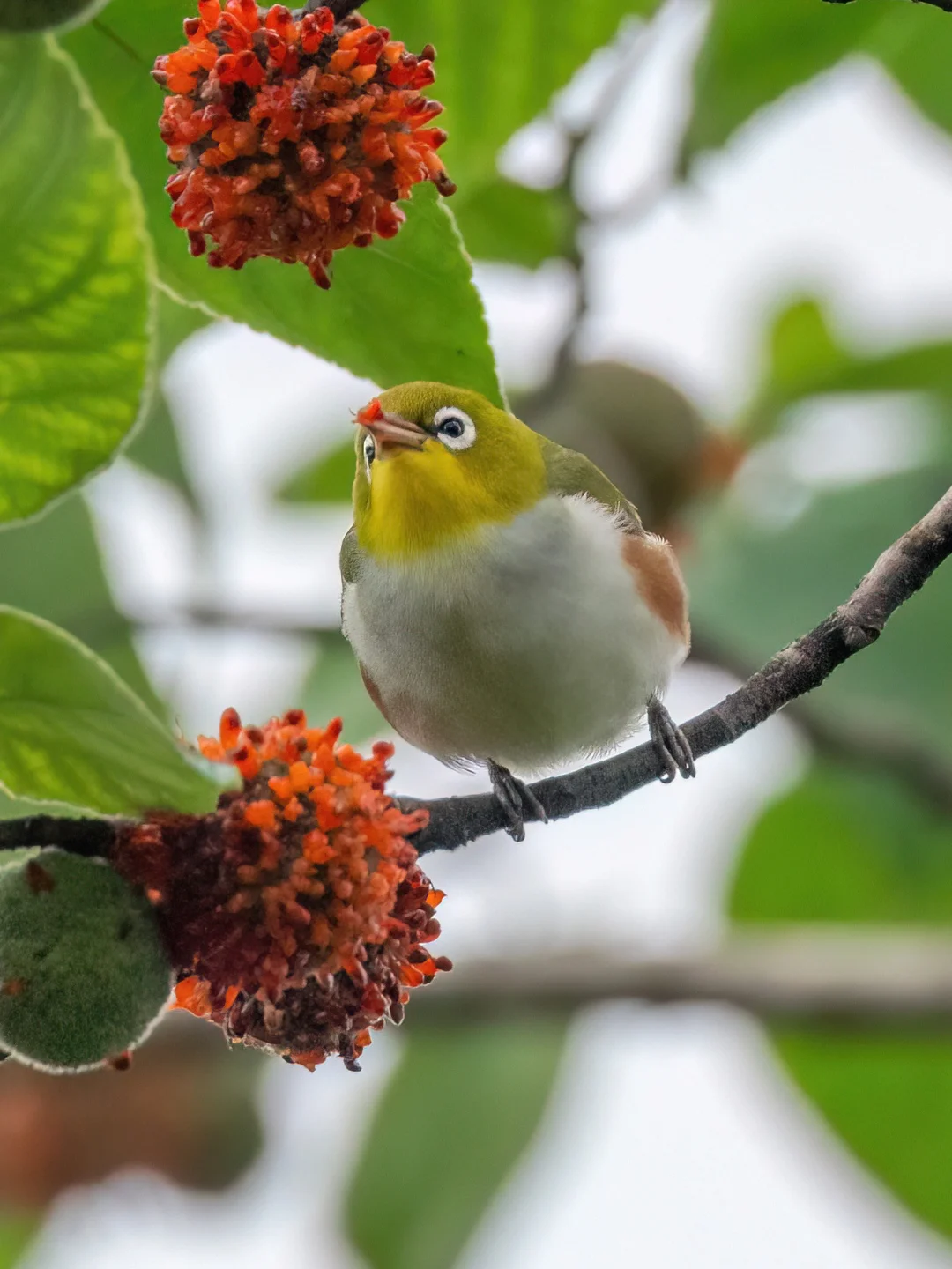 原创拍摄于2024.11 红胁绣眼鸟,雀形目绣眼鸟科绣眼鸟属。 红胁绣眼鸟顾名思义,两胁红栗色是显著的特征,当然有时也不显露。那么还有一个特色就是和其他的绣眼鸟略微不一样,他们几乎完全都是迁徙的。夏天繁殖季他们会到我们国家的东北地区或者是俄罗斯远东地区繁殖,冬天就会迁徙到我国的南部或者是东南亚过冬。 这次看到的这一群红胁绣眼鸟,为了吃这个果实,摆出各种搞怪可爱的表情,团团的毛球实在是太可爱了。
