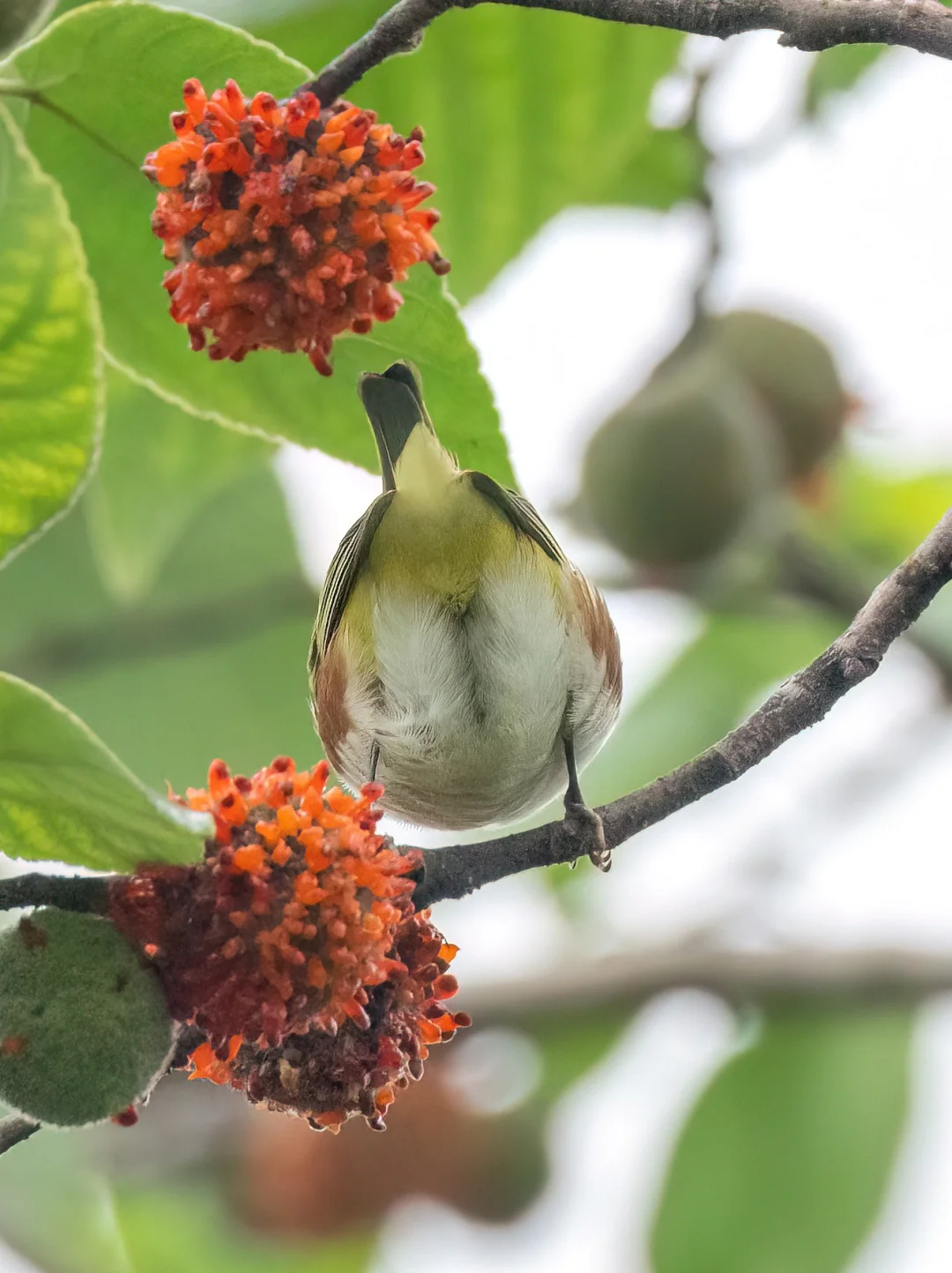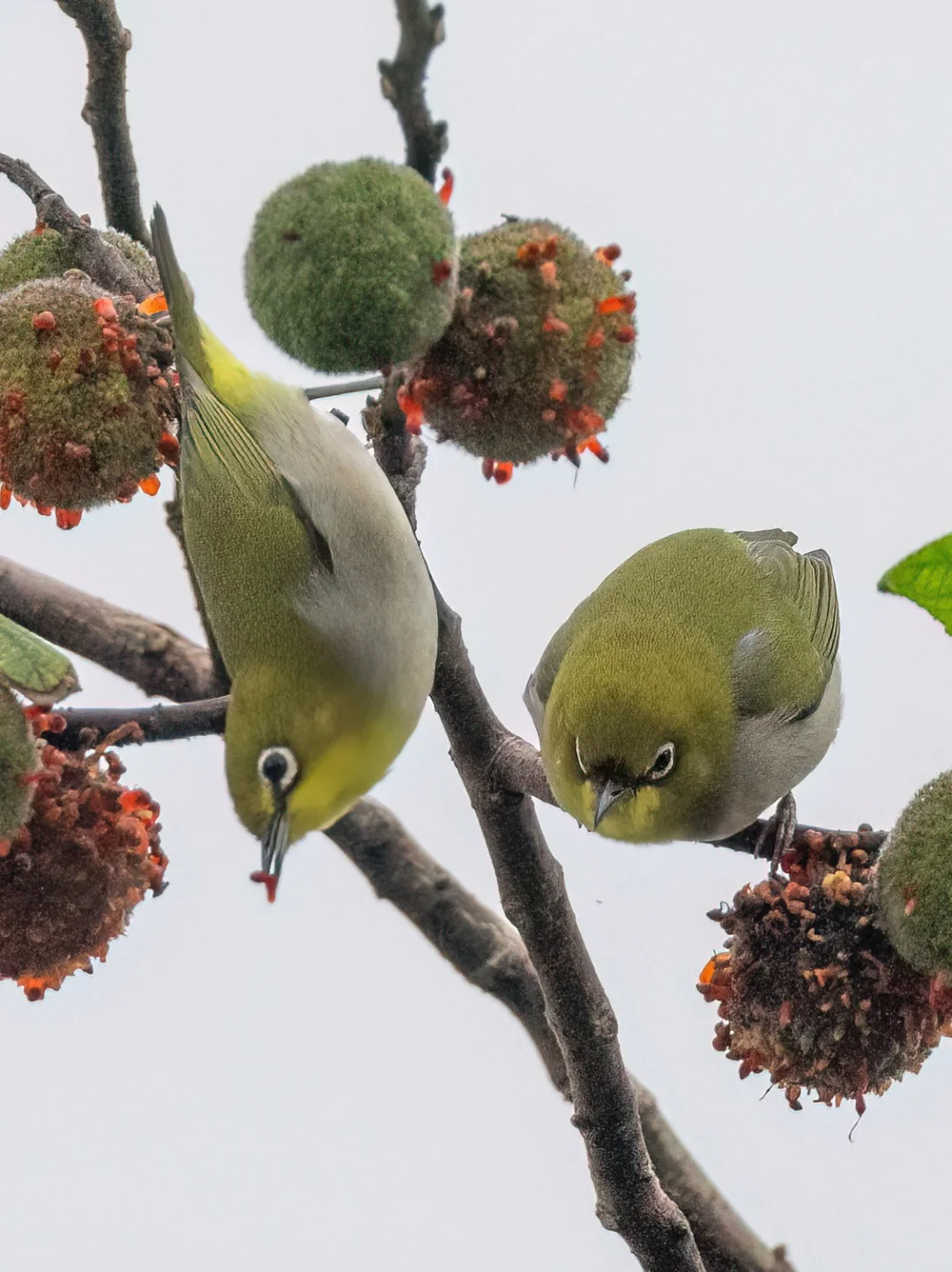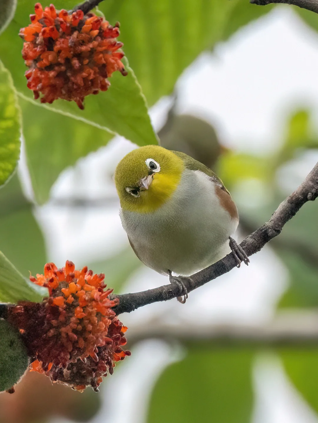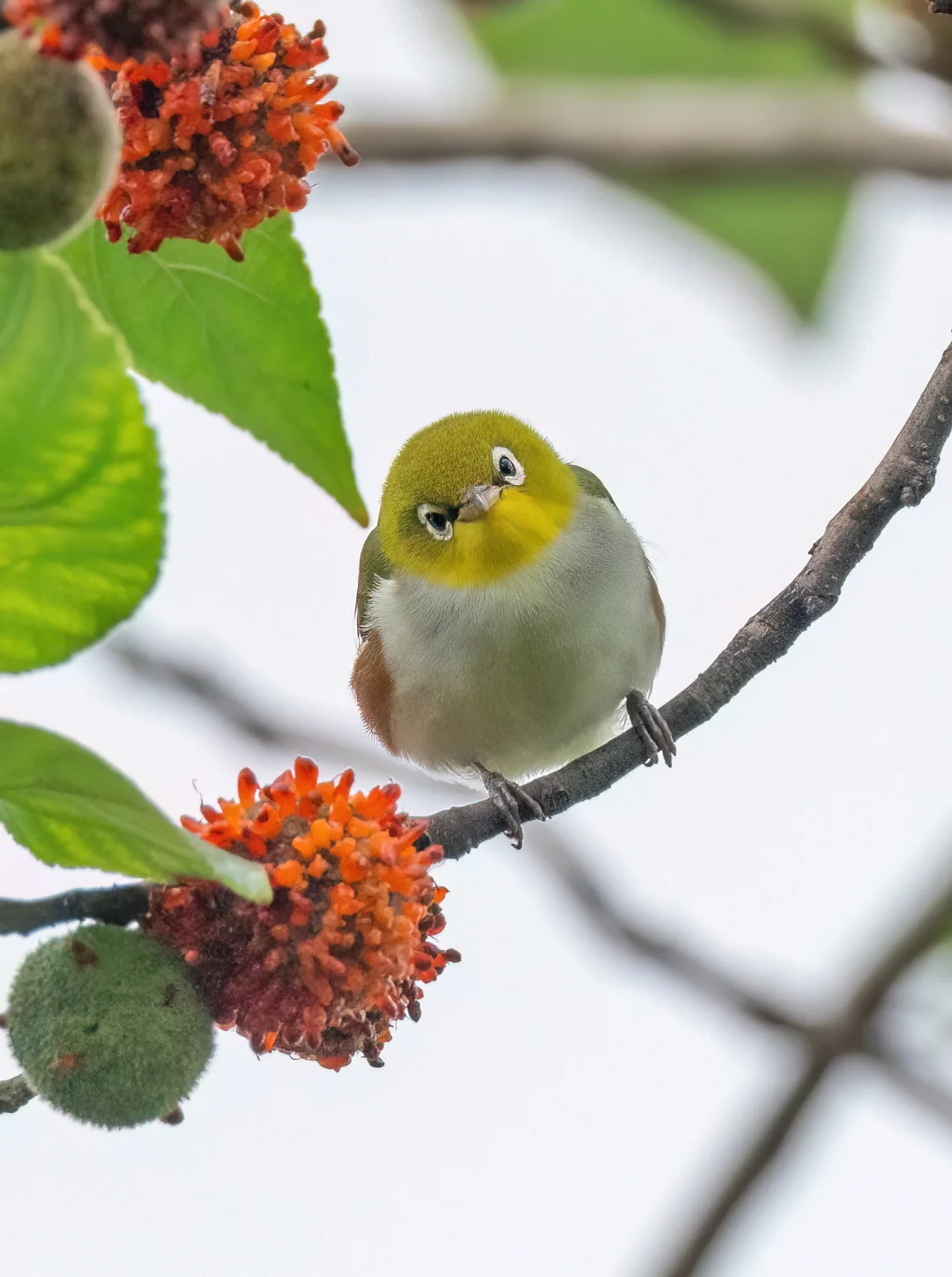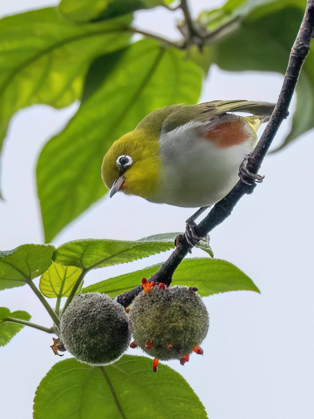原创拍摄于2024.11 红胁绣眼鸟,雀形目绣眼鸟科绣眼鸟属。 红胁绣眼鸟顾名思义,两胁红栗色是显著的特征,当然有时也不显露。那么还有一个特色就是和其他的绣眼鸟略微不一样,他们几乎完全都是迁徙的。夏天繁殖季他们会到我们国家的东北地区或者是俄罗斯远东地区繁殖,冬天就会迁徙到我国的南部或者是东南亚过冬。 这次看到的这一群红胁绣眼鸟,为了吃这个果实,摆出各种搞怪可爱的表情,团团的毛球实在是太可爱了。