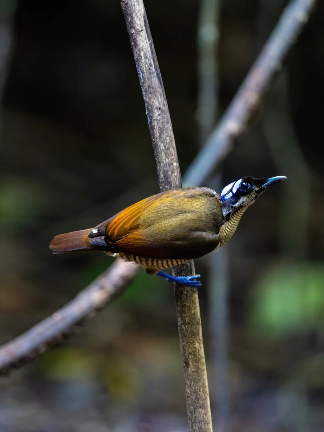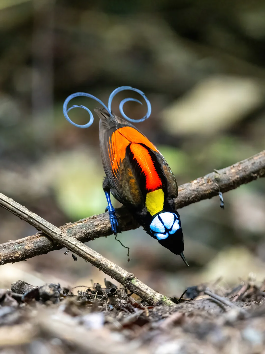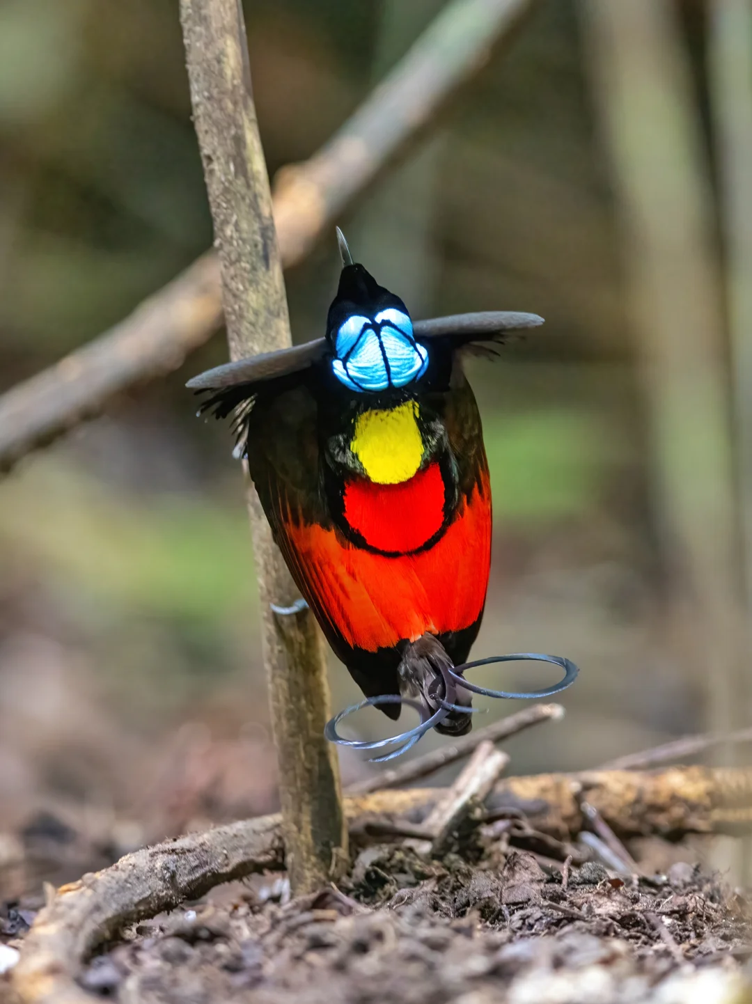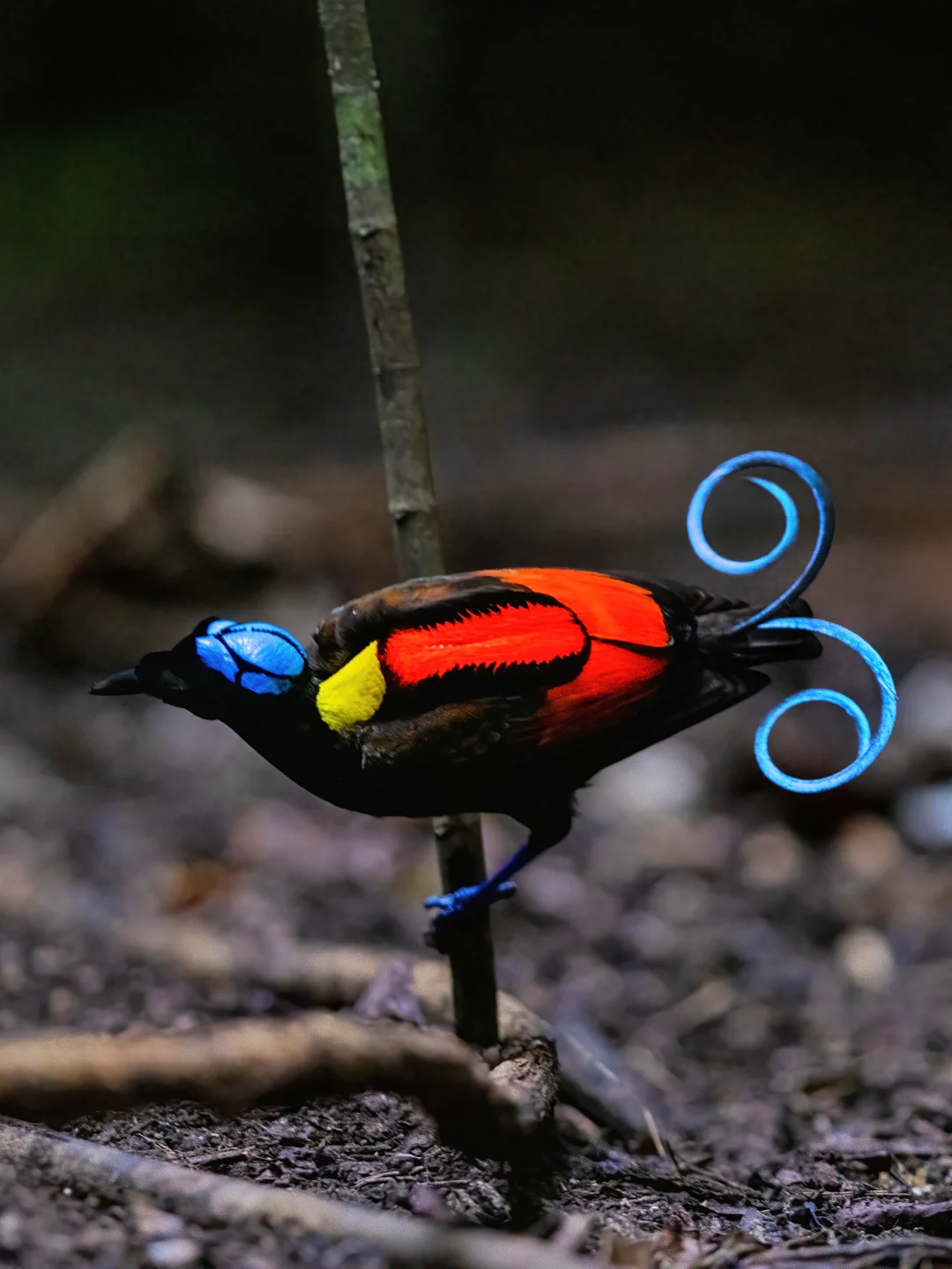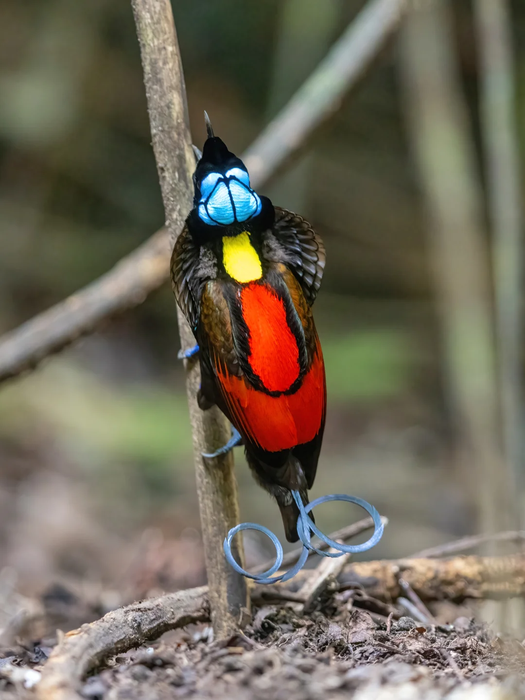 威氏极乐鸟雄鸟拥有红色的背部和黄色的颈部,蓝紫色的脚,以及奇特的扁平卷曲尾羽,能反射出蓝色光芒,尤其是在幽暗的森林之下,反光明显。头部裸露的蓝色皮肤上带有黑色细线图案。雌鸟相比略显暗淡,图7,上身橄榄棕色,腹部有条纹。