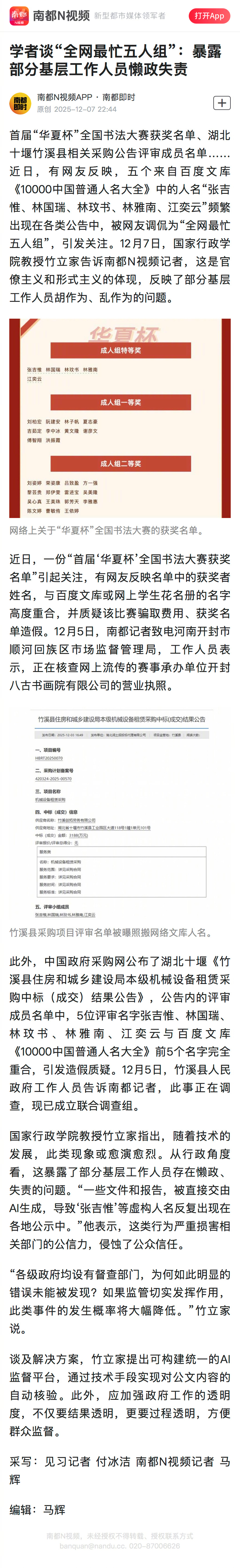 #学者称最忙五人组暴露部分懒政失责#【学者谈“全网最忙五人组”:暴露部分基层工作人员懒政失责】首届“华夏杯”全国书法大赛获奖名单、湖北十堰竹溪县相关采购公告评审成员名单……近日,有网友反映,五个来自百度文库《10000中国普通人名大全》中的人名“张吉惟、林国瑞、林玟书、林雅南、江奕云”频繁出现在各类公告中,被网友调侃为“全网最忙五人组”,引发关注。12月7日,国家行政学院教授竹立家告诉南都N视频记者,这是官僚主义和形式主义的体现,反映了部分基层工作人员胡作为、乱作为的问题。南都N视频记者 马辉 见习记者 付冰洁