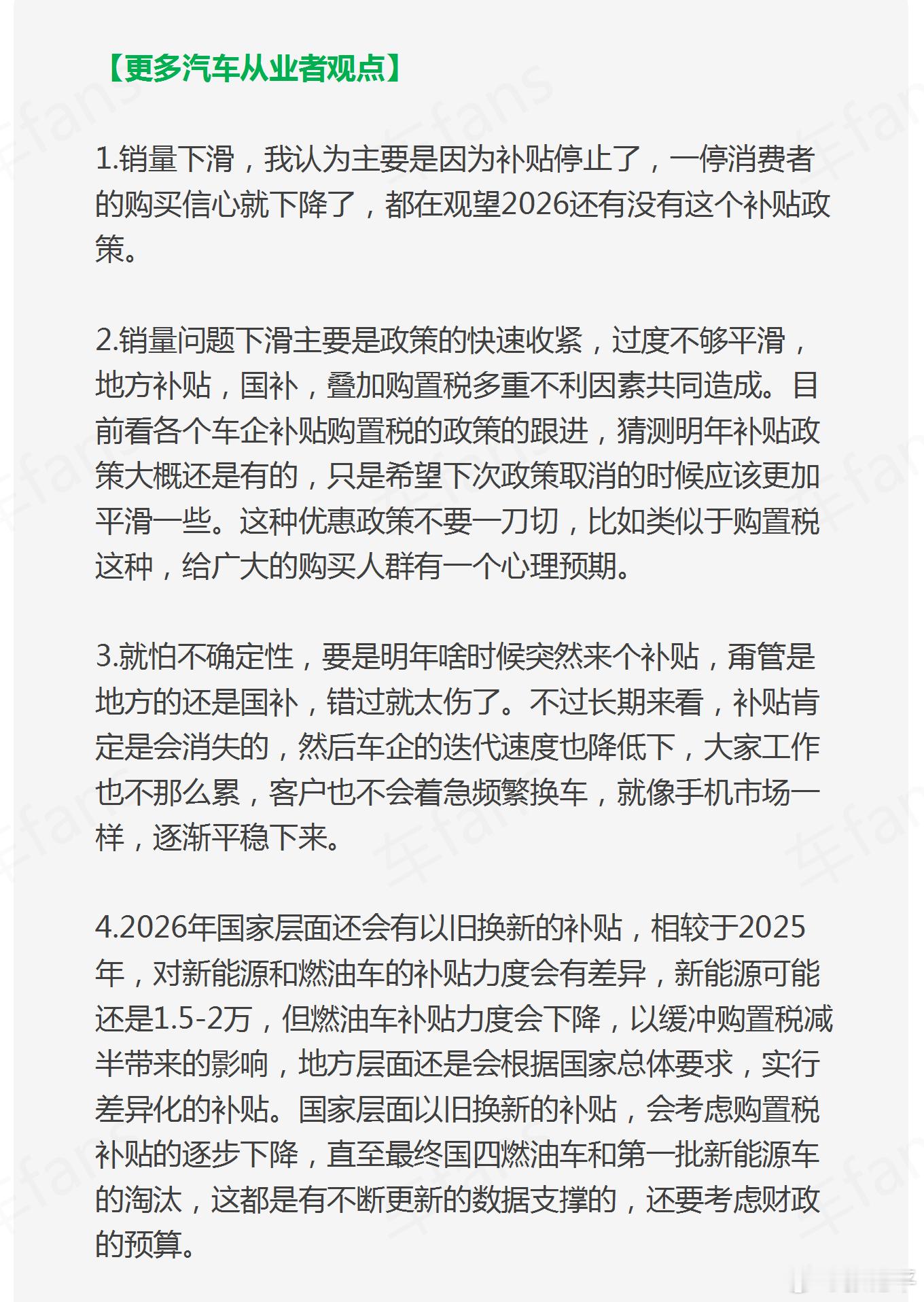 车fans从业者社群探讨了一个话题:2026年还会不会有补贴,以及明年的整体车价会涨还是降?有个观点特别认同:“明年竞争的核心将从单纯的价格比拼,转向技术、产品力、品牌与服务的综合较量。市场的终局将是价值的回归与深度分化,具备真正竞争优势的企业才能在存量市场中立足与发展。”新能源汽车大v聊车