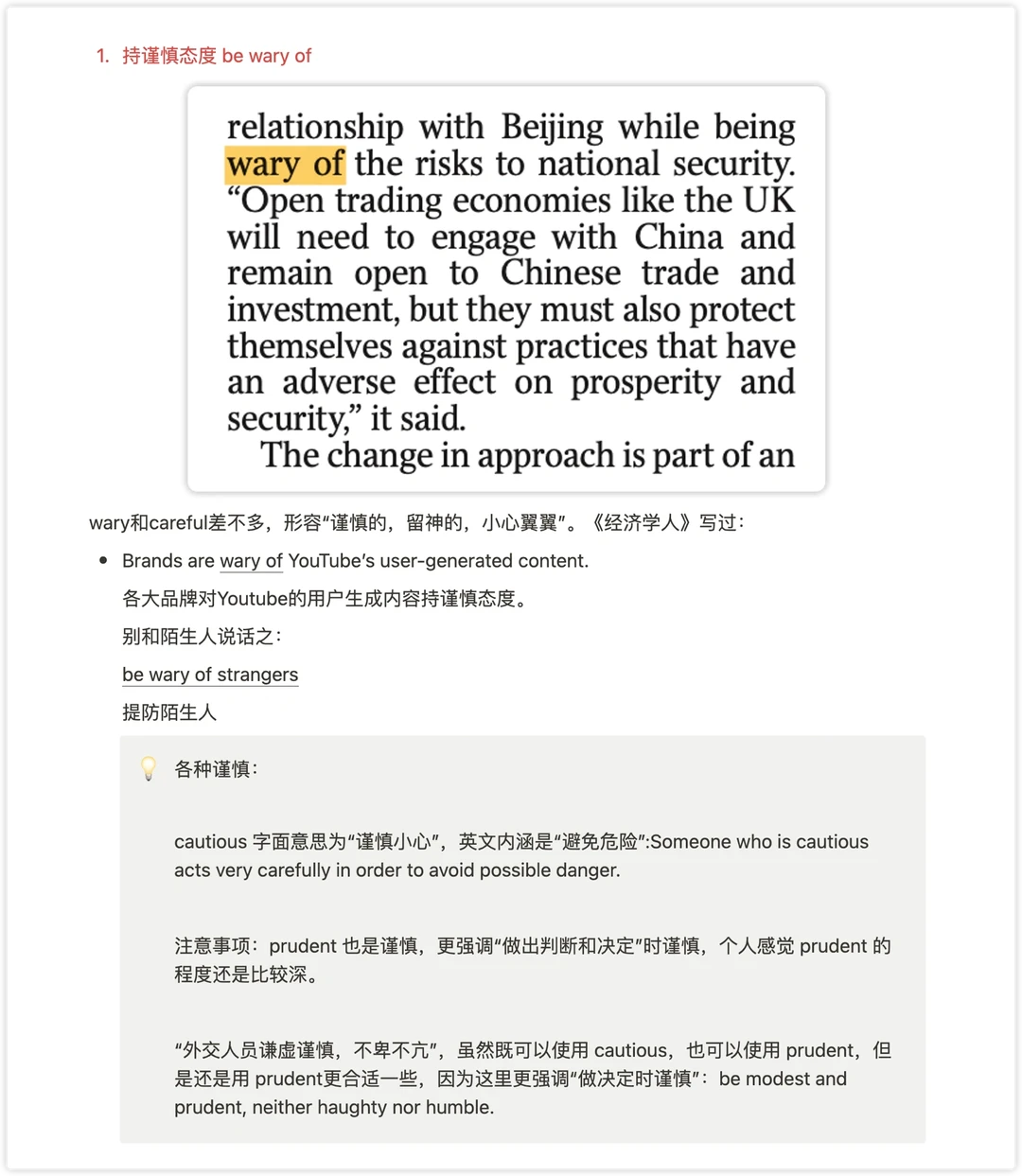 注意事项:prudent 也是谨慎,更强调“做出判断和决定”时谨慎,个人感觉 prudent 的程度还是比较深。