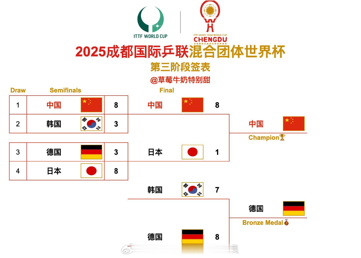 2025成都国际乒联混合团体世界杯丨混团决赛【🇨🇳中国8-1日本🇯🇵】第一盘:王楚钦/孙颖莎3-0松岛辉空/大藤沙月【11-4,11-4,11-6】第二盘:王曼昱3-0张本美和【11-6,11-7,11-6】第三盘:林诗栋2-1张本智和【6-11,11-5,11-6】恭喜中国队🇨🇳获得2025成都国际乒联混合团体世界杯冠军🥇🏆🎉日本队🇯🇵获得2025成都国际乒联混合团体世界杯亚军🥈()