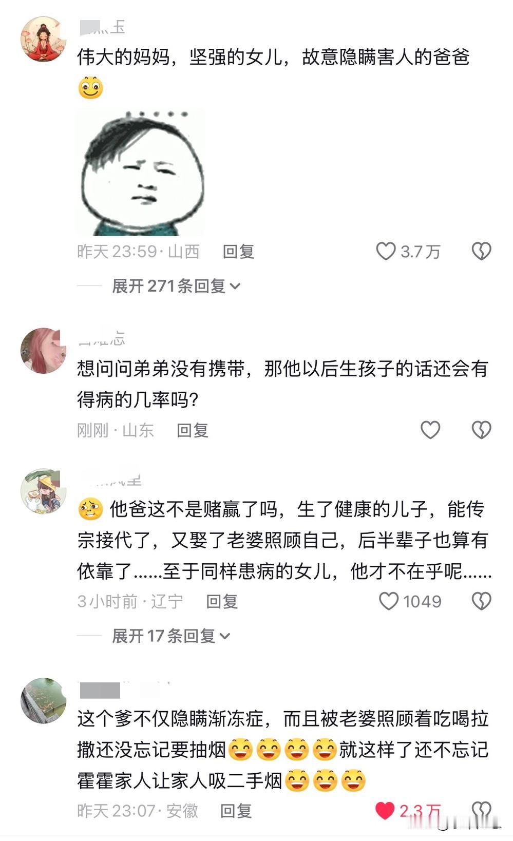 这件事给所有想要结婚的人提了个醒: 你可以不摆酒席 也可以不过大礼 但在领证之前, 你一定要让对方做个全面的婚前检查! 河南一男子,明知道自己有渐冻症遗传,却在结婚生子前故意隐瞒。结果大女儿刚考上高中,就突然发病。在花一样的年纪,被迫切除气管,瘫痪在床。 小儿子虽然逃过一劫,但是也受了很大影响。基因这个事太难说了,儿子以后肯定也不敢轻易结婚生子了。 老婆既要工作养家,又要照顾自家老人,患病的丈夫和卧床的女儿。 更让人心寒的是,孩子还没生下来的时候,男子就给孩子做过胎前基因检测。上面清楚的写着,女儿遗传了他的渐冻症基因,儿子没有遗传。 怪不得老一辈常说访亲,现在看来真的很有必要 ,如果不是知根知底的两个家庭,婚前的基因检查必须要做!