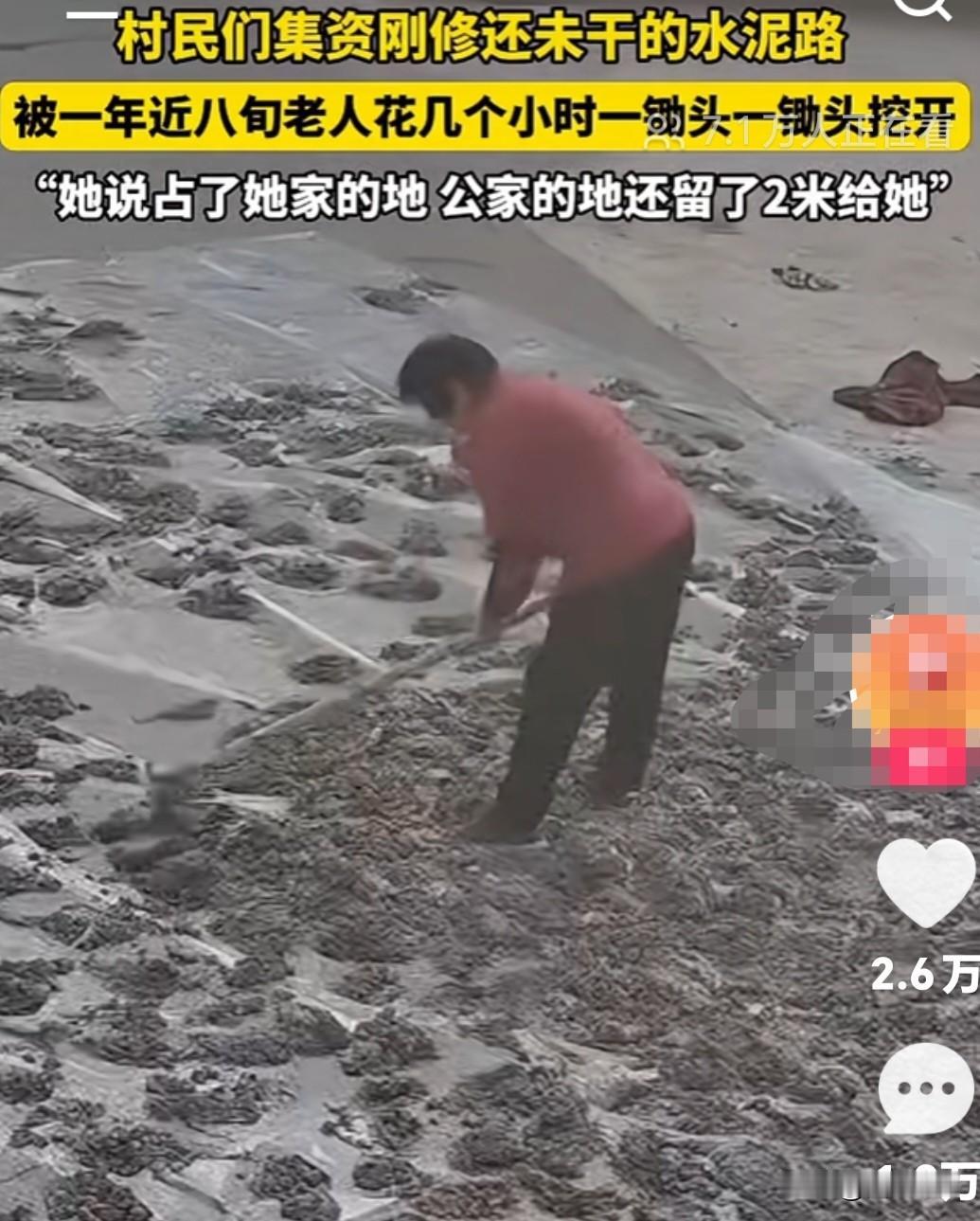 太坏了,湖南,村民们集资刚修的,还未干的水泥路,被一年近八旬老人一锄头一锄头挖开。“她说占了她家的地,公家的地还留了2米给她”。 湖南这事可让人气愤,这水泥路可是大伙的心血,集资过程肯定不容易,大家都盼着路修好后出行更方便。 真不明白老人为啥要这么做,是有啥心结没解开,还是有什么需求没被满足?这一挖,不仅破坏了大家的劳动成果,后续修复也得花不少钱和精力。希望警方能赶紧弄清楚原因!