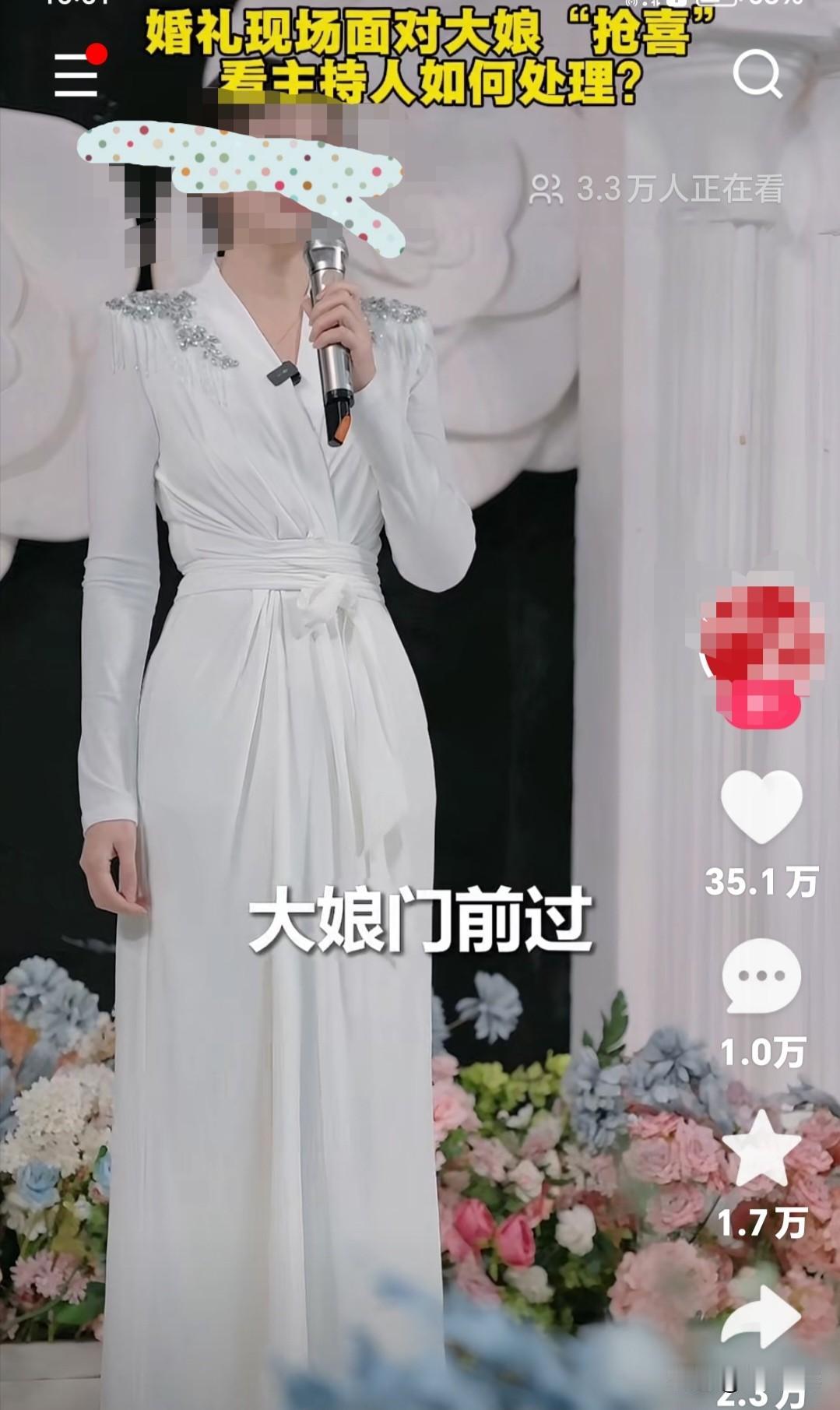 婚礼现场,面对大娘冲出来抢喜,主持人嘴巴毫不留情惹争议! 伴郎正准备拉开门迎接新郎和新娘出来,一大妈冲过来抢喜,伴郎没有拉住,让大妈从门前跑过! 主持人:大娘门前过,挡灾又挡祸,感谢大娘为新娘挡下了余生的不幸,新人从此路宽广,喜气盈门福满堂! 事后,很多人支持主持人,说这大娘该骂,她故意抢一对新人运气,那是干不道德的事,必须谴责挨骂! 也有人说,这主持人嘴太毒了,如果大娘出门出事了会怎么样?