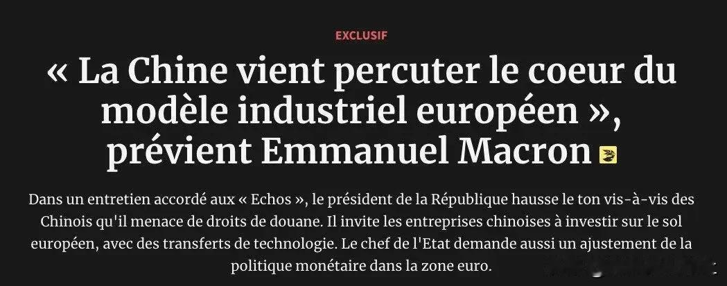 回去就变了! 马克龙结束访华后,接受媒体采访时提到,他已经与冯德莱恩交换了北京之行的相关情况! 同时,马克龙再次提到,欧盟将以关税相威胁,让中欧之间的贸易顺差尽快找到平衡!因为欧洲的商品对中国没有太多吸引力!中国进口欧洲商品太少了! 欧盟希望中方尽快改变做法,否则欧方会效仿美国,限制与中国的商品交易!马克龙也明白,正是特朗普的关税大棒,才导致欧中贸易的逆差出现! 明知道华盛顿做法不妥,马克龙居然还要照着做,让人费解! 更让人不解的是,刚刚在中国度过愉快的出访过程,貌似又要出现曾经的桥段,是不是去了四川,真的学会变脸啦!