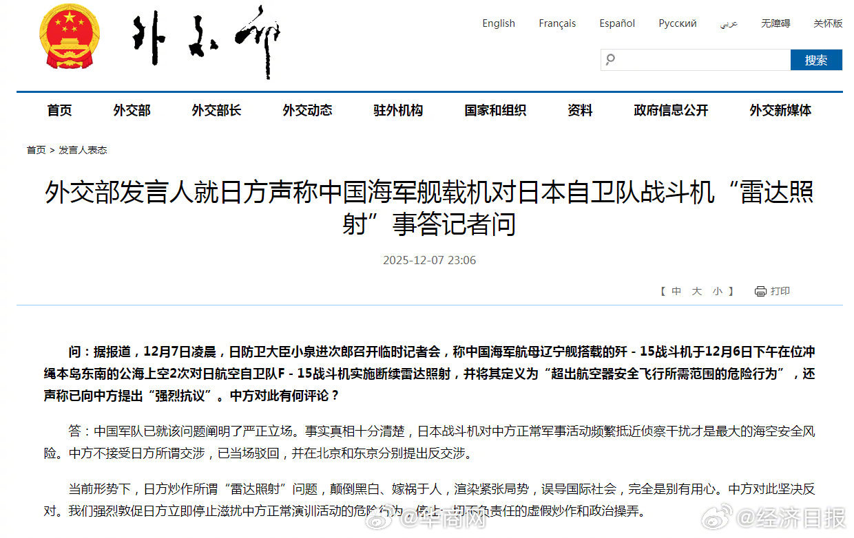 #中方不接受日方所谓交涉#【#中方当场驳回日方所谓交涉#】#日方完全是别有用心# 外交部发言人就日方声称中国海军舰载机对日本自卫队战斗机“雷达照射”事答记者问。问:据报道,12月7日凌晨,日防卫大臣小泉进次郎召开临时记者会,称中国海军航母辽宁舰搭载的歼-15战斗机于12月6日下午在位冲绳本岛东南的公海上空2次对日航空自卫队F-15战斗机实施断续雷达照射,并将其定义为“超出航空器安全飞行所需范围的危险行为”,还声称已向中方提出“强烈抗议”。中方对此有何评论?答:中国军队已就该问题阐明了严正立场。事实真相十分清楚,日本战斗机对中方正常军事活动频繁抵近侦察干扰才是最大的海空安全风险。中方不接受日方所谓交涉,已当场驳回,并在北京和东京分别提出反交涉。当前形势下,日方炒作所谓“雷达照射”问题,颠倒黑白、嫁祸于人,渲染紧张局势,误导国际社会,完全是别有用心。中方对此坚决反对。我们强烈敦促日方立即停止滋扰中方正常演训活动的危险行为,停止一切不负责任的虚假炒作和政治操弄。网页链接