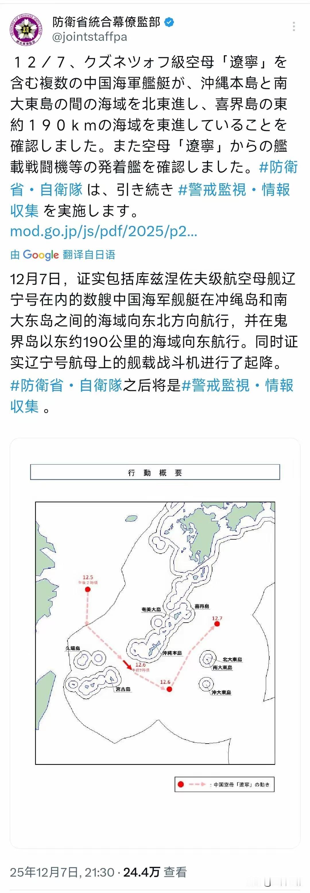 刚看到个事儿,有点意思。日本防卫省昨晚发了个通报,说他们12月7号那天,在冲绳南边那片海上,盯上了咱们中国的辽宁舰航母编队。通报写得挺详细,连航母在哪儿转向、舰载机起飞降落都确认了,还说他们会继续“警戒监视”。 说白了,就是中国海军在自己的家门口,进行了一次再正常不过的远海训练。航母不就是用来训练舰载机的嘛,这在公海上完全合理合法。可日方的反应,那阵仗搞得像是出了什么大事,不仅舰机全程跟着,事后还特意发个“小作文”,把细节公之于众。 这操作就挺耐人寻味的。那片水域是国际航道,中国军舰通行自由。日本这么大张旗鼓地“直播”中国军队的正常活动,话里话外却容易让人产生“威胁逼近”的错觉。是谁在小心翼翼地收集情报,又是谁在实实在在地开展训练?谁在自家门口活动,谁又老想着对别人家门前的事“保持关注”?这一对比,味儿就出来了。 说到底,自家军队的常态化训练,被别人拿着放大镜看,还当成“突发事件”来报道,这本就说明了问题。辽宁舰向东走,练的是硬实力;有些人的心眼和笔头,却老往别处使。