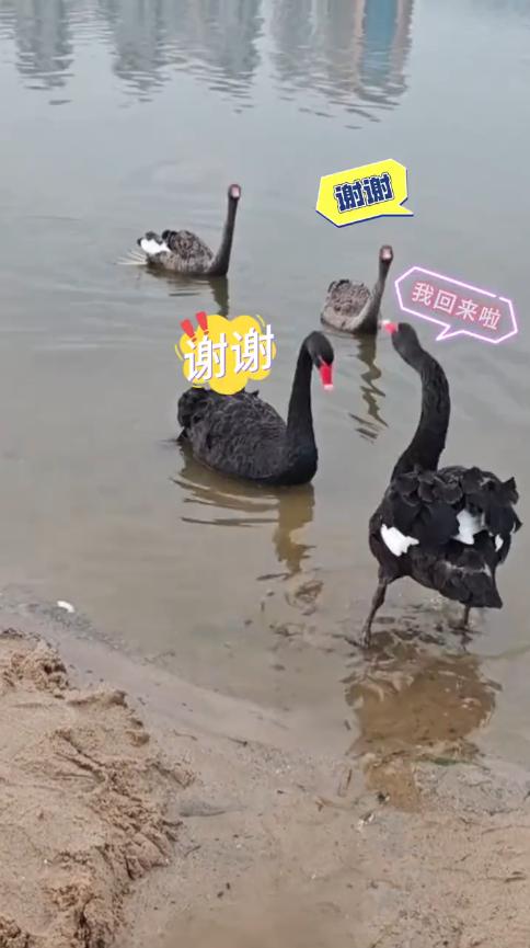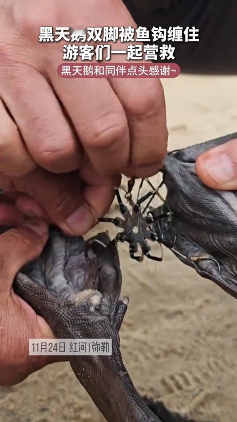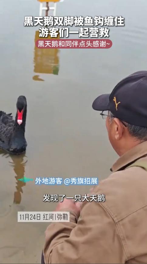“太有灵性了!”11月24日,云南弥勒,一外地游客在河边游玩时,一只黑天鹤突然朝他快速游来,游客有些好奇,仔细一瞧才发现天鹅的脚掌被鱼钩钩住了,于是立即帮它取了下来,天鹅离开前,还不断鞠躬感谢!天鹅:人类是益虫。 景区的风景优美,生态良好,河中自然有不少鱼群,但景区内却是禁止垂钓的,游客们游玩时一定要自觉遵守秩序,不要破坏景区的生态。 事发当天,男子和家人在红河边上游玩,他们看到河中也有黑天鹅一家,很是温馨。就在男子看得正入迷时,一只黑天鹅突然游了过来! 天鹅在岸边不断徘徊,但就是不上岸,男子有些好奇,同时看出天鹅游动的样子有些奇怪,于是仔细看了看天鹅的脚掌,发现似乎被什么东西钩住了。 男子将黑天鹅拉上岸后,看到了一个鱼钩,鱼线将两只脚缠绕在一起,想必这就是它无法上岸的原因了。 随后男子和家人一起努力,成功将鱼钩取了下来,黑天鹅终于恢复了自由,开心地和家人团聚,之后它们不断朝着男子点头、鞠躬,以示感谢。 网友看后表示,果然万物都有灵,这天鹅真是聪明,还知道向人类求助,但那些在景区钓鱼的人就非常可恶了,不仅破坏了生态,还对动物造成了危害! 信息来源:《太有灵性~黑天鹅双脚被鱼钩缠住,游客们一起营救,黑天鹅和同伴点头感谢...》云南红河发布