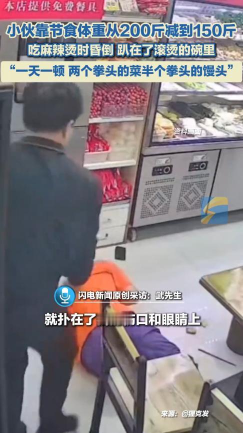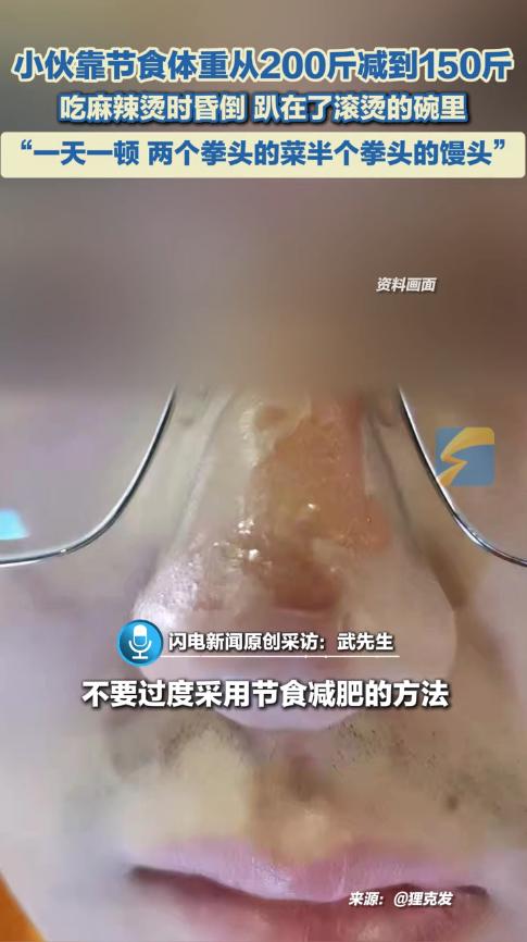 “悲剧还是发生了!”11月9日,内蒙古包头,一男子为了快速减肥,每天只吃半个馒头和2份拳头大的菜,坚持了9个月后,成功瘦了50斤,没想到,他吃麻辣烫时突然晕倒,脸部埋进热汤里被严重烫伤。网友:把命都豁出去了! 年轻人对于身材的管理非常严格,不少人为了减肥,每天只吃一顿饭,而且还搭配高强度的体育锻炼,然而长时间不吃饭,对于身体的损害极大,所以大家一定要采取合理的方式减肥。 武先生开了一家理发店,由于每天的活动量不是很大,再加上以前总是胡吃海喝,导致体重飙到了200斤,为此,他决定减肥。 武先生采取了对自己最恨的方式——节食,他坚持每天只吃2份菜和半个馒头,虽然体重成功掉了50斤,但是他却经常犯低血糖。 这天晚上,忙碌了一天的武先生开始吃第一顿饭,结果第一口肉还没咽下去,他又犯了低血糖,一头栽进饭碗里随后摔倒在地! 老板见状也被吓蒙了,急忙掐他人中、扇脸,终于把人给弄醒了,随后武先生前往医院治疗,幸亏当时他戴着眼镜,所以眼睛没有受伤。 网友看后表示,这是在拿生命减肥啊!并不是别人能成功的方式就适合所有人,大家一定要选择符合自己的方式减肥。 信息来源:《男子犯低血糖头栽进麻辣烫,脸部被烫伤,眼睛也进了辣椒。当事人:减肥得适可而止,不能太过度!》第1眼新闻