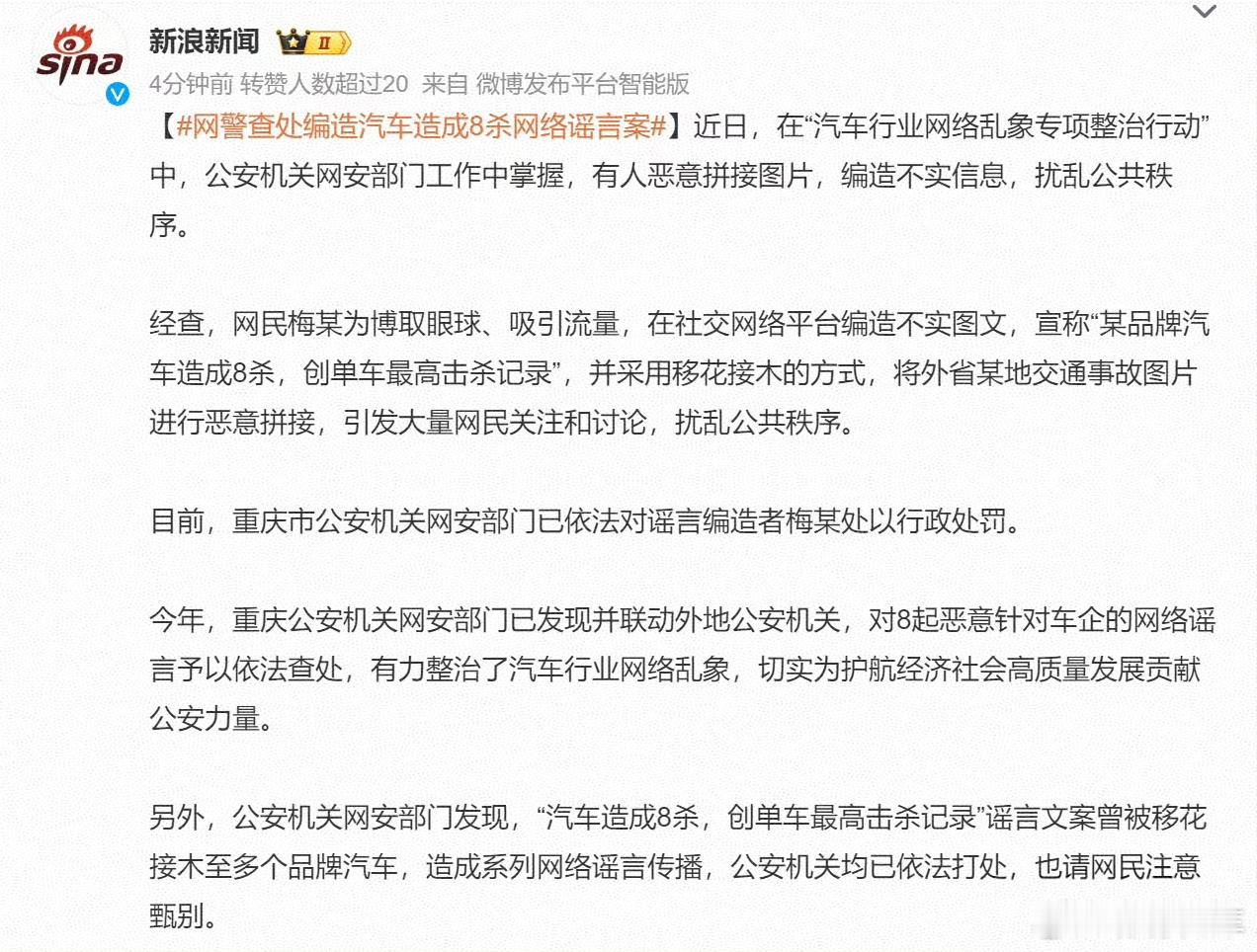 简直太恶劣,这些造谣罔顾事实、移花接木、张冠李戴、自导自演、哗众取宠、漏洞百出,简直不可取网警查处编造汽车造成8杀网络谣言案