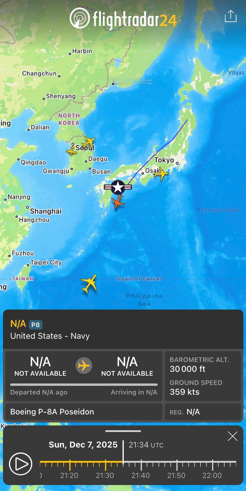 不会要在东京外海搞大联欢吧?12月7日,在我军辽宁号航母战斗群往日本本土方向航行之际,驻日美军的P-8A反潜巡逻机和日本空自的E-767预警机也都出来了。美军华盛顿号航母战斗群的鱼鹰舰载机也出现在东京外海,看来该战斗群的距离可能也不远了。接下来一周,日本周边估计会极其热闹。
