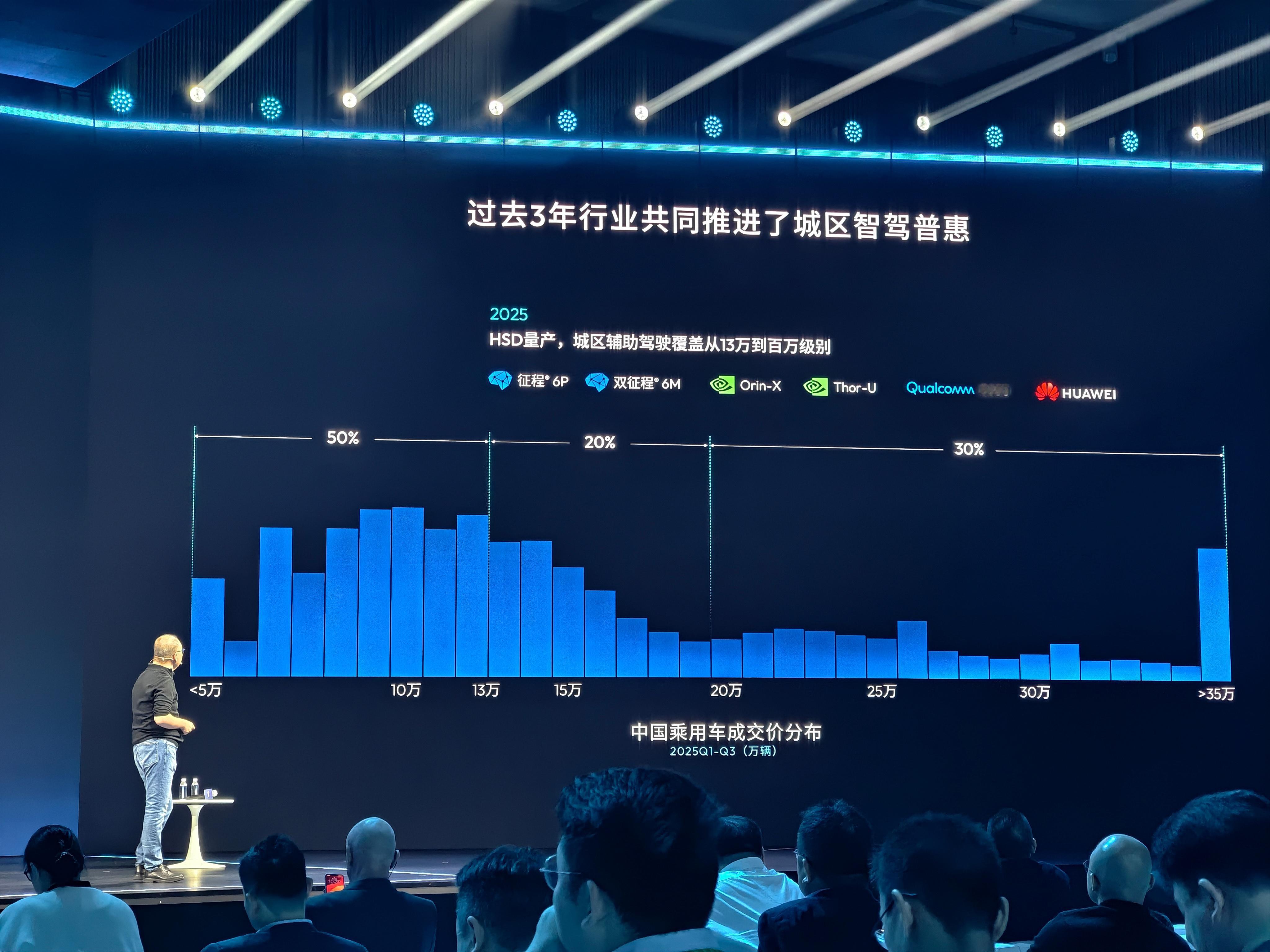 地平线 HSD 基于单 J6M 平台的城市辅助驾驶将下探到占比达 50% 的 10 万级的车型。这是海啸式的技术普惠,这十年辅助驾驶迭代太快了。2026 年 10 万级的辅助驾驶已经全面超越 2021 年 30 万级的辅助驾驶了。太夸张了。2025地平线技术生态大会人人都是中国智驾合伙人