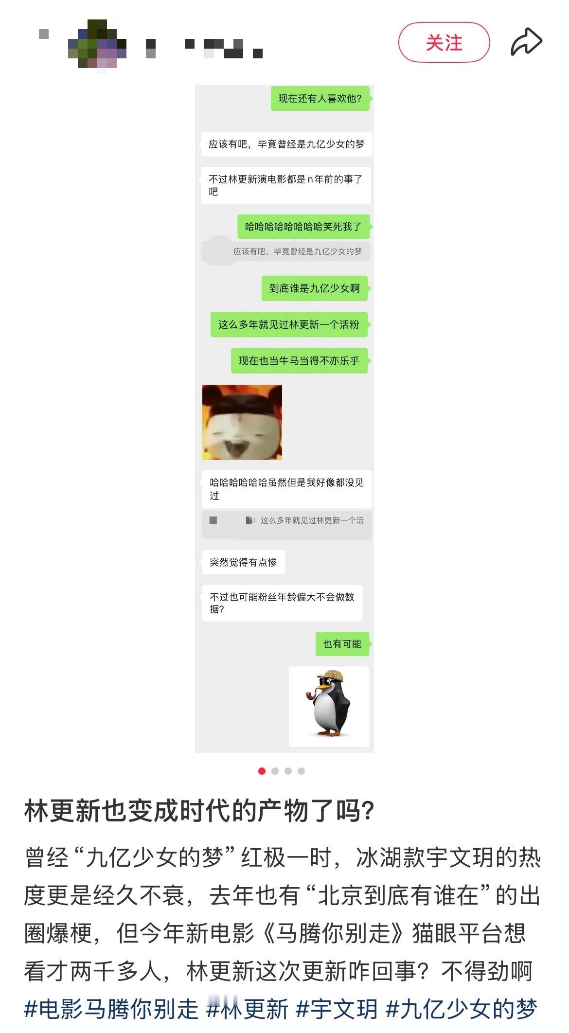 林更新也变成时代的产物了真诚发问:林更新的九亿少女还在吗?新片《马腾你别走》作为金鸡闭幕片,笑泪交织的口碑早已盖章,他演的中年废柴自带笑点与共鸣。可定档后想看数据遇冷,让人不禁感慨昔日顶流难道成了时代产物?从宇文玥到方协文,他的角色陪伴过青春,这部银幕回归作不该被埋没啊!