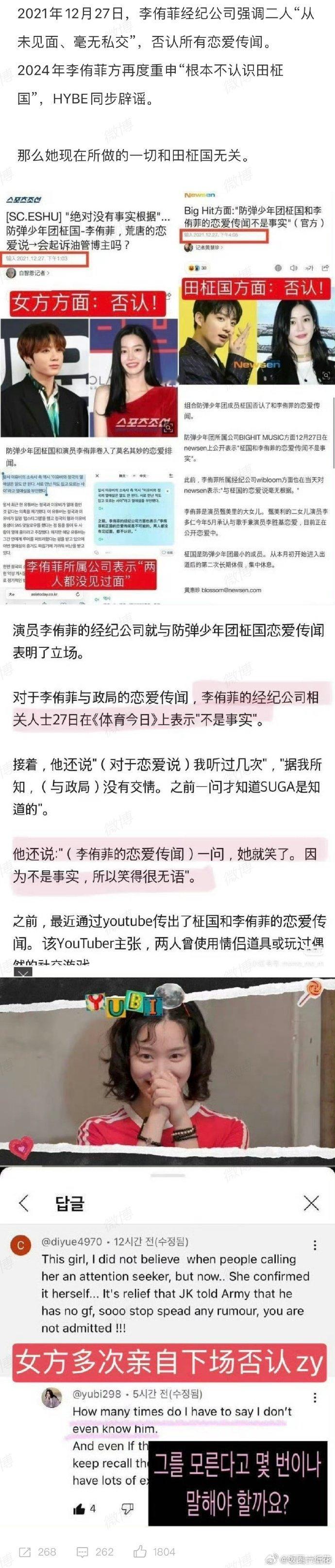 田柾国大吧发文澄清:hybe和女方公司早已否认,女方也多次声明自己完全不认识田柾国🔖
