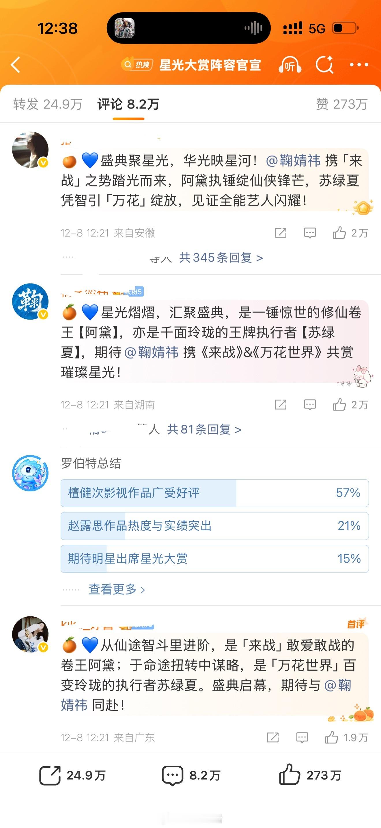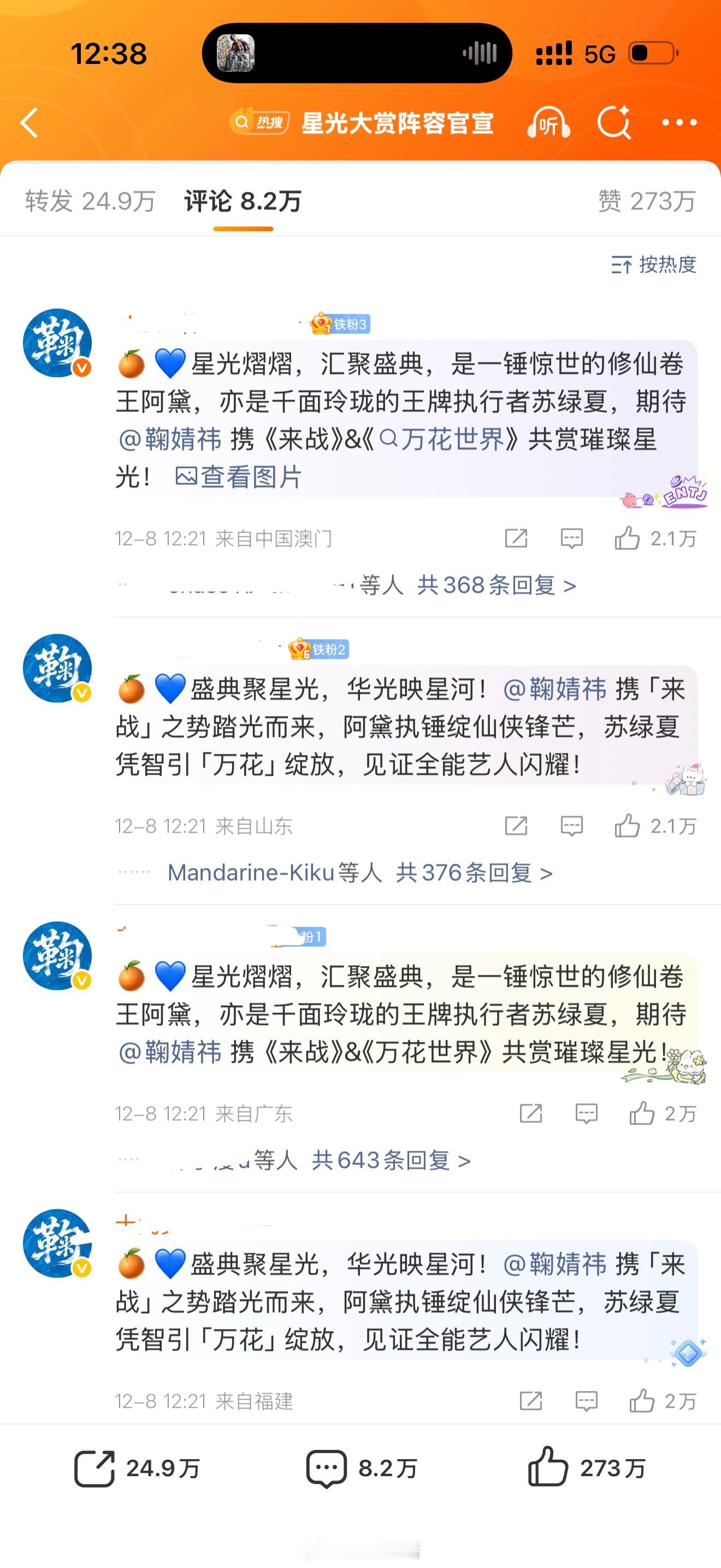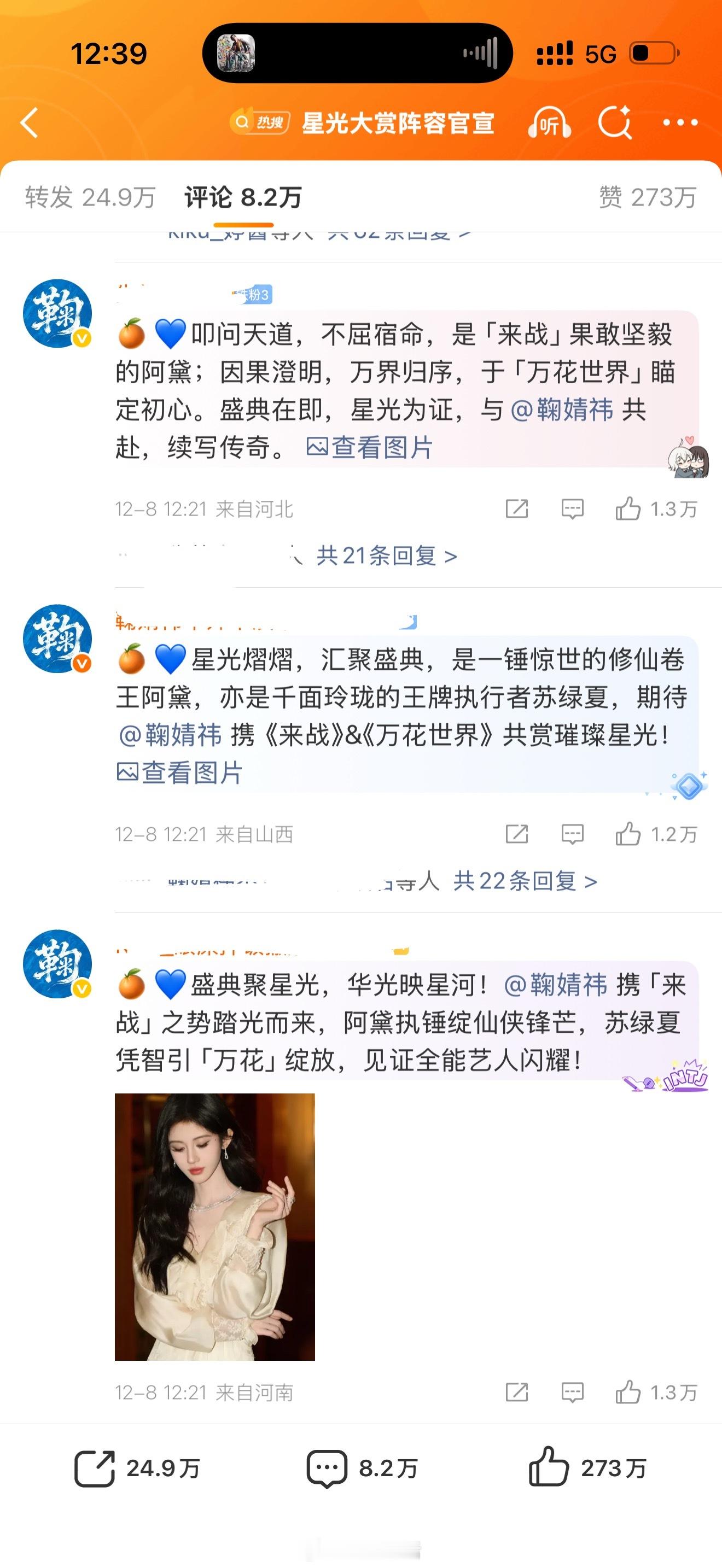 星光大赏阵容官宣评论区前十全是鞠婧祎粉丝,太厉害了。