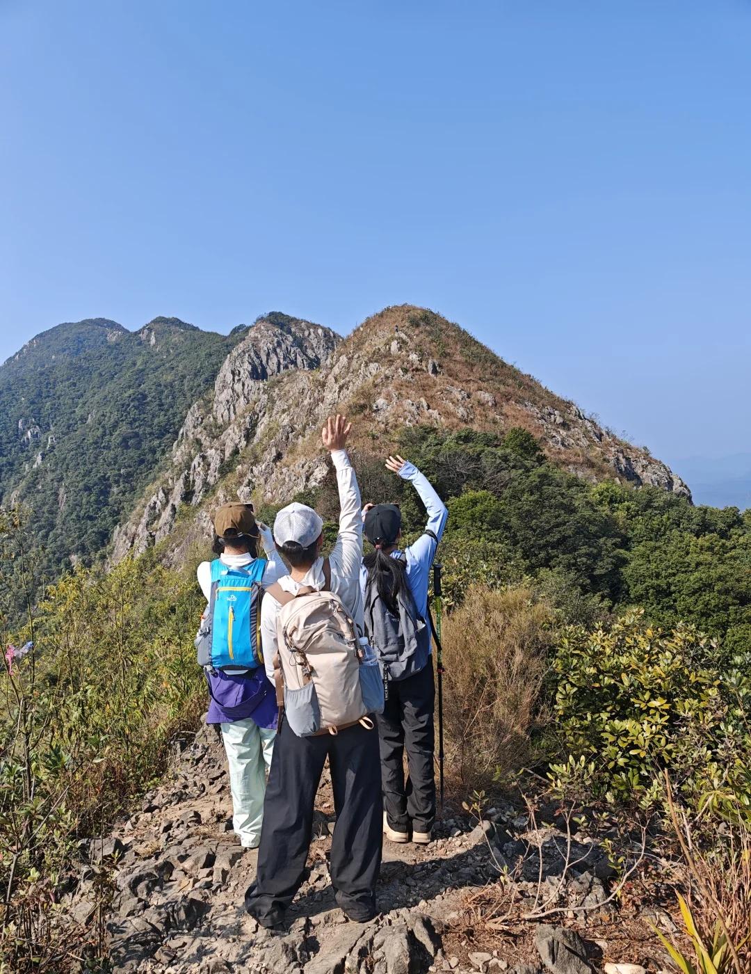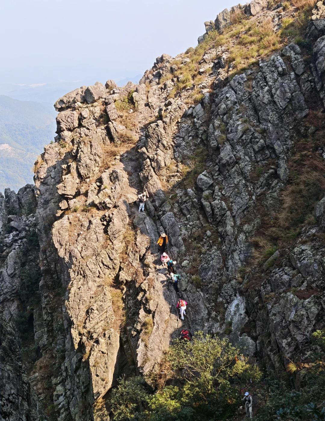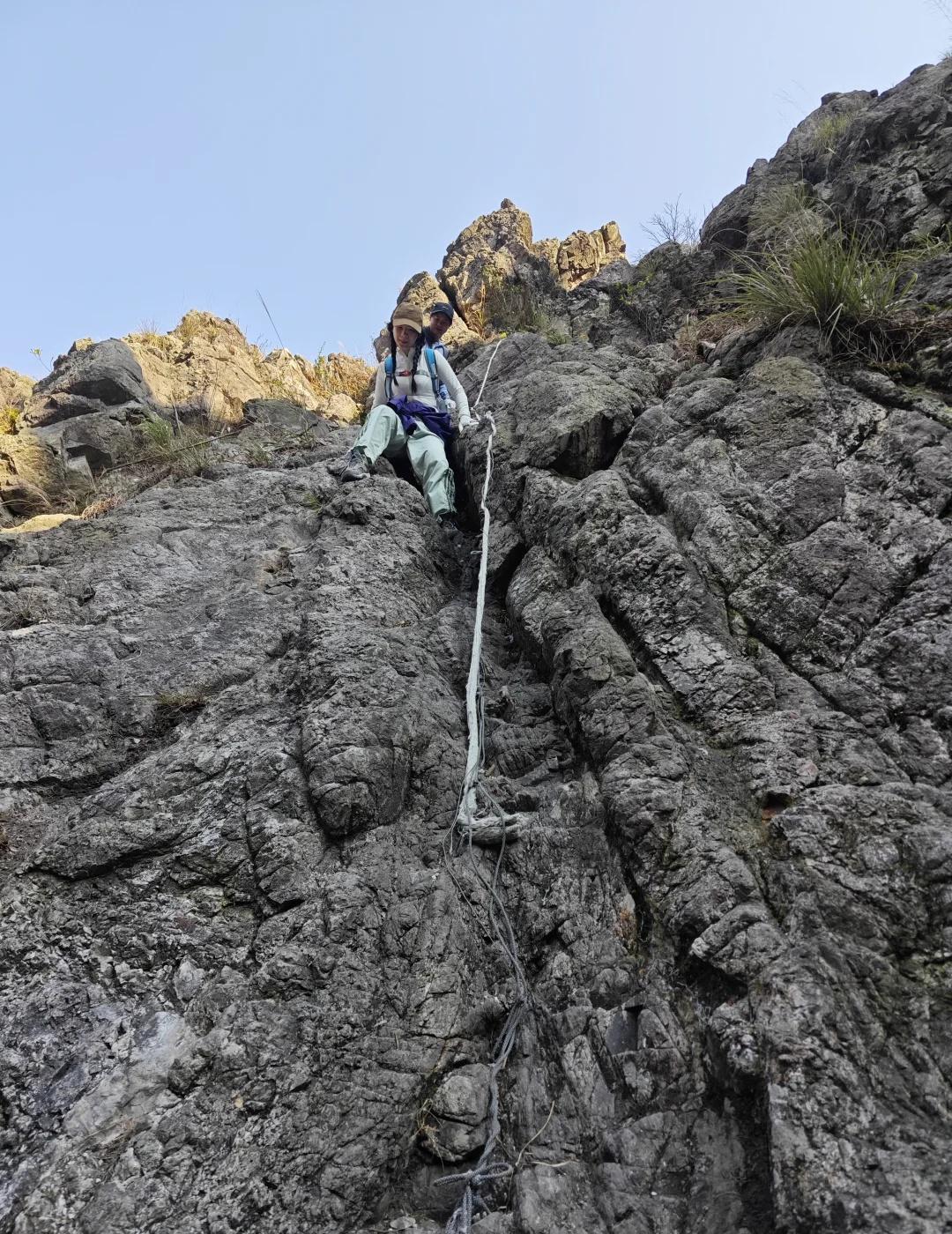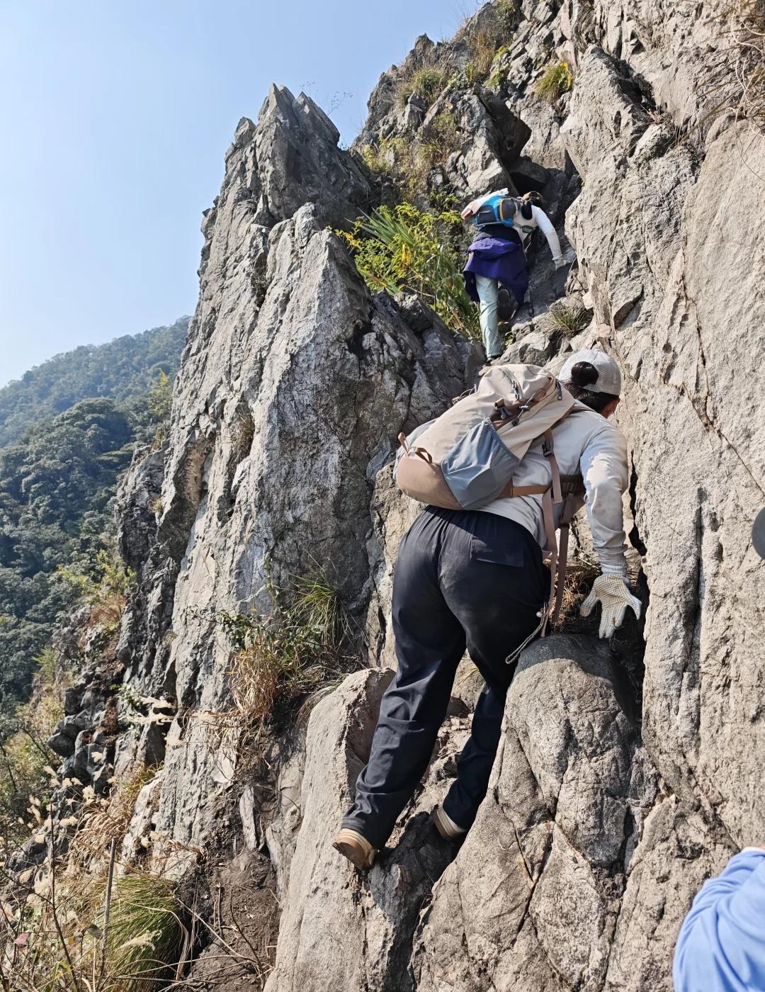 清远大帽山攀岩 广州自驾出发,导航清远市清城区樟洞村,2个小时左右到达,终点有个篮球场,周边可以免费停车。停车后,往右边水泥路走上去,有个简易洗手间,没门的。 物品准备:登山鞋、登山杖、防滑耐磨手套、长袖长裤、防晒衣、帽子、2瓶水、充饥食物、应急药物。 徒步体验:轨迹起点在溪草营,沿着水泥路走一会儿,看到一个检查点,右转土路上山。刚开始是一直爬升,碎石路和杂草藤蔓路,一个小时左右到山顶,顶不住的多休息,留好体力给最难的攀岩。到山顶就豁然开朗了,风景也好起来了,有几处悬崖边的大石头拍照挺出片的,但是需要注意安全。到达攀岩路段前,建议原地休整,吃饱喝足休息好,保证足够的体力再出发。先速降一段陡峭的岩石坡,这里有根绳子,脚踩石头手抓绳子慢慢下降,不算难。然后是攀岩,两边都是光滑的岩石,有两根绳子从上面固定好的,带上手套手紧紧抓住绳子,脚踩着石头上去。绳子很结实,完全可以放心。上去后以为最难最危险的地方过去了,谁知道还有一段无防护没绳子悬崖边的攀岩。找不到落脚发力点,手要紧紧抓住石头,打滑一次就要上神秘园,肾上激素和心率同时飙升,好在有惊无险。接下来穿越密密麻麻的小竹林,再一路下坡,泥土比较松软,容易打滑摔跤,注意安全。全程8公里左右,爬升700米,强度不大,但是难度危险系数大,新手小白不建议去,尤其是不要带小孩子去。徒步丈量世界 #清远大帽山