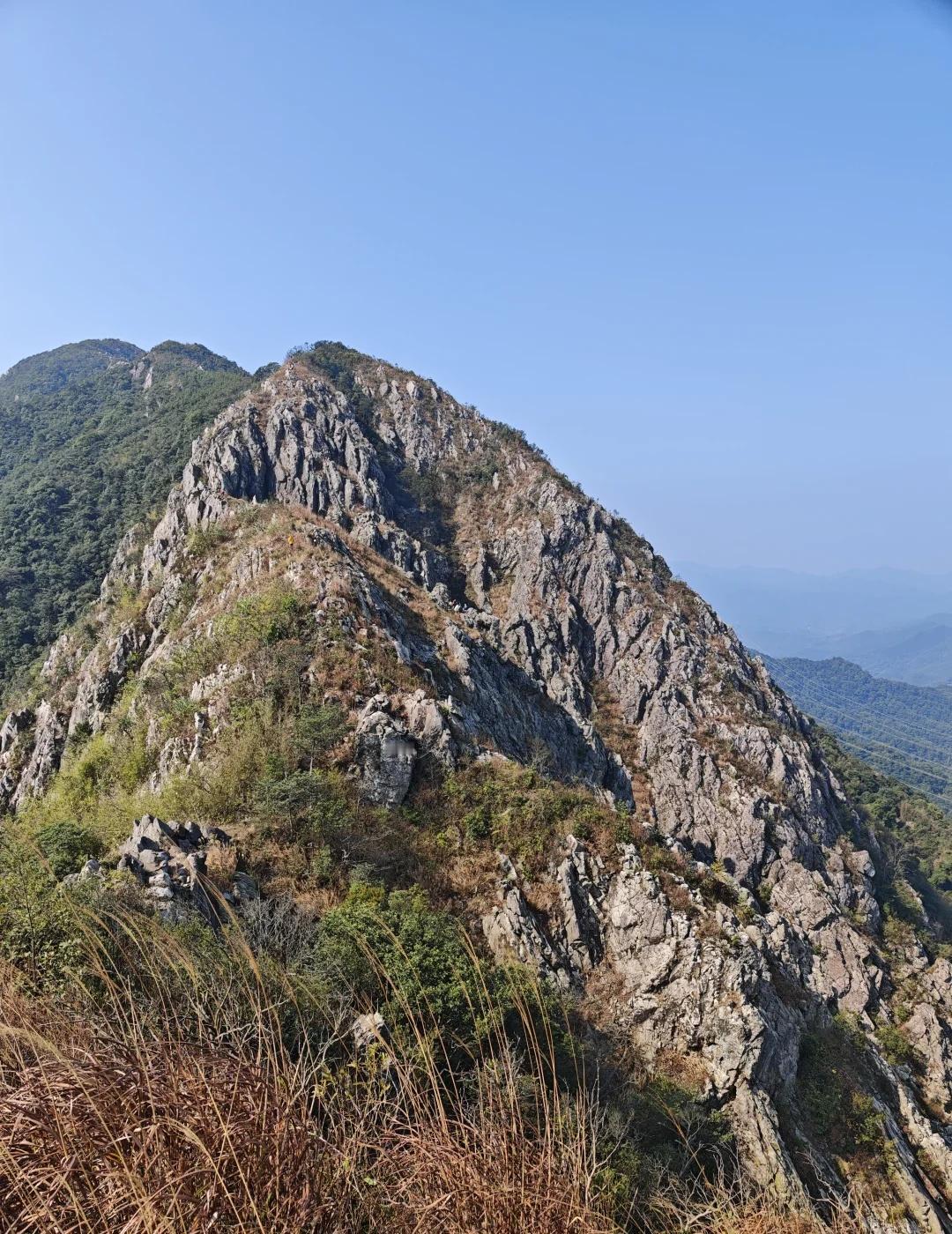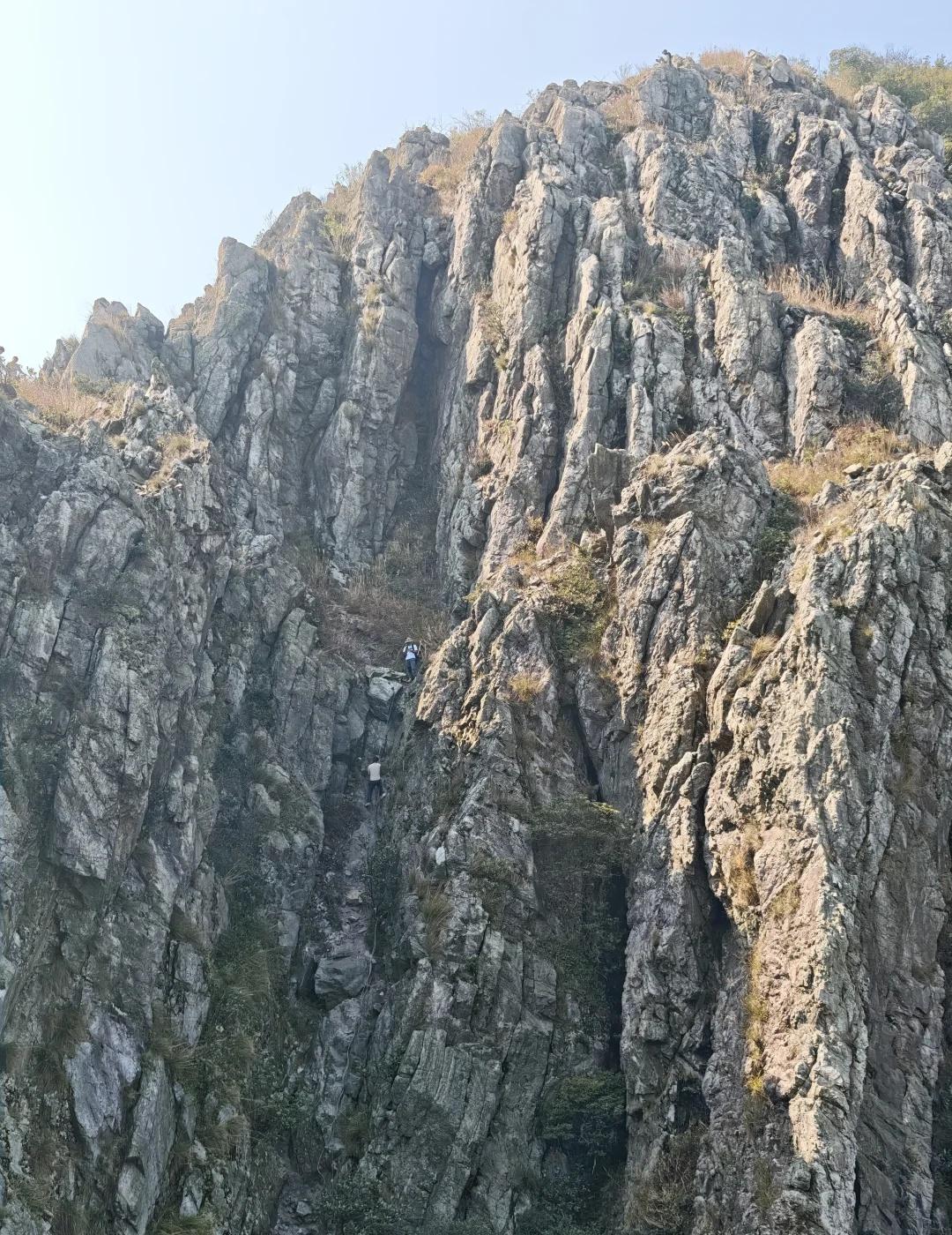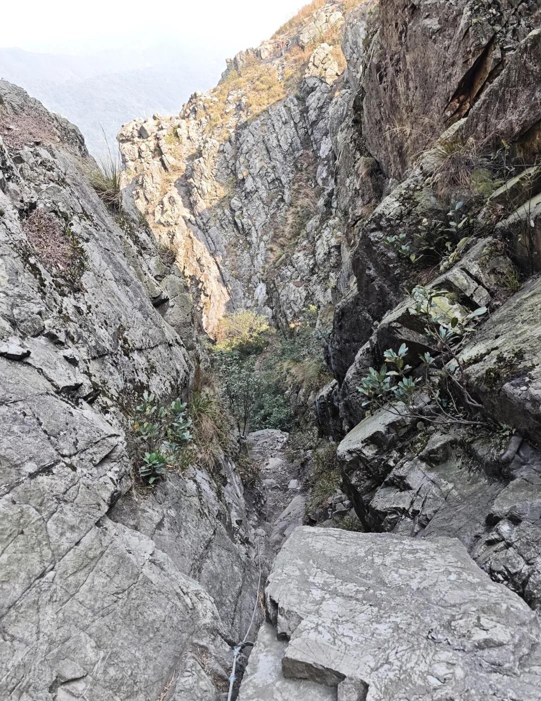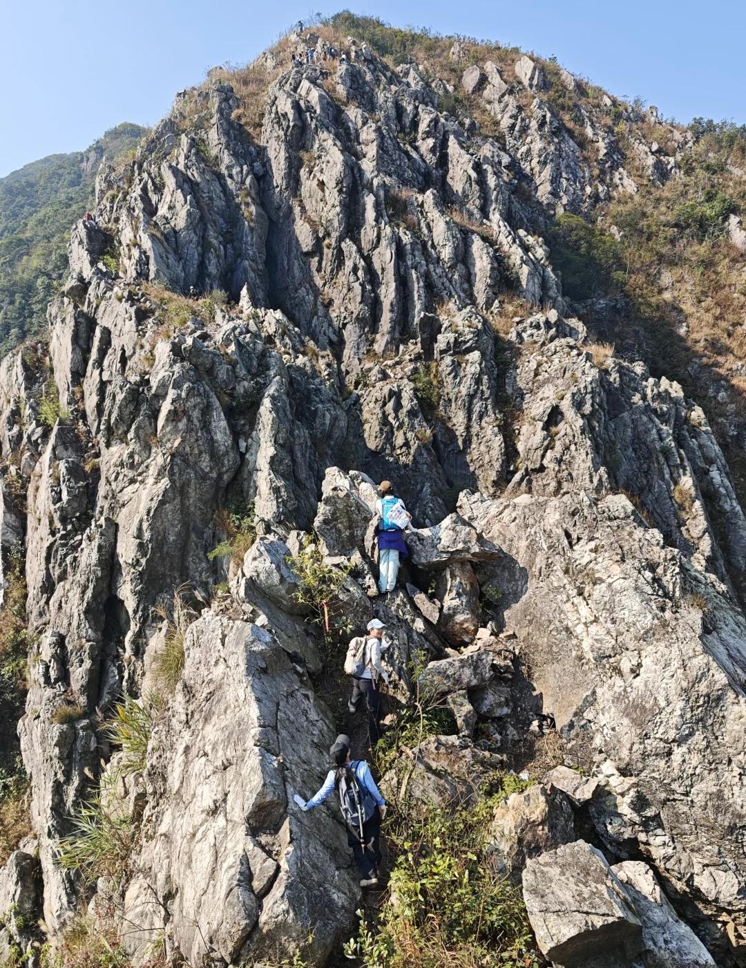 清远大帽山攀岩 广州自驾出发,导航清远市清城区樟洞村,2个小时左右到达,终点有个篮球场,周边可以免费停车。停车后,往右边水泥路走上去,有个简易洗手间,没门的。 物品准备:登山鞋、登山杖、防滑耐磨手套、长袖长裤、防晒衣、帽子、2瓶水、充饥食物、应急药物。 徒步体验:轨迹起点在溪草营,沿着水泥路走一会儿,看到一个检查点,右转土路上山。刚开始是一直爬升,碎石路和杂草藤蔓路,一个小时左右到山顶,顶不住的多休息,留好体力给最难的攀岩。到山顶就豁然开朗了,风景也好起来了,有几处悬崖边的大石头拍照挺出片的,但是需要注意安全。到达攀岩路段前,建议原地休整,吃饱喝足休息好,保证足够的体力再出发。先速降一段陡峭的岩石坡,这里有根绳子,脚踩石头手抓绳子慢慢下降,不算难。然后是攀岩,两边都是光滑的岩石,有两根绳子从上面固定好的,带上手套手紧紧抓住绳子,脚踩着石头上去。绳子很结实,完全可以放心。上去后以为最难最危险的地方过去了,谁知道还有一段无防护没绳子悬崖边的攀岩。找不到落脚发力点,手要紧紧抓住石头,打滑一次就要上神秘园,肾上激素和心率同时飙升,好在有惊无险。接下来穿越密密麻麻的小竹林,再一路下坡,泥土比较松软,容易打滑摔跤,注意安全。全程8公里左右,爬升700米,强度不大,但是难度危险系数大,新手小白不建议去,尤其是不要带小孩子去。徒步丈量世界 #清远大帽山