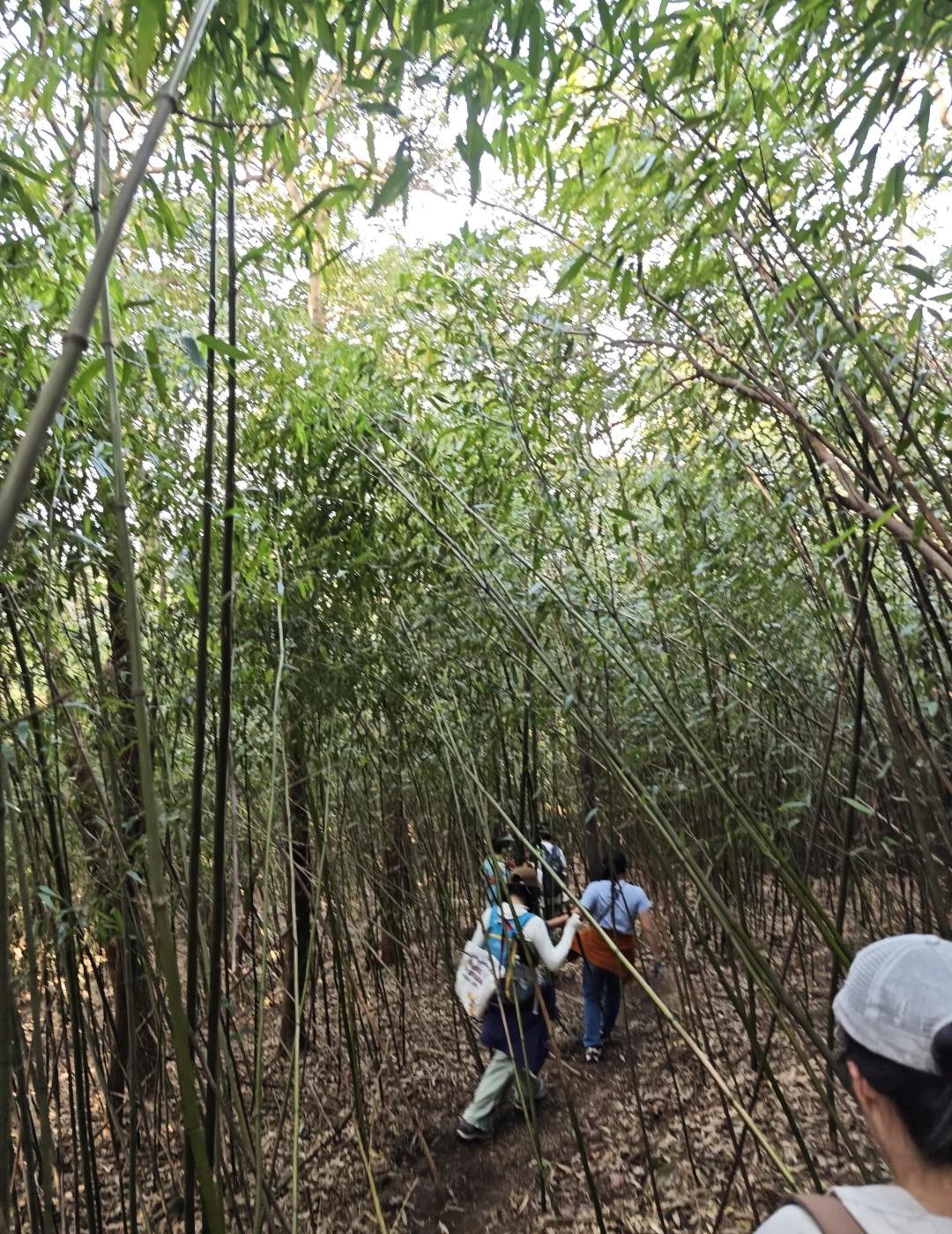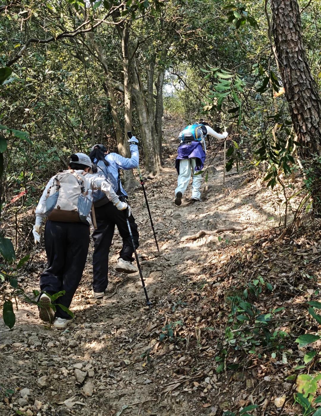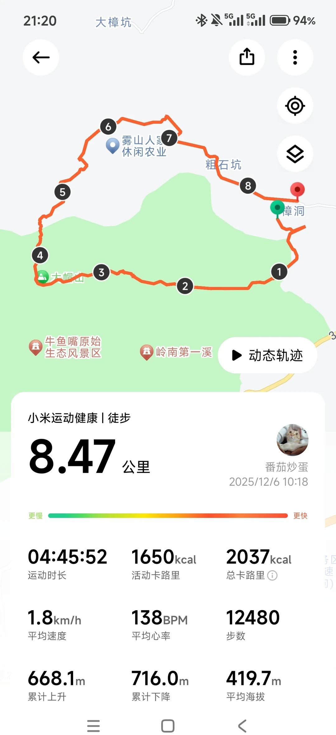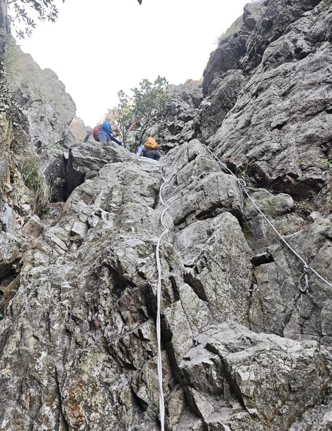 清远大帽山攀岩 广州自驾出发,导航清远市清城区樟洞村,2个小时左右到达,终点有个篮球场,周边可以免费停车。停车后,往右边水泥路走上去,有个简易洗手间,没门的。 物品准备:登山鞋、登山杖、防滑耐磨手套、长袖长裤、防晒衣、帽子、2瓶水、充饥食物、应急药物。 徒步体验:轨迹起点在溪草营,沿着水泥路走一会儿,看到一个检查点,右转土路上山。刚开始是一直爬升,碎石路和杂草藤蔓路,一个小时左右到山顶,顶不住的多休息,留好体力给最难的攀岩。到山顶就豁然开朗了,风景也好起来了,有几处悬崖边的大石头拍照挺出片的,但是需要注意安全。到达攀岩路段前,建议原地休整,吃饱喝足休息好,保证足够的体力再出发。先速降一段陡峭的岩石坡,这里有根绳子,脚踩石头手抓绳子慢慢下降,不算难。然后是攀岩,两边都是光滑的岩石,有两根绳子从上面固定好的,带上手套手紧紧抓住绳子,脚踩着石头上去。绳子很结实,完全可以放心。上去后以为最难最危险的地方过去了,谁知道还有一段无防护没绳子悬崖边的攀岩。找不到落脚发力点,手要紧紧抓住石头,打滑一次就要上神秘园,肾上激素和心率同时飙升,好在有惊无险。接下来穿越密密麻麻的小竹林,再一路下坡,泥土比较松软,容易打滑摔跤,注意安全。全程8公里左右,爬升700米,强度不大,但是难度危险系数大,新手小白不建议去,尤其是不要带小孩子去。徒步丈量世界 #清远大帽山