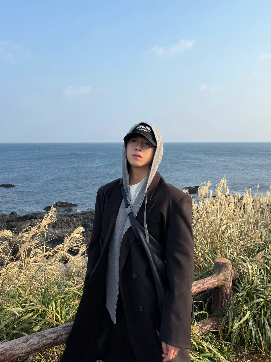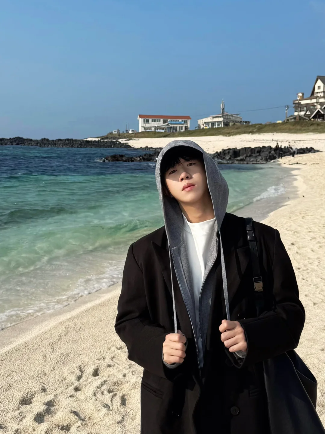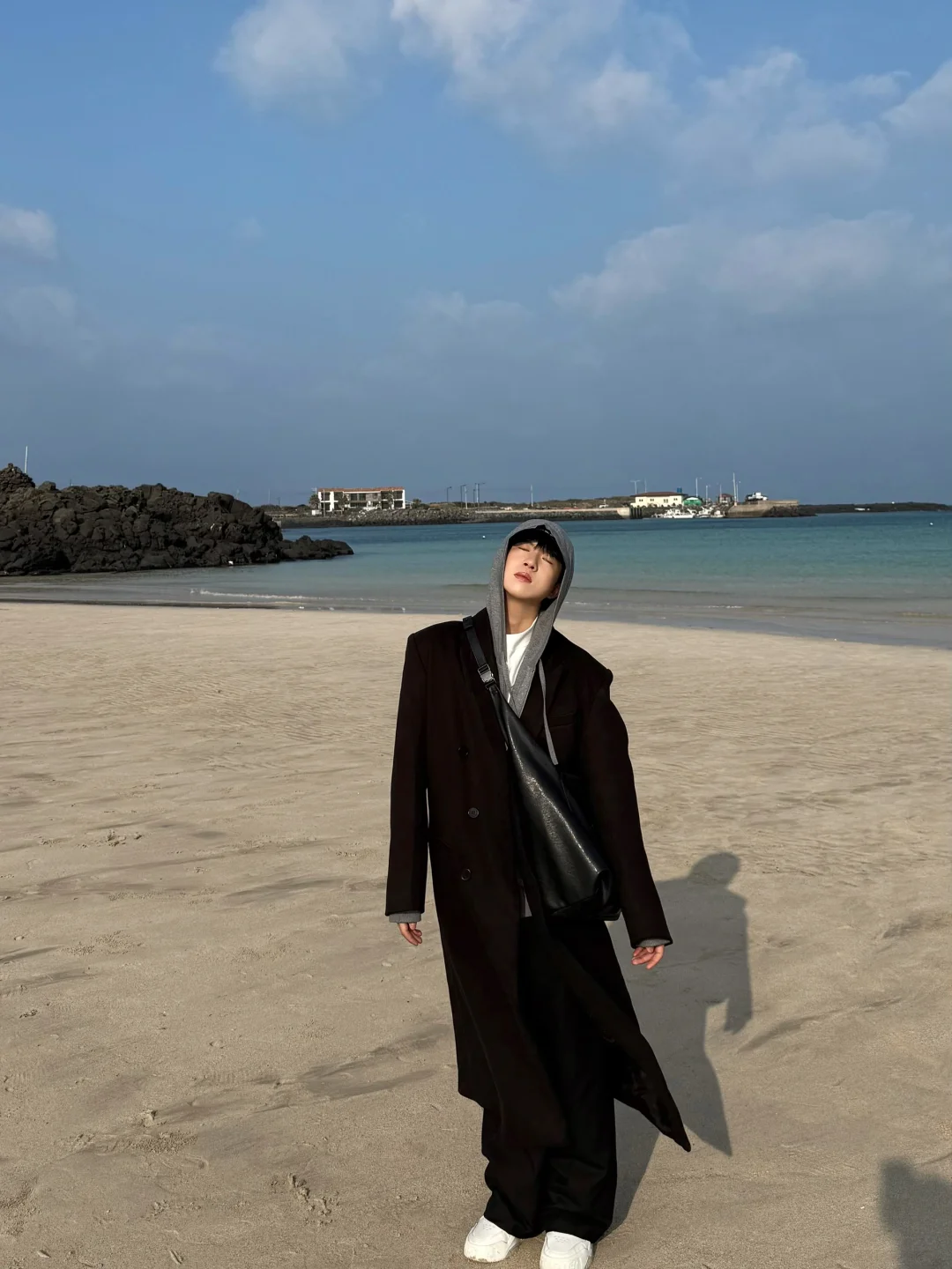 去牛岛上环岛骑行了 果冻海太美了 随便拍拍都很韩系 今日搭配跟着「难哄」剧中白敬亭,学习廓形搭配 ——————————————————
