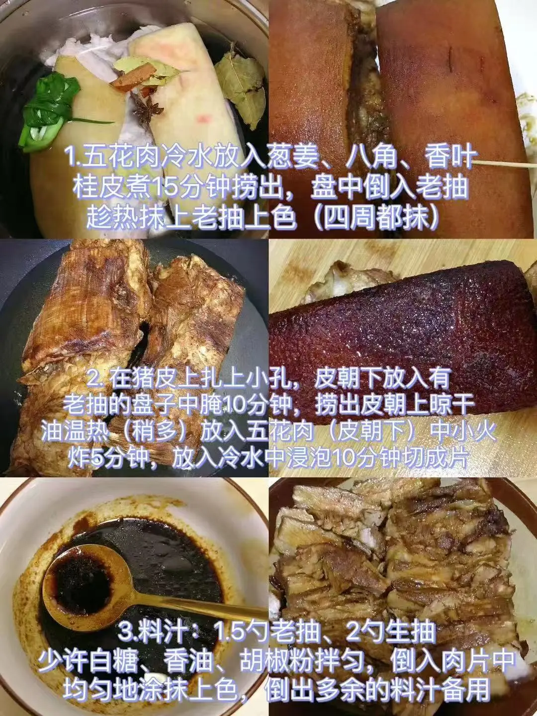 2.猪皮上扎上小孔(牙签/叉子),皮朝下放入有老抽的盘子中腌10分钟,捞出皮朝上晾干,油温热(稍多)放入五花肉(皮朝下)中小火炸5分钟,再放入冷水中浸泡10分钟切成片