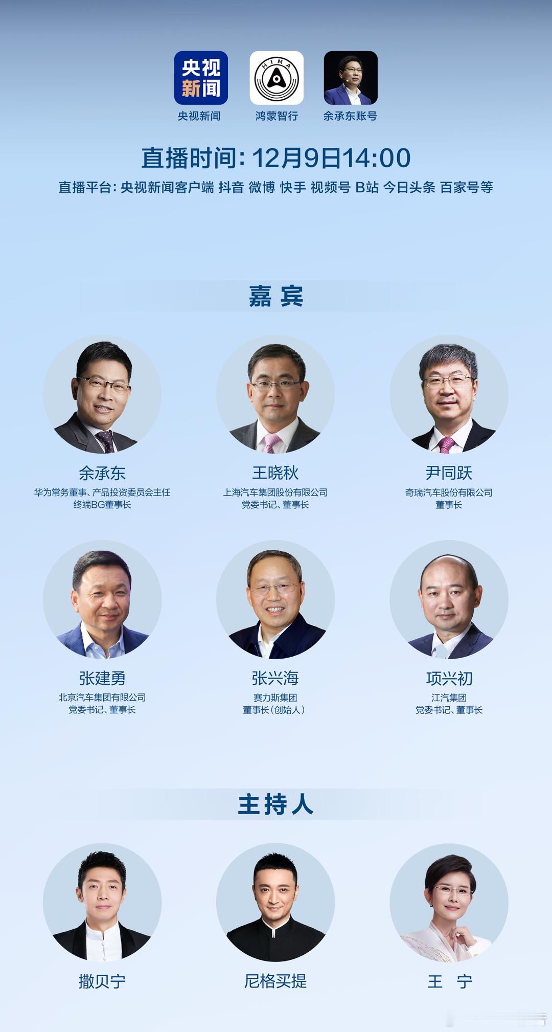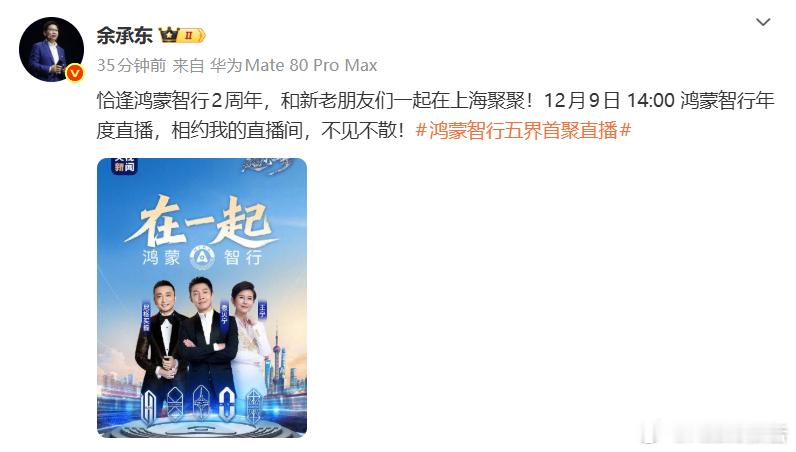 鸿蒙智行年度直播定档12月9日12月8日,华为余承东宣布,鸿蒙智行2周年,和新老朋友们一起在上海聚会,鸿蒙智行年度直播将于12月9日14:00开启。鸿蒙智行旗下共有问界、智界、享界、尊界、尚界等五大品牌,涵盖15万-100万元各细分市场。鸿蒙智行五界首聚直播鸿蒙智行新能源汽车