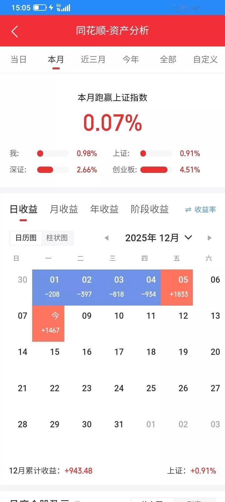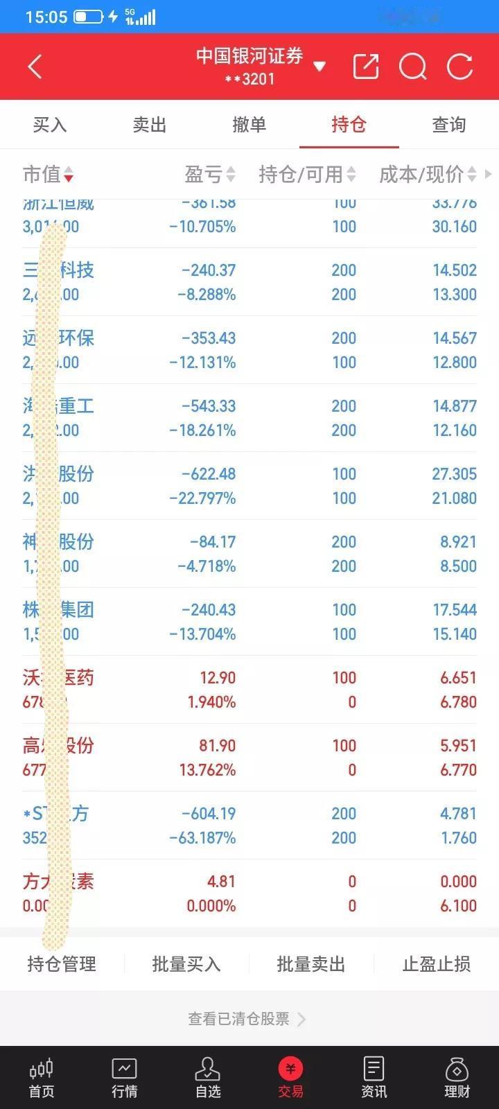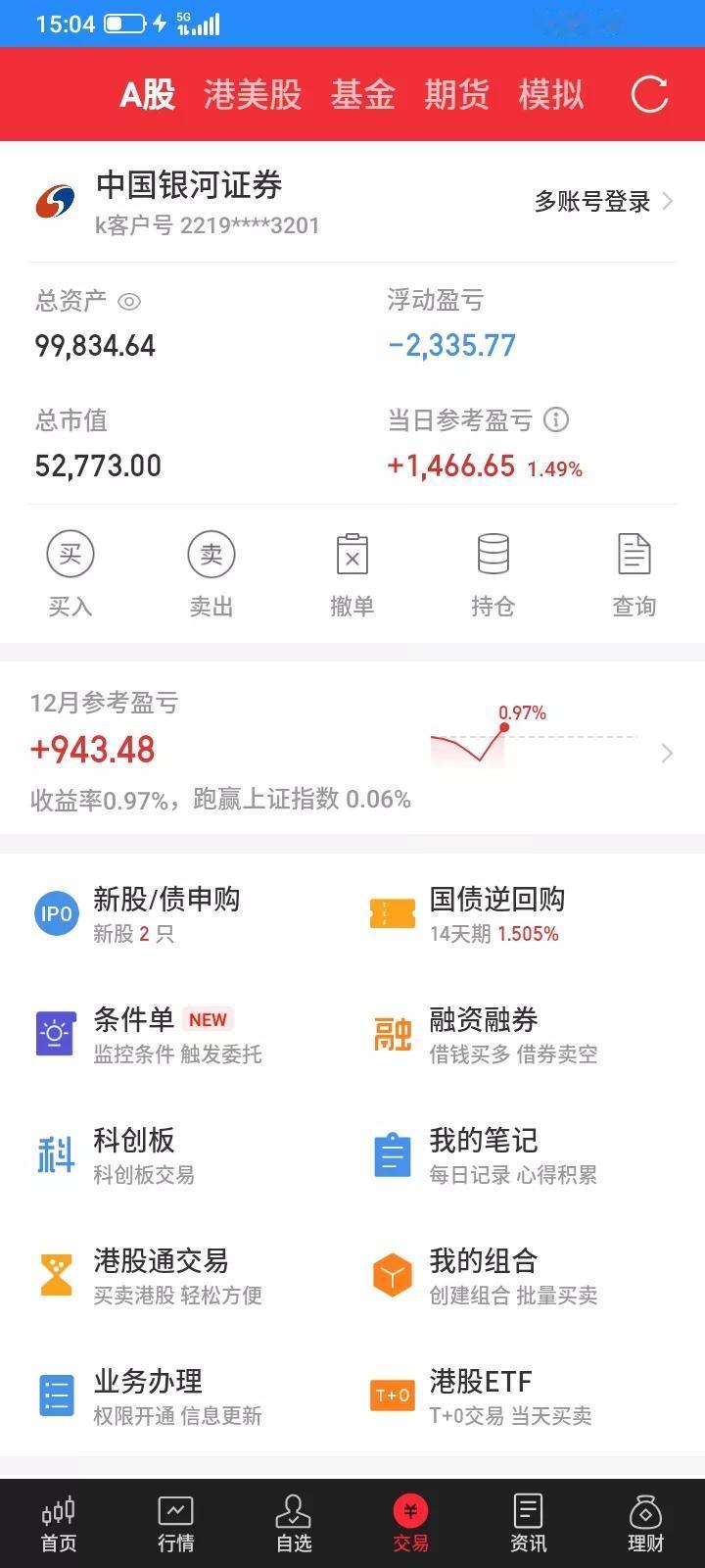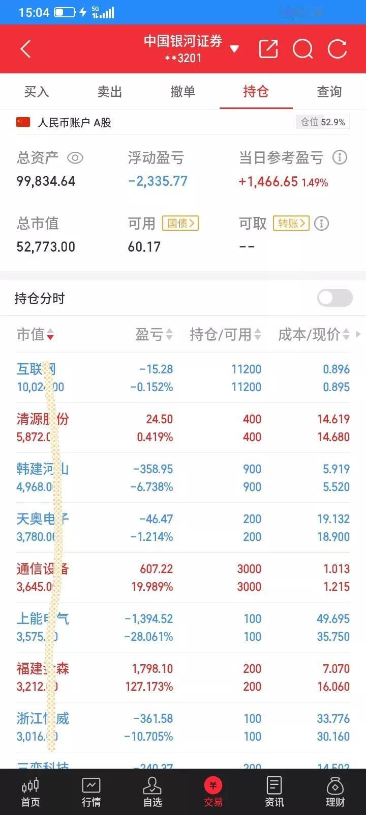 2025.12.08,今天继续全面反弹,但是我胆小了,前几天止损了一些,今天开盘又卖掉一些,仓位大为降低,少赚了很多钱。周五买入的通信设备etf,高开,怕又是诱多,跌下来又是浮盈一场,于是高开就卖出吧,集合竞价以1.152卖掉3200股,差价0.018元,赚57块钱,但是卖错了,卖在最低价,卖掉之后不断上涨,最高1.233,但是收盘跌下来了,又是浮盈而已,按照计划应卖出1.3万股,但是持仓不够,改变计划,收盘以1.215卖掉3800股,赚300块钱,开盘不卖就还要多赚两百多块钱,单边上涨,网格交易一下子就把筹码卖完了,留下3000股,再上涨再逐步卖出,下跌就重新买回来。 互联网今天下跌,还是按照计划,收盘以0.895买入1000股。 早上上能又是低开低走,怕继续下跌,于是以35块止损卖掉100股,又被洗出来了,卖在最低价,卖掉之后就上涨了,最高冲到36.01,少卖了100块钱,收盘跌下来一点点,给我一点点安慰,还是少卖了70多块钱。还是太胆小了。 看到远达不断上涨,想做个t,下午于是委托12.80买入100股,回落中成交了,还继续下跌了几分钱,收盘收在12.80,还是按照计划卖掉吧,以12.80卖掉,亏了1块钱印花税和佣金。 方大继续下跌,曾经赚200多块钱,但是没有及时止盈,下跌中还补仓了,不断下跌,利润已经全部回撤完了,保本第一,放弃幻想,错了及时认错,早上以5.11清仓卖掉最后的300股,持有了很久了,还是保本离场。总比亏钱好,就当没有买过这只股票吧。 金森不负众望,今天15.80开盘,又快速涨停了,不能太贪心了,逐步卖掉吧,以涨停价16.06卖掉200股,留下200股继续再格局一下,让利润继续奔跑,跌下来又再买回来。 很久没有重新新建仓了,昨天挑选了3只股票,开盘以低于周五收盘价一分钱分别买入100股,一只高开没有成交,2只低开成交了,以5.95成交买入100股高乐,今天多次封住涨停板,但是都没有维持多久,还是破板了,收盘上涨了9个点,暂时浮盈80块钱。以6.65买入100股沃华,收盘浮盈12块钱。 其它的都上涨不多,继续持股待涨,管住手,抵制住恐惧和贪婪 ,再等待一两天再逐步减仓。 今天总市值5.27万元,总资产9.98万元,今天总体账户反弹回本1465元,这个月终于红了。希望好运继续。