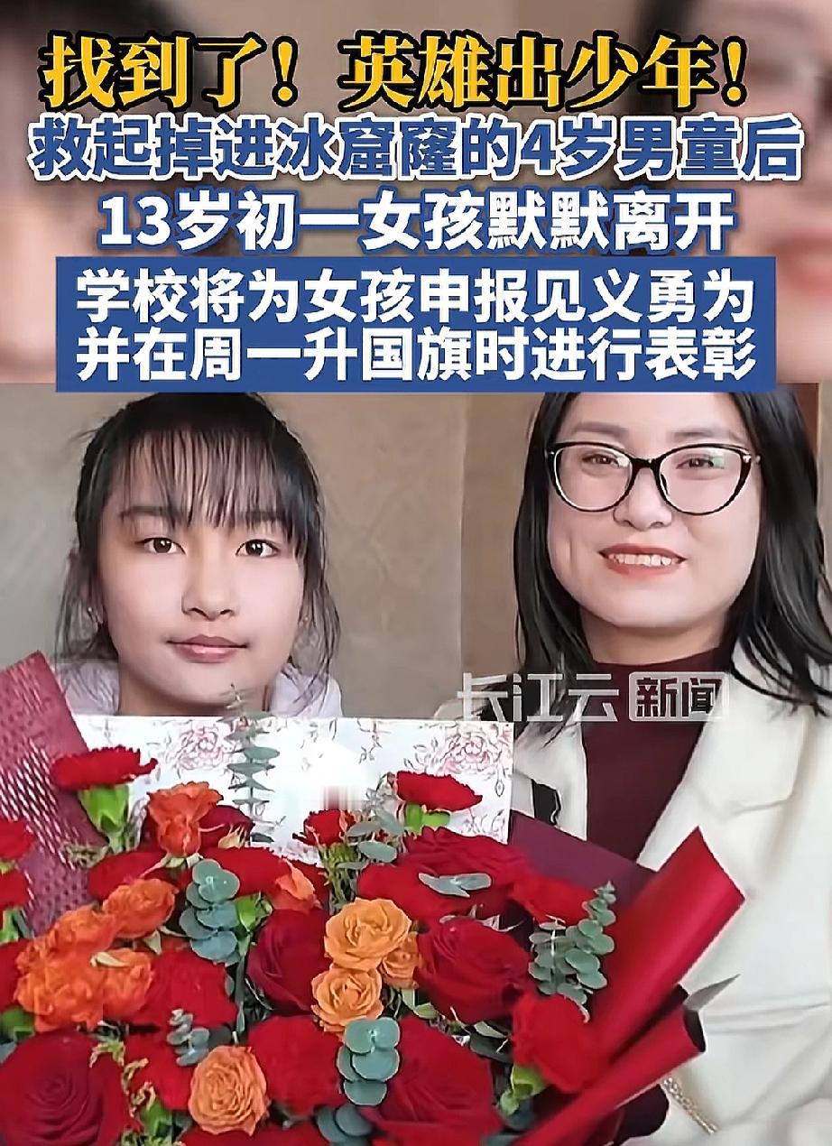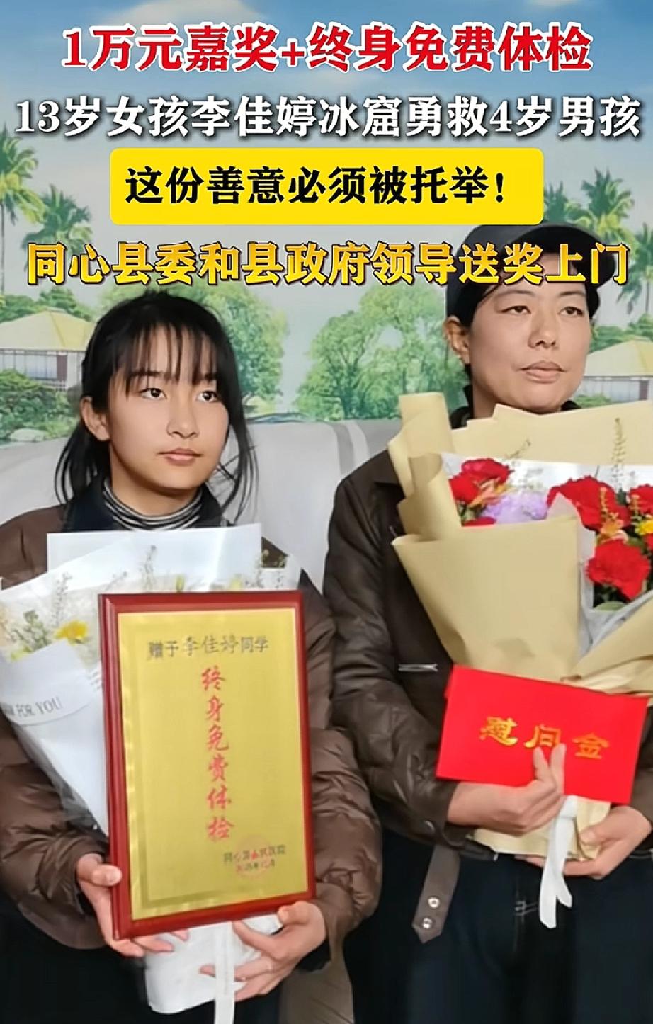 藏不住的善良!12月6日,在宁夏同心县有名4岁的男孩,玩耍时跌入了结冰的湖水之中。 冰面很薄,围观的大人也无能为力。这时,一名身穿校服的女孩站了出来,大喊着:“我身体轻,我来救”。 女孩拿着大人们找来的管子,匍匐向男孩爬去,把生的希望递到了男孩身边,过程中她自己也落了水,可她始终抓着管子不放,被拉上来时,浑身已湿透。 待消防员把男孩救起时,女孩早已悄悄离开了现场,没有留名,也没有等一句感谢。 视频发到网上后,大家都在寻找这位小英雄,很快女孩的信息就被找到了。 她叫李佳婷,今年13岁,是一名初一学生。而她救人的事,家里人完全不知情。她为了不让家里人担心,撒了个小谎:“衣服是消防车淋湿的”。 事后,被救男孩的家长上门感谢,学校上门慰问要给她开全校表彰和申报见义勇为,县政府领导送奖上门(一万元嘉奖+终身免费体检),官媒也点名表扬。 救人不留名,也没到处炫耀,这是刻在骨子里的善良,这样的善意就应该被托举。为李佳婷的勇敢、乐于助人的品质点赞。 不过,这里也要提醒大家,救人是好事,但也要保证自己的安全。
