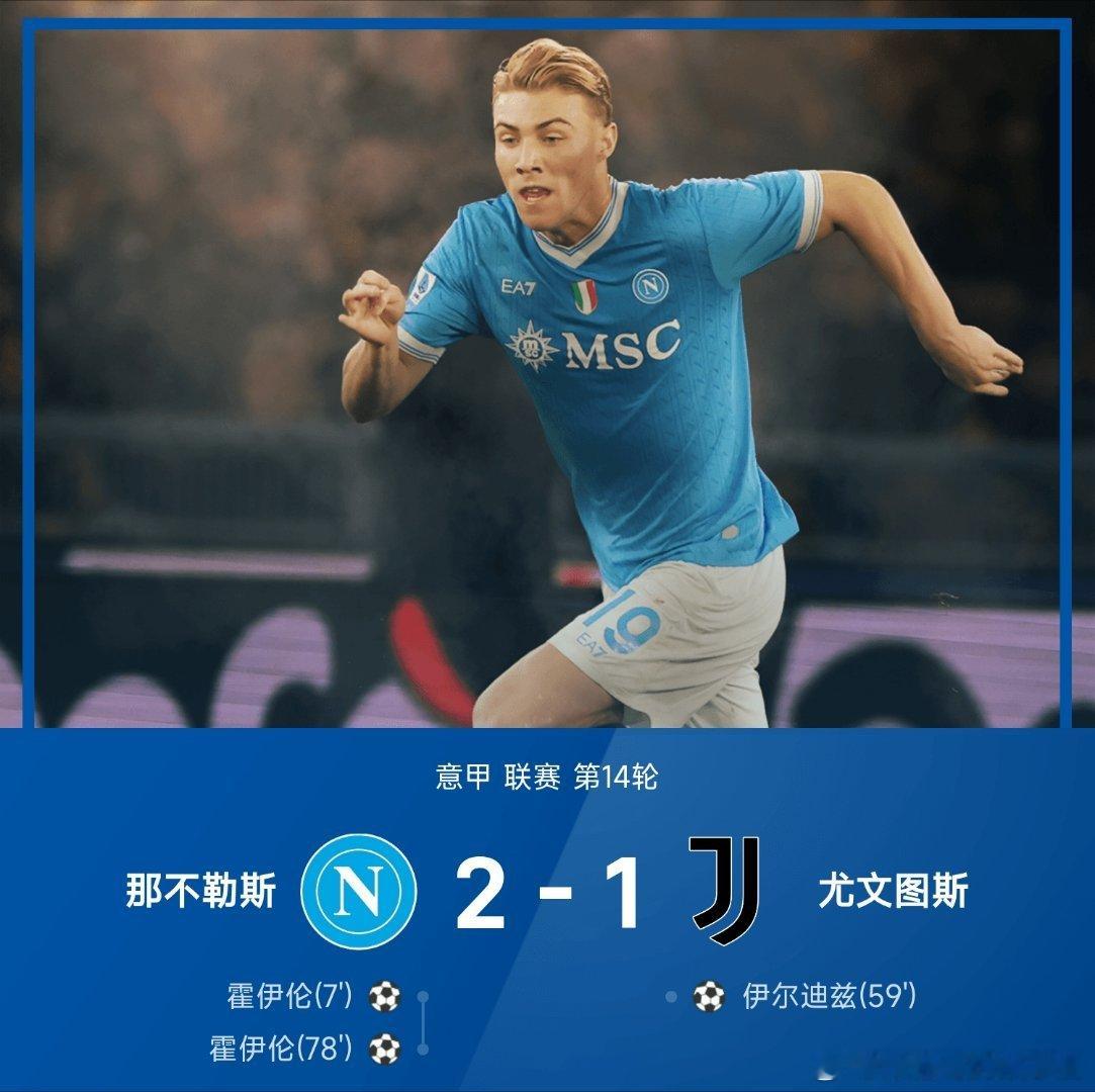 ⚽意甲战报:12月08日讯 25/26赛季意甲联赛第14轮,那不勒斯2-1战胜尤文图斯。开场仅7分钟,霍伊伦破门帮助那不勒斯取得领先。易边再战,伊尔迪兹第59分钟破门帮助尤文扳平比分。第78分钟,霍伊伦头球破门,完成梅开二度,帮助那不勒斯再度取得领先。最终那不勒斯主场2-1击败尤文,重新回到意甲榜首。7’霍伊伦抢点破门,那不勒斯1-0尤文59’伊尔迪兹小角度破门,那不勒斯1-1尤文78’麦肯尼乌龙助攻,霍伊伦头球破门,那不勒斯2-1尤文常规事件6’麦克托米奈禁区头球攻门,皮球击中边网21’伊尔迪兹起脚远射,皮球离谱打偏26’迪洛伦佐禁区头球攻门,尤文门将将球托出底线33’黄牌-布翁焦尔诺(那不勒斯) 犯规34’凯利禁区抢点打门,皮球打飞出界52’黄牌-卡卢卢(尤文图斯) 犯规55’麦克托米奈任意球直接打门,皮球稍稍偏出70’黄牌-别克马(那不勒斯) 犯规75’孔塞桑被换下,米雷蒂替补登场