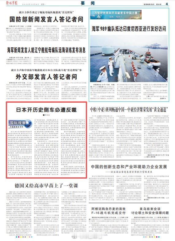 【国际观察 | 日本开历史倒车必遭反噬】近日,继日本首相高市早苗公然抛出涉台挑衅言论、暗示武力介入台海局势后,日本政府又接连做出一系列倒行逆施之举:批准补充预算案,将2025财年防卫开支占国内生产总值的比例提升至2%;企图在与台湾邻近的西南诸岛部署进攻性武器;推动杀伤性武器出口……凡此种种危险行径,无一不与“和平宪法”背道而驰。这不仅严重冲击中日关系,破坏战后国际秩序,更对亚洲乃至世界和平稳定构成严重威胁。这种开历史倒车的挑衅行径,终将反噬自身。在中日关系上,不容开历史倒车。1972年中日邦交正常化之际,日本即已宣布承认一个中国原则。此后,中日四个政治文件对台湾问题作出的明确规定,更是日本政府作出的政治承诺。高市早苗本人在10月底还曾表示:“在台湾问题上,日本将坚持1972年日中联合声明中的立场。”然而,言犹在耳,她却出尔反尔,抛出“台湾有事”可能构成“存亡危机事态”的荒谬论调。这清晰地表明,日本在台湾问题上的立场出现严重倒退。以高市早苗为代表的日本右翼势力,企图“以台制华”,其行径不仅公然违背了中日四个政治文件的精神,更严重损害了中日关系政治基础,激起中国人民的强烈愤慨。中国爱好和平、重信守义,但在事关国家主权和领土完整的大是大非问题上,任何人妄想挑战中国人民底线,必将遭到中方的迎头痛击!在国际秩序上,不容开历史倒车。第二次世界大战是人类历史上一场空前浩劫。战后,国际社会携手建立了以联合国为核心的国际体系、以国际法为基础的国际秩序,为世界和平发展奠定了基础。《开罗宣言》《波茨坦公告》《日本投降书》等国际法律文件明确禁止日本重新武装,而日本也在其“和平宪法”中郑重承诺“永远放弃以国权发动的战争、武力威胁或武力行使作为解决国际争端的手段”。这些,都是日本必须承担的国际法义务。台湾回归中国,是二战胜利成果和战后国际秩序的重要组成部分。然而,时至今日,高市早苗对这一系列具有充分国际法效力的文件避而不谈,却唯独突出非法无效的“旧金山和约”,甚至妄图煽炒所谓“台湾地位未定论”。这无疑是错上加错!日本无视联合国权威,公然挑战战后国际秩序和国际法基本准则。这股危险的逆流,必将遭到国际社会的强烈反对与坚决遏阻。在和平发展道路上,不容开历史倒车。战后日本之所以能够实现经济复苏与繁荣,根本在于其选择了和平发展之路,并向世界作出了“永不再战”的郑重承诺。这一承诺,是日本重返国际社会的基石,也是其立足世界的根本保障。然而,日本右翼势力却一直试图摧毁这一基石。二战结束以来,日本右翼势力从未放弃“政治大国梦”和“军事大国梦”。他们极力否认和美化侵略历史,还处心积虑地架空“和平宪法”,突破“专守防卫”原则,妄图重演军国主义的老剧本,加速迈向“能战之国”。包括中国在内的亚洲乃至世界人民,永远不会忘记日本军国主义制造的惨重灾难,绝不允许日本军国主义幽灵再次为祸人间!警钟已经敲响,悲剧不能重演。如果日本执意要开历史倒车,背弃和平发展的承诺,重走军国主义侵略扩张的邪路,破坏战后国际秩序,最终只能是自取灭亡。(解放军报)