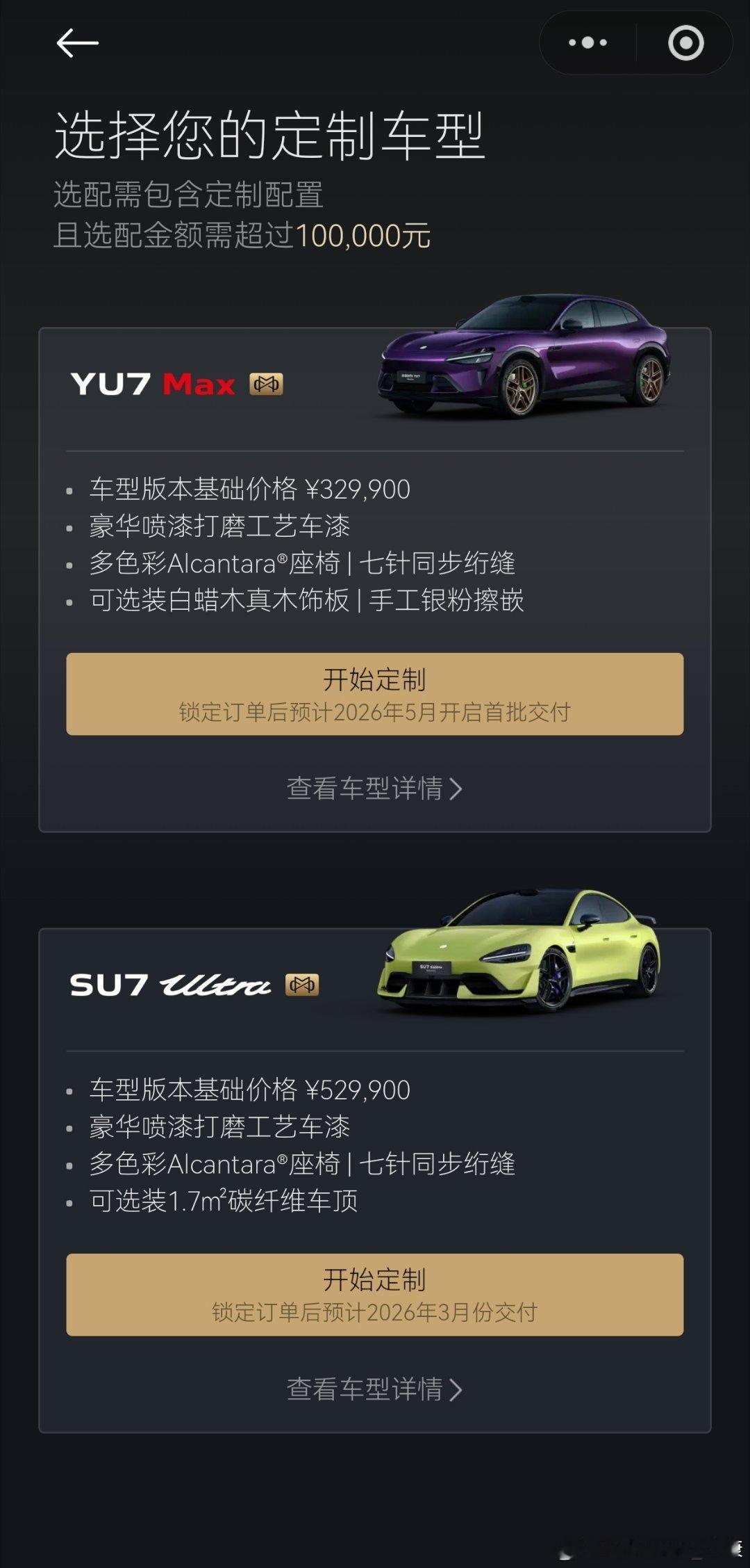 看了一下小米定制服务,SU7 Ultra至少62万才能落地,YU7 Max稍微便宜点,43万就能落地了。按交付时间看,YU7 Max要等到明年年中。
