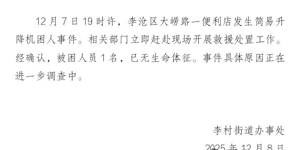 12月8日,青岛市李沧区李村街道办事处通报,12月7日19时许,李沧区大崂路一便利店发生简易升降机困人事件。相关部门立即赶赴现场开展救援处置工作。经确认,被困人员1名,已无生命体征。事件具体原因正在进一步调查中。