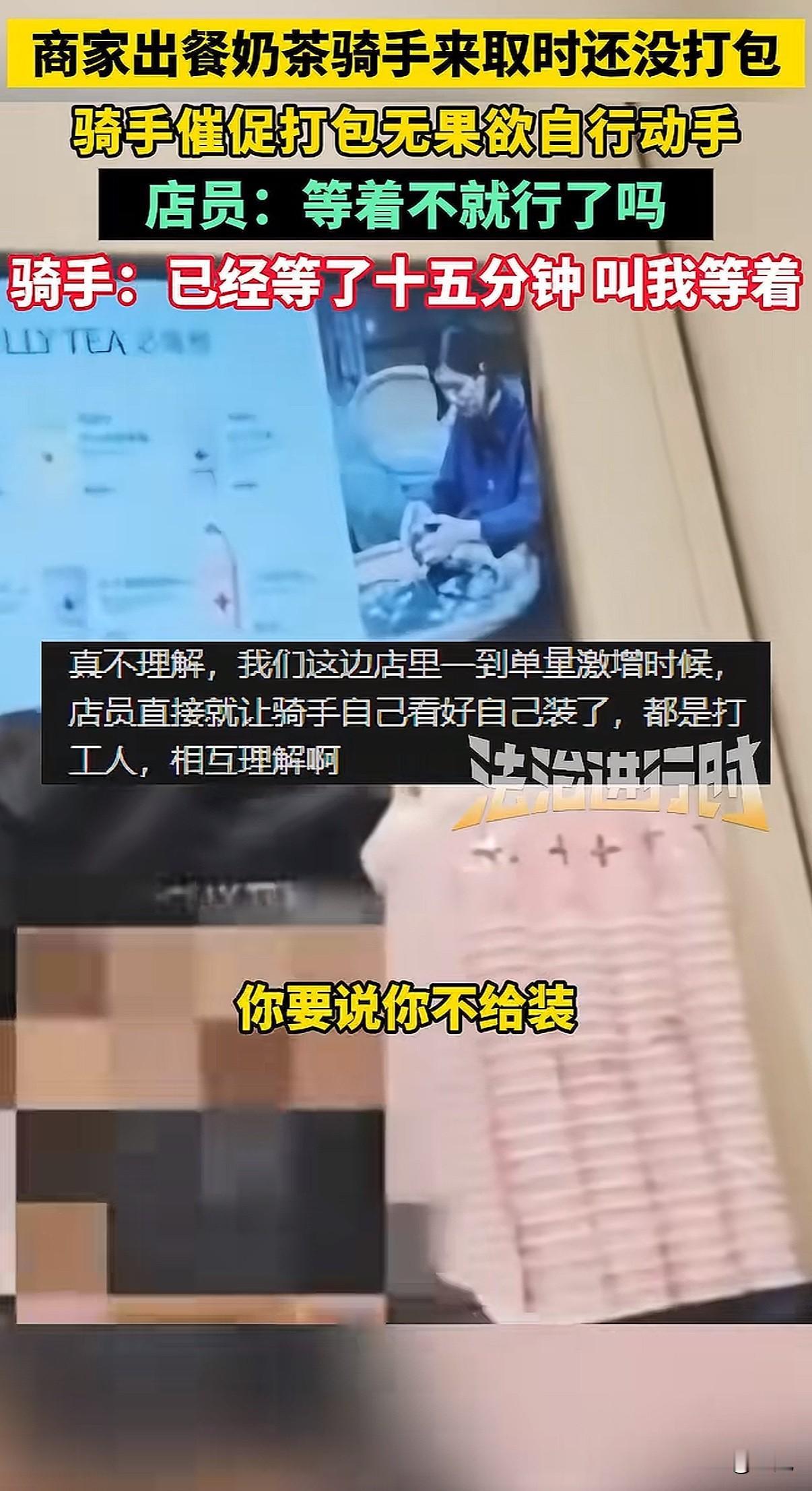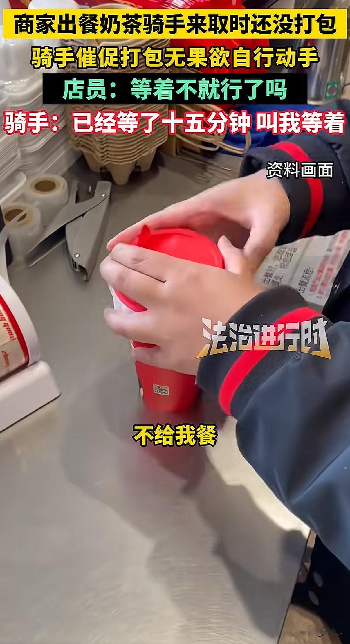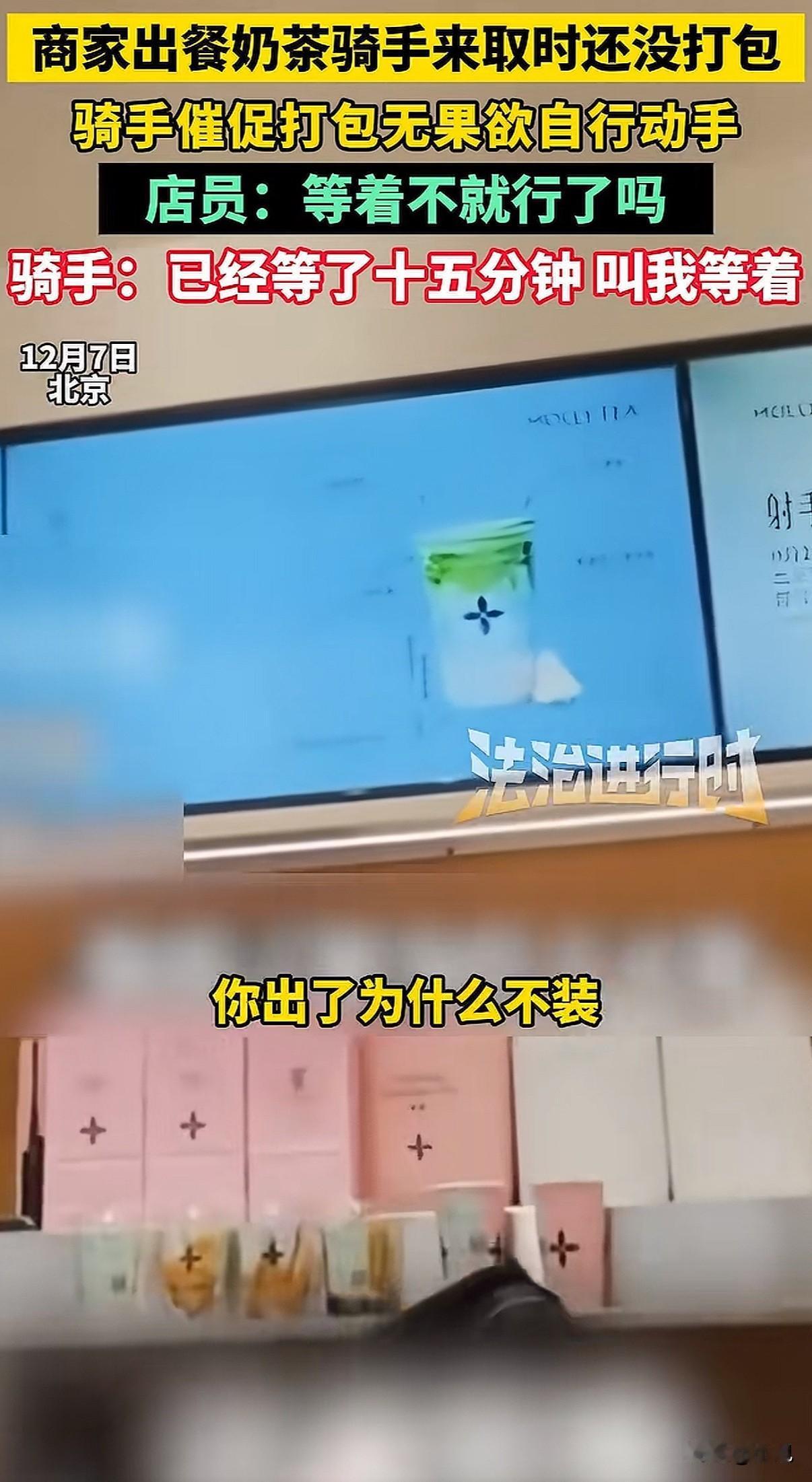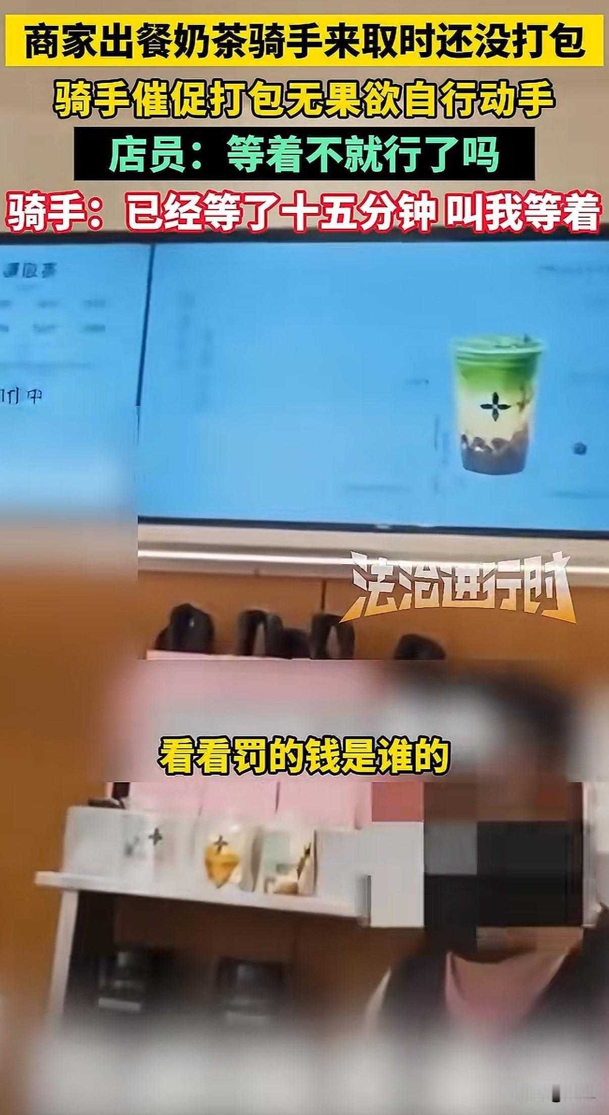 北京一家奶茶店,店员把做好的饮料往台子上一放,就是不打包。骑手急得火烧眉毛,她冷冰冰甩来一句:“能打包,但偏要晾着你。” 就这一句话,把整个外卖行业的遮羞布,全给扯下来了。 事情发生在12月7号,北京茉莉奶白西三旗万象汇店。骑手到店取餐,几杯饮料明明已经做好了,就晾在操作台上。十分钟过去了,店员跟没看见一样。 骑手忍不住了,问能不能打包。他怕啊,下一单又要超时了,一单罚好几十,这一天可能白干。 店员什么反应呢?不仅不理,骑手说那我自己打包行不行,她一把将饮料抢回去。然后就是那句充满挑衅的话:“罚钱算谁的?”“能打包,但偏要晾着你。” 有骑手拍下了视频。画面里,店员那种无所谓、甚至带着点故意的冷漠,和骑手在旁边干着急的样子,对比太强烈了。网上一下子就炸了,很多人问:都是辛苦赚钱的人,你哪来的优越感? 后来这家店关门停业了。但这件事,绝不只是两个人吵架那么简单。 它像一个口子,让我们看到外卖系统里,商家和骑手是怎么被逼得互相伤害的。 商家也有商家的压力。平台有个规则,出餐太慢,会被降低店铺的曝光率,那就没单子了。为了不被罚,很多店会用一个“神器”:虚假点出餐。 就是餐根本没做好,先在系统里点“已出餐”。这样一来,平台不罚他们了,压力全部转嫁到骑手头上。 骑手接到单,火急火燎跑到店里,结果东西根本没做好,只能干等。时间一分一秒过去,他后面所有订单都可能像多米诺骨牌一样,全部超时。 骑手能申诉吗?能,但很难。他得自己录视频证明是商家出餐慢,费时费力。更怕的是,这次申诉了,下次商家可能直接拉黑他,不给他餐,那他还怎么在这片区域跑? 可要是不申诉,超时罚款就来了。一单可能罚订单价的百分之好几十,还可能影响后续派单的质量。 你看,这就成了一个死循环。平台用算法和规则追着两边跑,商家和骑手为了自保,就只能把对方当成敌人。 店员故意晾着那杯奶茶的时候,她可能也在发泄对系统的怨气,只是矛头对准了眼前更弱势的骑手。骑手崩溃催促的时候,他抗争的也不是这一个店员,而是背后那套让他喘不过气的计时系统。 最后,两个都在底层挣扎的人,却拳脚相向。这才是最让人无力的一幕。 这件事里没有赢家。骑手的时间被耽误,心情被破坏;店员丢了工作,店铺声誉受损;平台看似置身事外,但积累的怨气,终会反噬整个系统。 它让我们看清,当系统只追求效率和数字,而忽视人的处境和尊严时,会发生什么。那些冰冷的规则,如何把人逼到角落,如何让同样辛苦的普通人,彼此竖起高墙。 一句“偏要晾着你”,晾出的是整个行业的疲惫与扭曲。