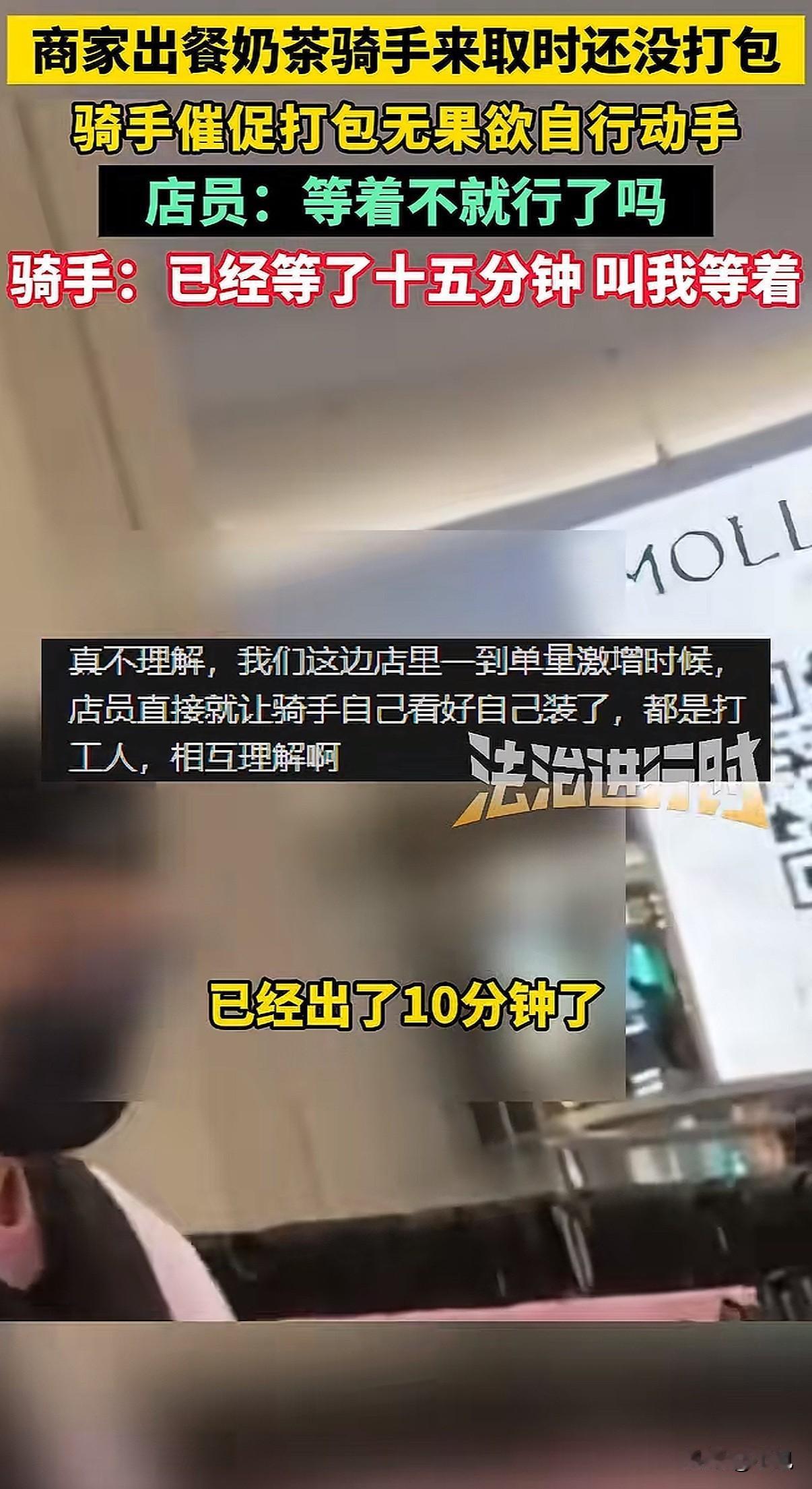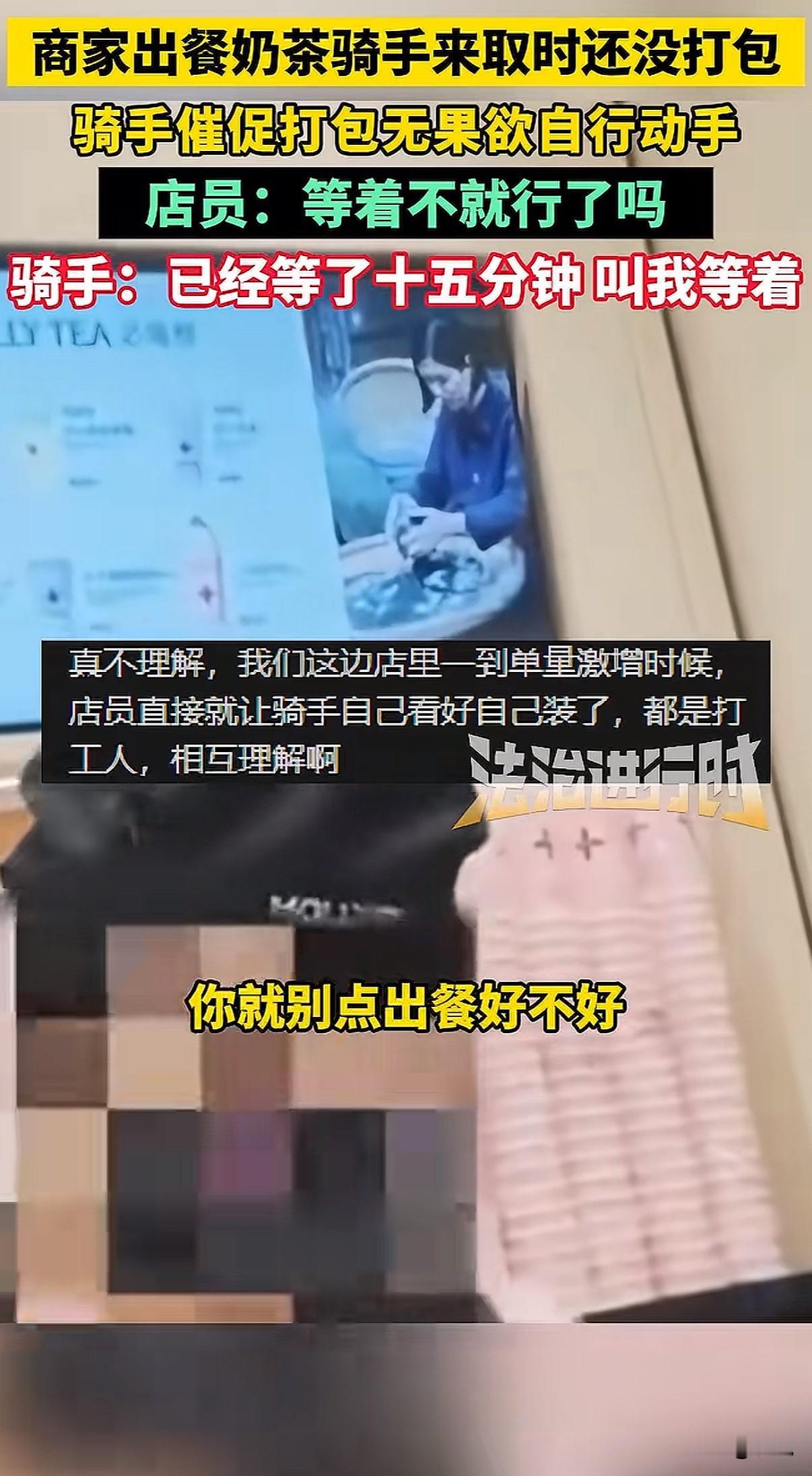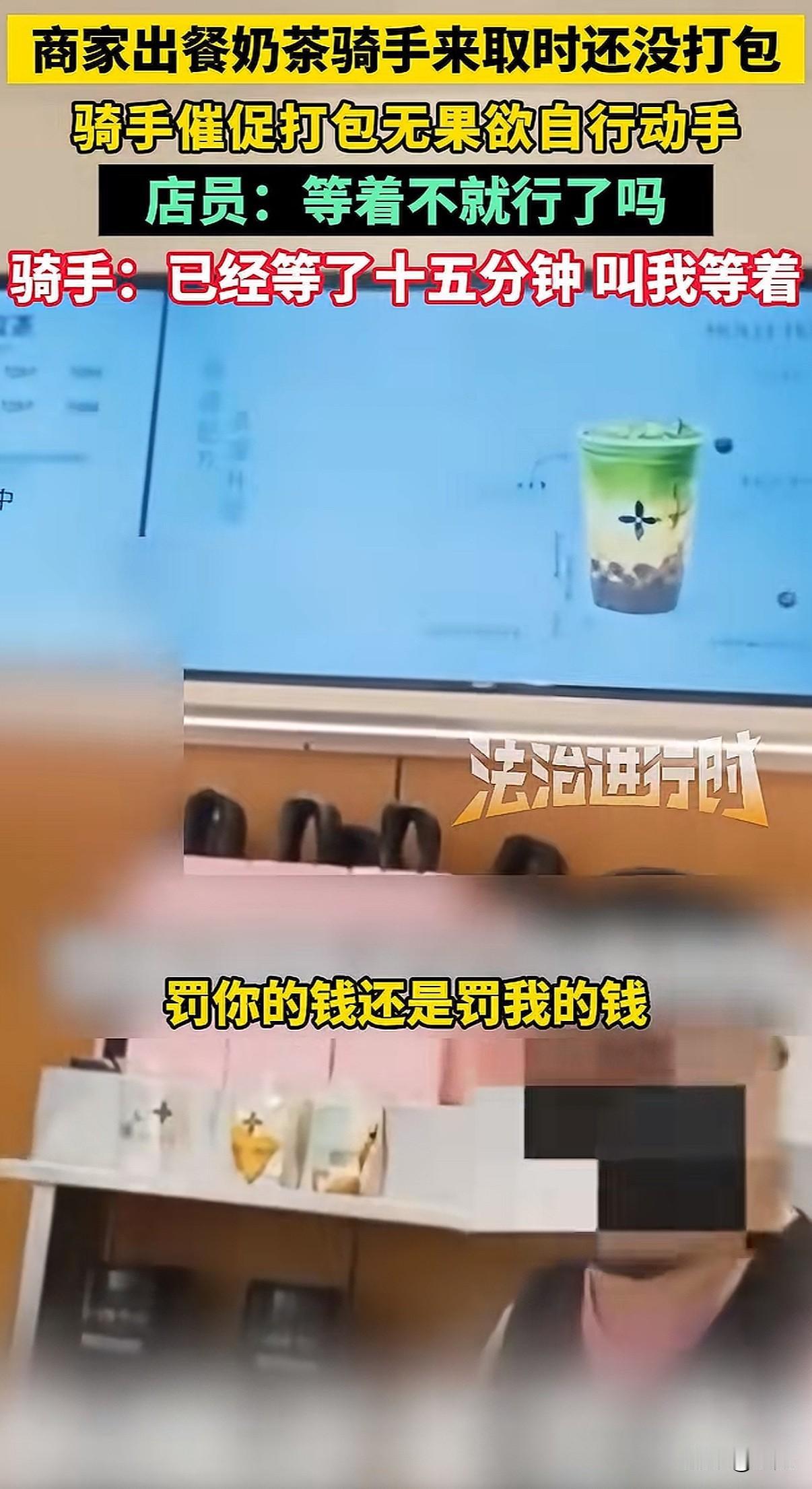 北京一家奶茶店,店员把做好的饮料往台子上一放,就是不打包。骑手急得火烧眉毛,她冷冰冰甩来一句:“能打包,但偏要晾着你。” 就这一句话,把整个外卖行业的遮羞布,全给扯下来了。 事情发生在12月7号,北京茉莉奶白西三旗万象汇店。骑手到店取餐,几杯饮料明明已经做好了,就晾在操作台上。十分钟过去了,店员跟没看见一样。 骑手忍不住了,问能不能打包。他怕啊,下一单又要超时了,一单罚好几十,这一天可能白干。 店员什么反应呢?不仅不理,骑手说那我自己打包行不行,她一把将饮料抢回去。然后就是那句充满挑衅的话:“罚钱算谁的?”“能打包,但偏要晾着你。” 有骑手拍下了视频。画面里,店员那种无所谓、甚至带着点故意的冷漠,和骑手在旁边干着急的样子,对比太强烈了。网上一下子就炸了,很多人问:都是辛苦赚钱的人,你哪来的优越感? 后来这家店关门停业了。但这件事,绝不只是两个人吵架那么简单。 它像一个口子,让我们看到外卖系统里,商家和骑手是怎么被逼得互相伤害的。 商家也有商家的压力。平台有个规则,出餐太慢,会被降低店铺的曝光率,那就没单子了。为了不被罚,很多店会用一个“神器”:虚假点出餐。 就是餐根本没做好,先在系统里点“已出餐”。这样一来,平台不罚他们了,压力全部转嫁到骑手头上。 骑手接到单,火急火燎跑到店里,结果东西根本没做好,只能干等。时间一分一秒过去,他后面所有订单都可能像多米诺骨牌一样,全部超时。 骑手能申诉吗?能,但很难。他得自己录视频证明是商家出餐慢,费时费力。更怕的是,这次申诉了,下次商家可能直接拉黑他,不给他餐,那他还怎么在这片区域跑? 可要是不申诉,超时罚款就来了。一单可能罚订单价的百分之好几十,还可能影响后续派单的质量。 你看,这就成了一个死循环。平台用算法和规则追着两边跑,商家和骑手为了自保,就只能把对方当成敌人。 店员故意晾着那杯奶茶的时候,她可能也在发泄对系统的怨气,只是矛头对准了眼前更弱势的骑手。骑手崩溃催促的时候,他抗争的也不是这一个店员,而是背后那套让他喘不过气的计时系统。 最后,两个都在底层挣扎的人,却拳脚相向。这才是最让人无力的一幕。 这件事里没有赢家。骑手的时间被耽误,心情被破坏;店员丢了工作,店铺声誉受损;平台看似置身事外,但积累的怨气,终会反噬整个系统。 它让我们看清,当系统只追求效率和数字,而忽视人的处境和尊严时,会发生什么。那些冰冷的规则,如何把人逼到角落,如何让同样辛苦的普通人,彼此竖起高墙。 一句“偏要晾着你”,晾出的是整个行业的疲惫与扭曲。