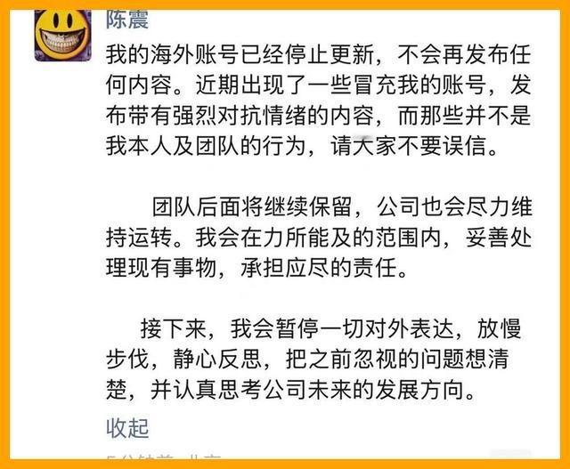 陈震宣布海外账号停止更新,团队保留。员工是无辜的,好在陈震有这个底气对他们负责。谁能想到在顶流的公司,会遭遇如此重创,身上有房贷和车贷的员工可太难受了,心疼一波~