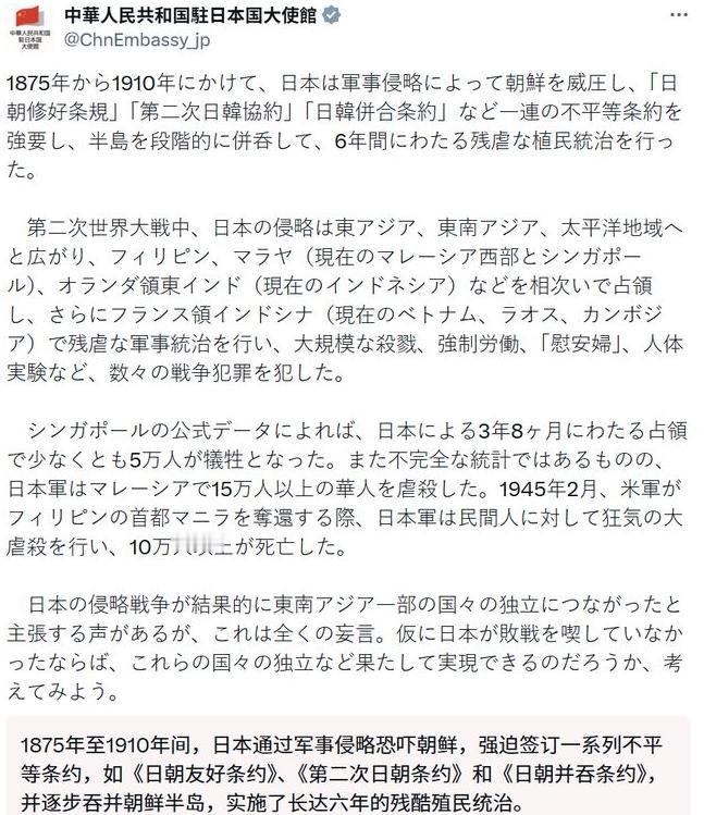 驻日大使馆列举日本灭绝人性屠杀奴役亚洲国家人民罪行! 12月5日,中国驻日本大使馆发文列举日本对亚洲国家人民犯下的滔天罪行。 一提起日本鬼子的暴行,南京大屠杀是中国人永远的心头刺,这根本是一场有预谋的屠杀盛宴。 1946年远东国际军事法庭和南京军事法庭都下过铁判决,确认这场屠杀整整持续了六个星期。 当时慈善团体收埋的尸体就有近20万具,日军自己怕留下证据,偷偷烧掉、埋掉的还有15万具,遇难同胞总数早超过30万了。 那时候的南京城,大街上尸体堆得像小山,秦淮河的水都被血染红,河面上漂着的,有老人也有婴儿。 日军把几岁的孩子挑在刺刀尖上戏耍,对着怀孕的妇女狠心地剖开肚子,这些不是传说。 如果说南京大屠杀是明刀明枪的残忍,那731部队的罪恶,就是藏在白大褂里的阴毒。 这群披着医生外衣的恶魔,在哈尔滨平房区建了世界最大的细菌战基地,把抓来的活人叫做“马路大”,意思就是可以随便切割的木头。 他们的实验根本没把人当人看:寒冬里把人的手脚泡进冰水冻僵,再用开水浇,看着皮肉一块块脱落;给人注射鼠疫病菌,全程记录受害者从发病到痛苦死去的过程。 更缺德的是,他们还把这些致命细菌用到战场上,1942年在浙江衢州,用带菌的馒头、米粿毒害百姓,导致当地30多万人发病,5万多人丧命。 在云南、山东投下的霍乱菌,更是夺走了几十万平民的性命。 最让人愤怒的是,战后美国为了抢他们的实验数据,居然包庇了石井四郎这些战犯,让他们带着沾满中国人鲜血的资料,舒舒服服地回了美国德特里克堡实验室。 千万别以为这些暴行只发生在中国,整个亚洲都被日本侵略者祸害惨了。一百年前的“东瀛惨案”里,近800名在日中国人和6000多名朝鲜人,被日本军警活活打死。 二战时在菲律宾,日军制造了臭名昭著的“巴丹死亡行军”,7.5万美菲战俘被强行押着走120公里,没水没粮,掉队就枪杀,六天下来死了1.5万人。 到战争结束时,当初的战俘只剩7500人活着。 在缅甸修“死亡铁路”时,他们强征几十万劳工,近10万人死于饥饿、毒打和疾病,死亡率快到40%。 这群侵略者就像没人性的野兽,走到哪就抢到哪、杀到哪,把整个亚洲当成了他们的施暴场。 最让人没法容忍的是,都到今天了,日本右翼还在干着翻案的勾当。 他们修改教科书,把“侵略华北”改成“进出华北”,把南京大屠杀轻描淡写地叫“南京事件”,甚至说“受害人数尚无定论”。 一次次去参拜供奉着甲级战犯的靖国神社,对受害者的索赔更是装聋作哑。 驻日大使馆这次发文,就是要撕开他们的假面具。 日本只有真正正视历史,给受害者一个真诚的道歉和赔偿,才能被亚洲人民原谅。要是还执迷不悟地美化侵略、篡改历史,只会被全世界唾弃。 作为中国人,我们记着这段历史,不是为了记恨,是为了警醒自己:国家强了,人民才能不受欺负。 我们要和全世界爱好和平的人一起,守住历史真相,那些妄图把黑的说成白的人,迟早会被钉在历史的耻辱柱上,而正义的声音,永远会在历史长河里回荡。