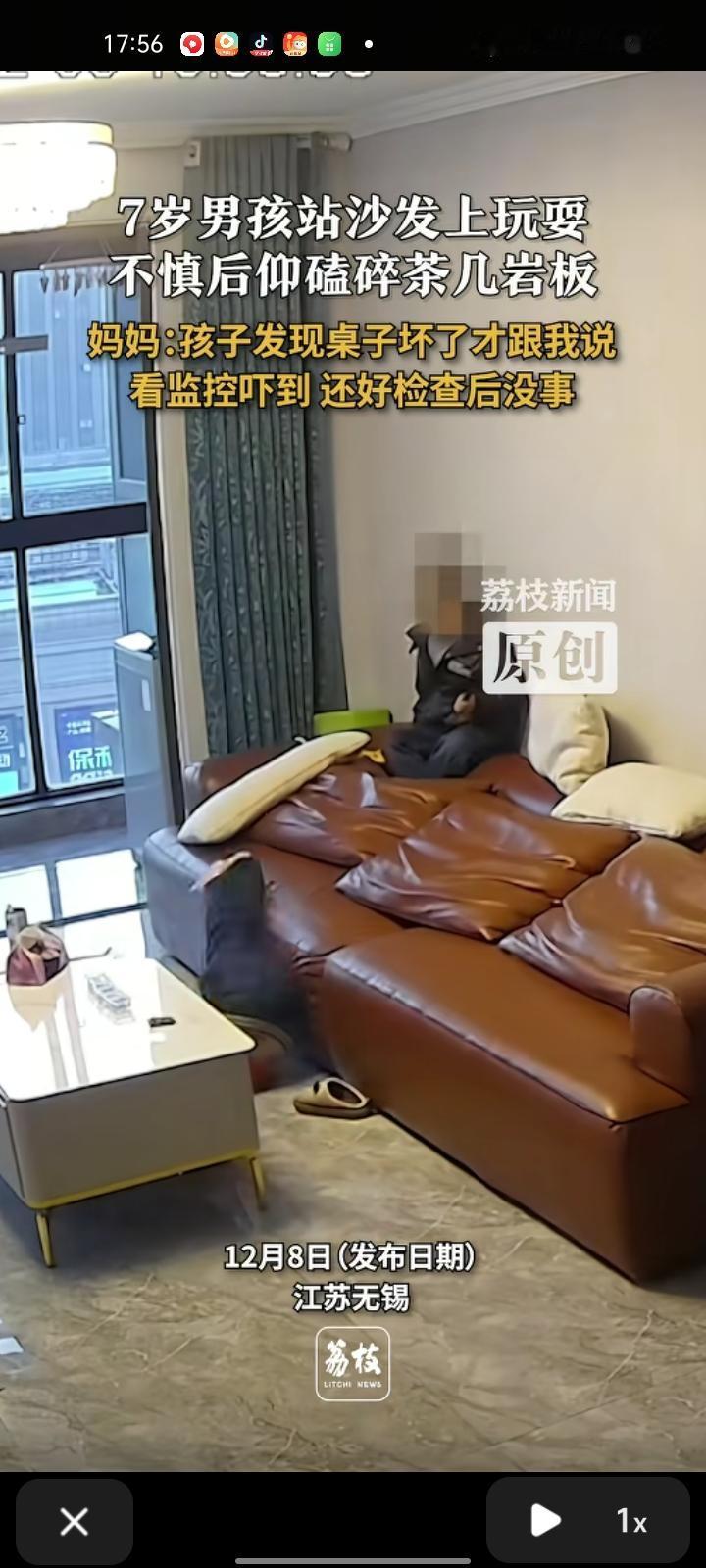 12月6日,江苏无锡。男孩在沙发上躺着玩耍,不慎后仰磕碎茶几岩板。 孩子妈妈孙女士表示,孩子可能是吓坏了不敢说,发现桌子坏了才跟我说,看了监控才发现摔得那么严重,吓得赶紧抱孩子去检查,孩子没事。