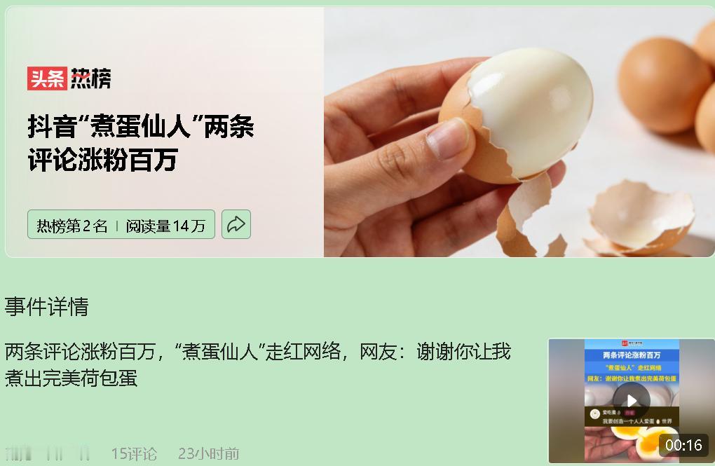 你肯定刷到过那个煮荷包蛋的视频。就一个普通人,盯着锅,笨拙却煮出浑圆的蛋。就这?一夜爆火百万粉。但说实话,这哪是厨艺赢了,这分明是戳中了咱们这代人心里那点不敢说的孤独和狼狈。 想想看,你试过煮蛋散成一锅汤吗?评论区那句“原来我三十年白活了”瞬间刷屏,不是因为人家技术多神,而是因为咱们都一样——生活里连个蛋都煮不好。这种“失败日常”才是真正的流量密码。 当所有网红都在晒精致大餐,他反手拍了个五毛钱成本的鸡蛋,反而炸出了全网共鸣:我就想简单吃口好的,别整那些没用的。 更狠的是,这视频提供的根本不是教程,是情绪。看着蛋慢慢成型,水波缓缓滚,简直比ASMR还治愈。网友说“看他煮蛋比我冥想半小时都有用”,大实话。现在谁还缺信息?缺的是下班后十分钟的放松。两条评论带火百万粉,本质上是一场集体玩梗,大家转发、吐槽、自嘲,都是在说:“看,不止我一个人这样。” 算法当然也推波助澜。平台就爱这种“零失败”、“手残必备”的标签,一抓一个准。为什么“煮蛋仙人”、“米饭仙人”能成?因为他们瞅准了年轻人既想活得精致又懒得折腾的矛盾——给你最省劲儿的解决方案。 所以普通人能学什么?第一,切口要小。别动不动就想教人“如何成功”,你就解决“如何五分钟煮好一颗蛋”这种具体尴尬,反而能成。第二,别怕不完美。专家高高在上教十年,不如仙人翻车那三秒真实。大家早腻了滤镜里的假精致,一点笨拙和真诚,才是现在最缺的。 说到底,下一个爆火的内容,可能就藏在你今天手忙脚乱的日常里。那些说不出口的小麻烦,才是流量埋得最深的矿。