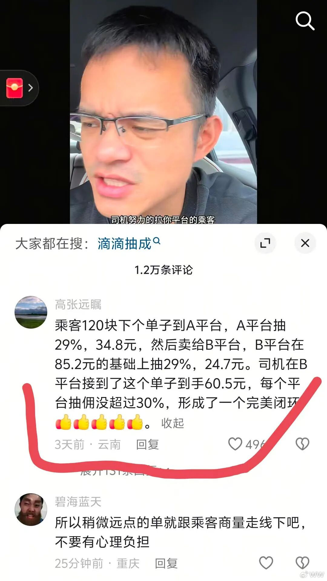 难怪有网友犀利评论道:“乘客120块下个单子到A平台,A平台抽29%,34.8元,然后卖给B平台,B平台在85.2元的基础上抽29%,24.7元。司机在B平台接到了这个单子到手60.5元,每个平台抽佣均没超过30%,形成了一个完美闭环。666!”