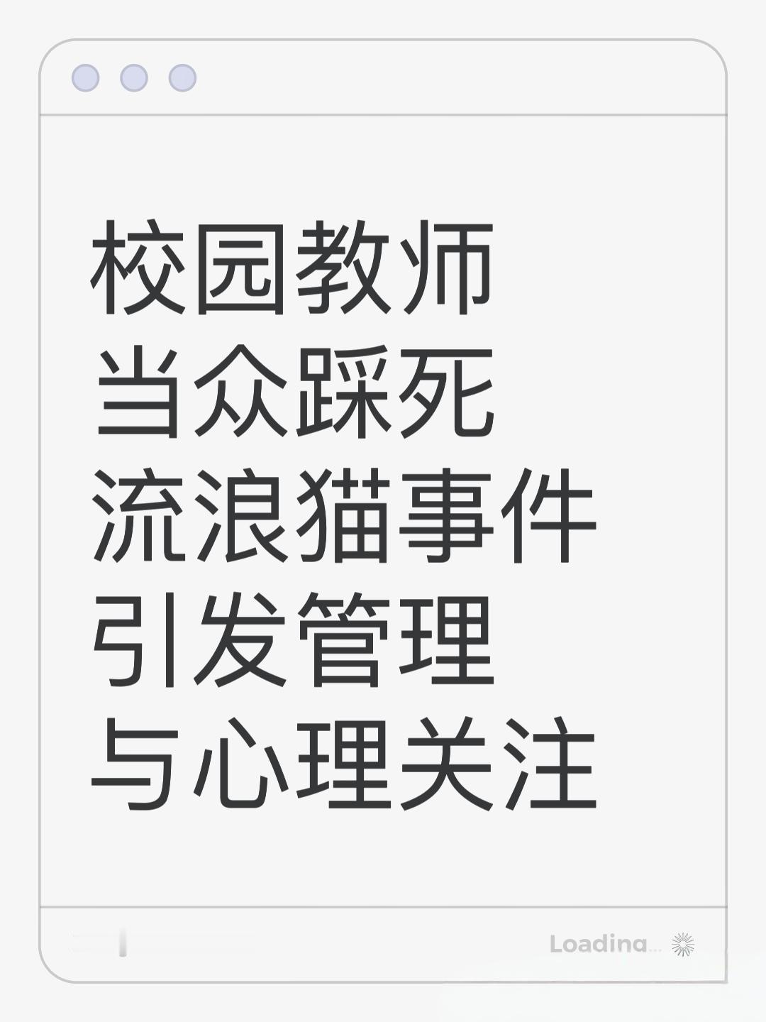 近日,一则中学教师当学生面踩死流浪猫的视频在网上引发热议,究竟是怎样的原因让这一幕发生在校园里? 近日,一段中学教师当学生面踩死流浪猫的视频在网络上引起广泛关注。视频中,一名体育教师因学生逗猫导致自己孩子被咬,竟当众将猫踩死,场面惨烈。该事件发生于湖南邵阳县第二高级中学,事后校方虽已对涉事教师提出批评,但仍引起了社会对校园管理和动物保护的关注。另一类似事件则发生在四川资中第一中学,该校教师同样因学生逗猫被咬,随后在学生面前踩死了那只猫。此类事件不仅伤害了动物,还可能对学生的心理造成负面影响。面对这样的争议,学校应加强管理,同时关注学生心理健康,避免类似事件再次发生。