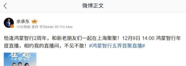 【五界齐聚:华为余承东官宣鸿蒙智行年度直播12月9日举行】鸿蒙智行将迎