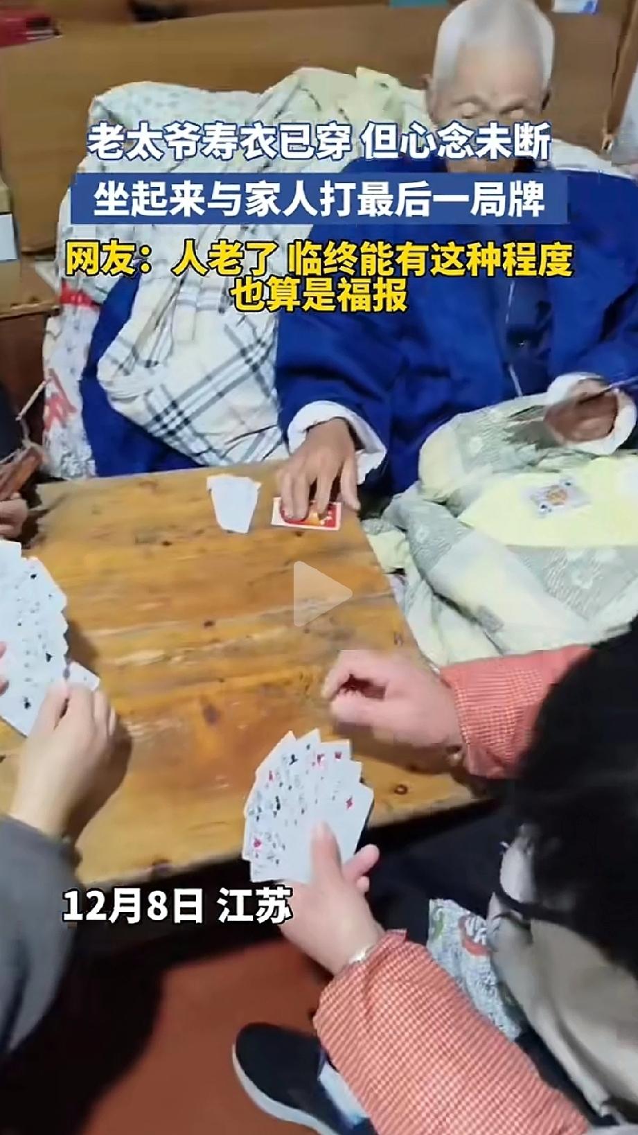 老太爷寿衣已穿,但心念未断,坐起来与家人打最后一局牌。 老太爷别看这么精神,其实是在强撑,只有他自己知道心里多么难受,寿衣提前穿身上。他怕麻烦家人,趁着自己还有口气,还是穿上吧!老人坚持陪家人玩最后一次牌,给家人留下深深的记忆! 家人围着老太爷各自看着手里的扑克,沉默不语,玩的是那么认真!多希望打牌的人数,一个不少!