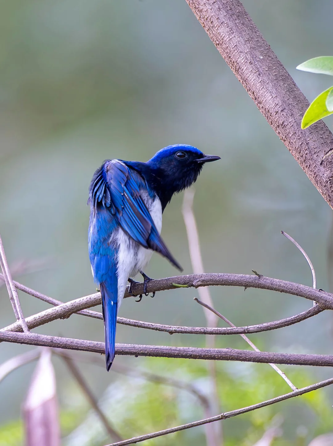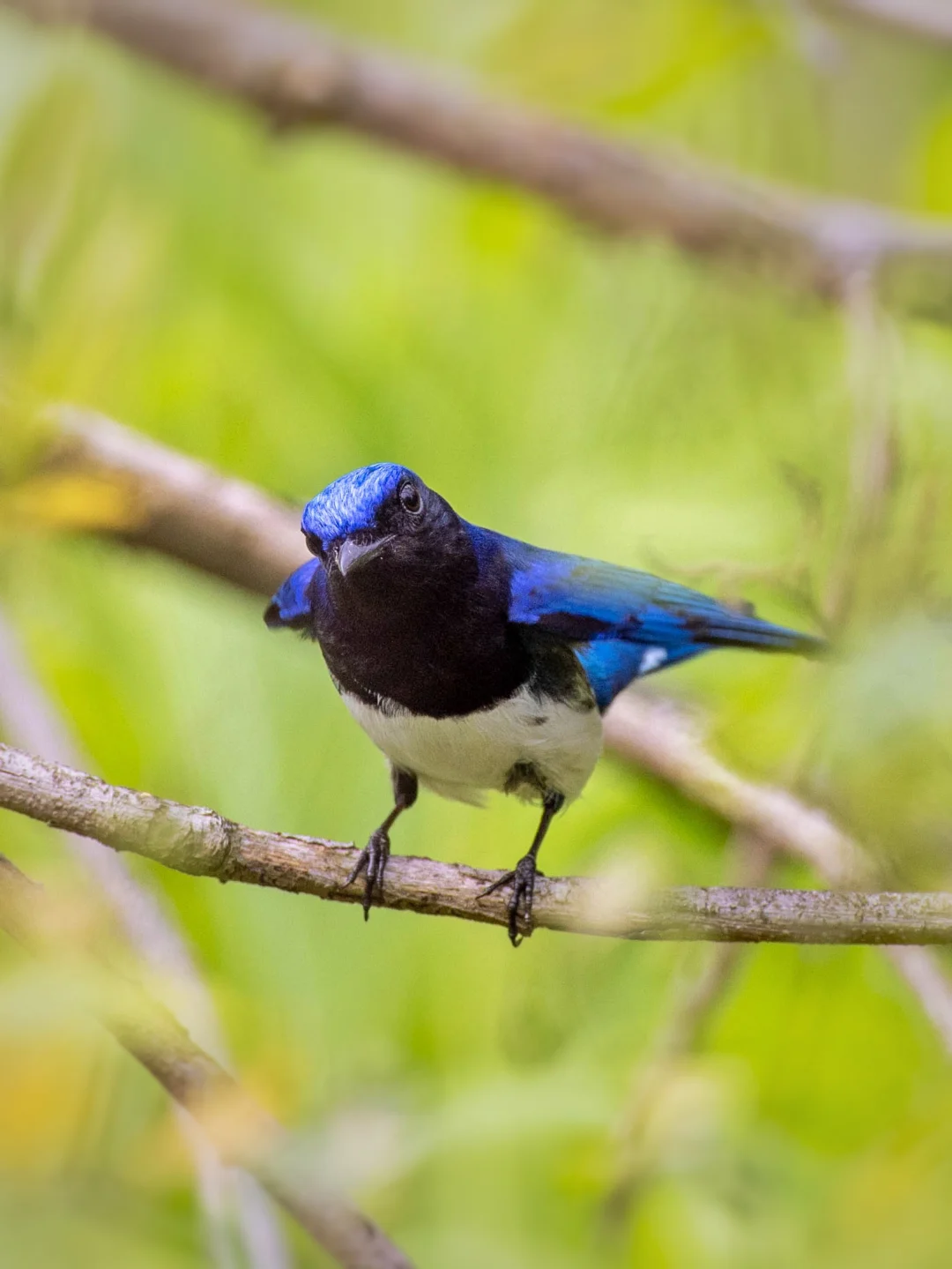 原创拍摄于2025.04 白腹蓝鹟,Blue-and-white Flycatcher,雀形目鹟科蓝鹟属。 白腹蓝鹟,在台湾省有人称之为“白腹琉璃”,香港也有称之为“蓝电”,当你真正在树林里看到它的时候,你就会发现这些名字真的还挺贴切的,因为真的就是树林里的一道蓝光。雄鸟成鸟头部颈背都是靓丽的蓝色,下额至胸是黑色,腹部白色。雌鸟颜色较暗淡。 现在正是迁徙季节,各种鹟鹟齐聚深圳,清晨时分,到深圳的一些森林公园,凤凰山,铁仔山,都很有机会见到它们。