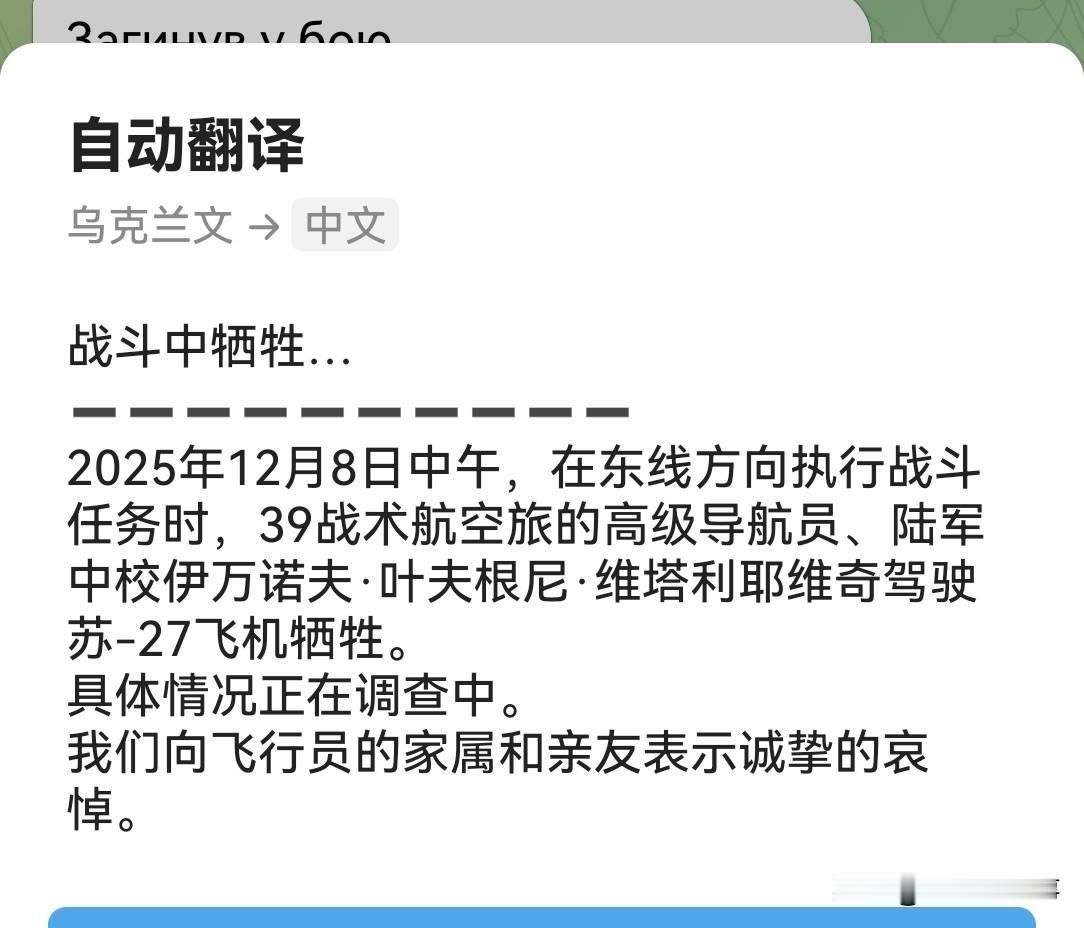 乌克兰空军报告称,2025年12月8日中午,乌克兰空军第39战术航空旅的一名高级领航员伊万诺夫·叶夫根尼·维塔利耶维奇中校在驾驶苏-27战斗机执行东线方向的战斗任务时丧生(该战斗机要么失踪,要么被击落了)。 具体情况正在调查中。